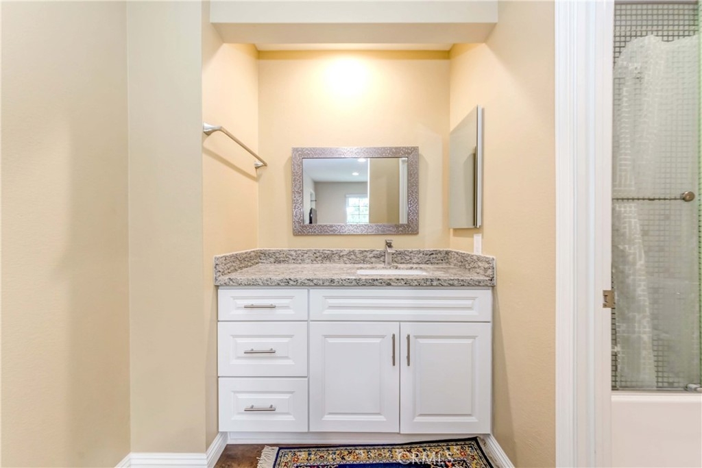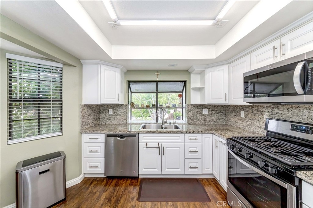 This is the Largest Unit in this Beautiful Well Maintained Gated Community with 3 Bedrooms (2 are Master Suites with Walk-In Closets), 3 Baths, and 2 Car Direct Access Garage. Upgrade interior fully all 2018-2019 and Remodeled in change the HVAC system, floor, all Kitchen, blind and all bathroom. Termite clearance(2021 Dec. full). Very Spacious Townhome Features: Central A/C, Wood Laminate Flooring Throughout, Dual Pane French-Style Windows & Sliders, 2 Bay Windows, Skylight, Recessed Lighting, Crown Molding, and Designer Paint. It Boasts a Large Open Living Room with Raised Hearth Fireplace with Cable Connections Above and Slider to a Balcony/Patio, Full-Size Formal Dining Room with Built-In Wine Bar, and an Upgraded Kitchen with Granite Countertops, Laminate wood Flooring, Stainless Appliances, and a Bay Window Eat-In Breakfast Nook. Also on the Main Level is a Bedroom and Full Bathroom. Upstairs are 2 Master Suites each with Custom Organized Walk-In Closets. One Bathroom is Upgraded with Marble Tile Countertop and a Vessel Sink. An Inside Laundry Area is on the Upper Floor with Natural Light. Enjoy the Wonderful Amenities this Community has to Grounds with Walking Paths, Association Pool, Spa, and Clubhouse. It is Ideally Located Steps to the Park & Strawberry Festival, Across the Street from Community Center Park, GG Main Library, Coastline Community College, and Near Historic Main Street with Many Stores and Restaurants. Also Short distance to the 22 & 5 freeway, Beach, Disneyland and Truly a Great Place.