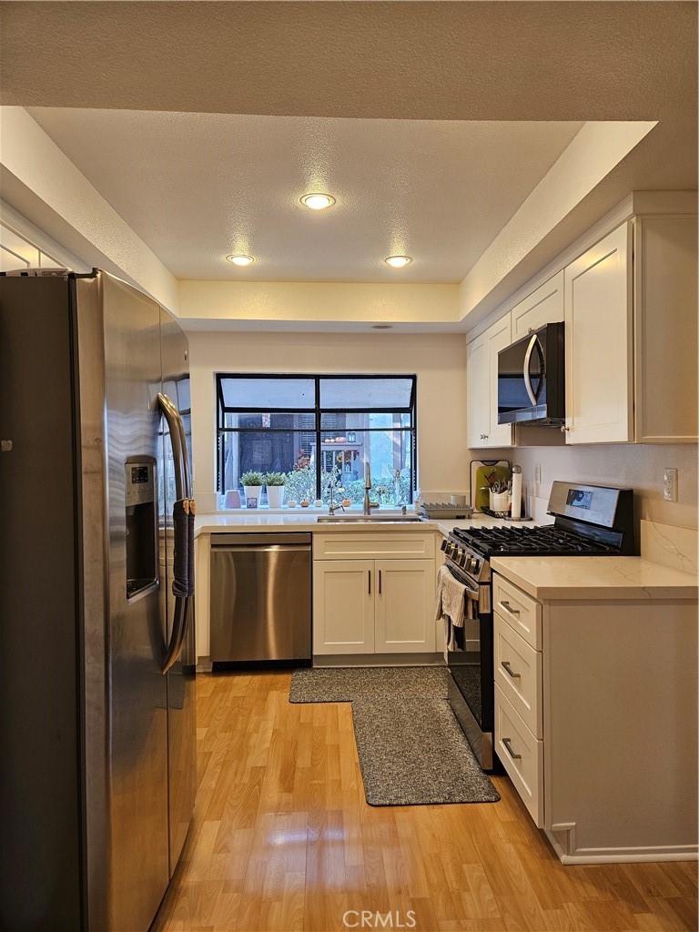 Welcome to your dream home! This bright and airy 4 bedroom, 3 bathroom townhouse located in the gated community of Acacia Park offers a panoramic view of Village Green Park! The home was well maintained over the years and recently upgraded to a modern kitchen that features brand new cabinets, quartz countertop, stainless sink, range, dishwasher, and microwave, while fresh paint downstairs creates a warm and inviting atmosphere. The open living room is complete with a fireplace and adjacent is a dining room with shutter windows. The main level also features a bedroom, full bathroom, and access to the two car garage. Upstairs includes a primary suite with walk-in-closet, bathroom, and an amazing view of the park. There are also two additional bedrooms, a full bathroom, and a convenient laundry room. The association includes a community pool, spa, clubhouse and ample guest parking. Enjoy the convenience of being within distance to the Garden Grove main library, coffee shops and fantastic restaurants down historic Main Street. This prime location is also a short distance to the 22 and 5 freeways, the beach, and amusement park!