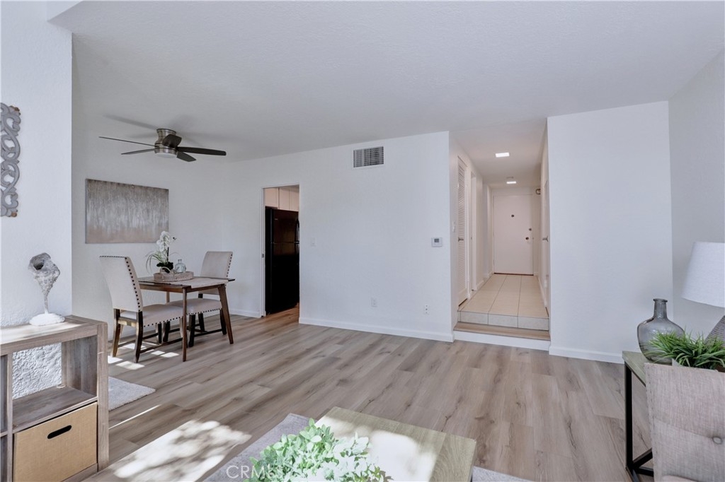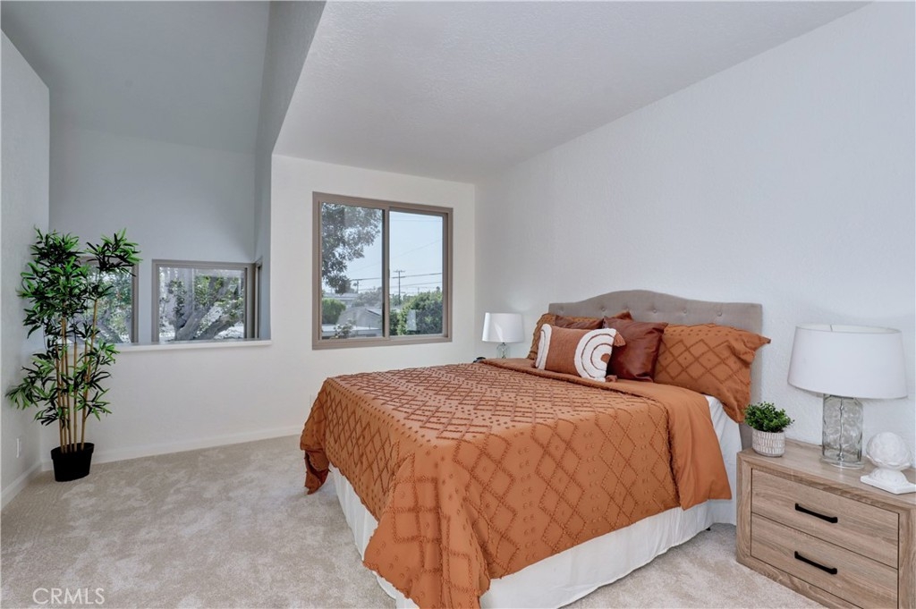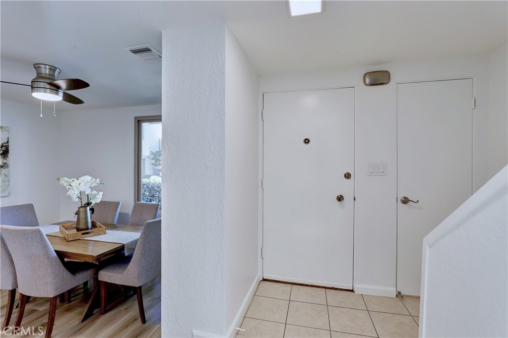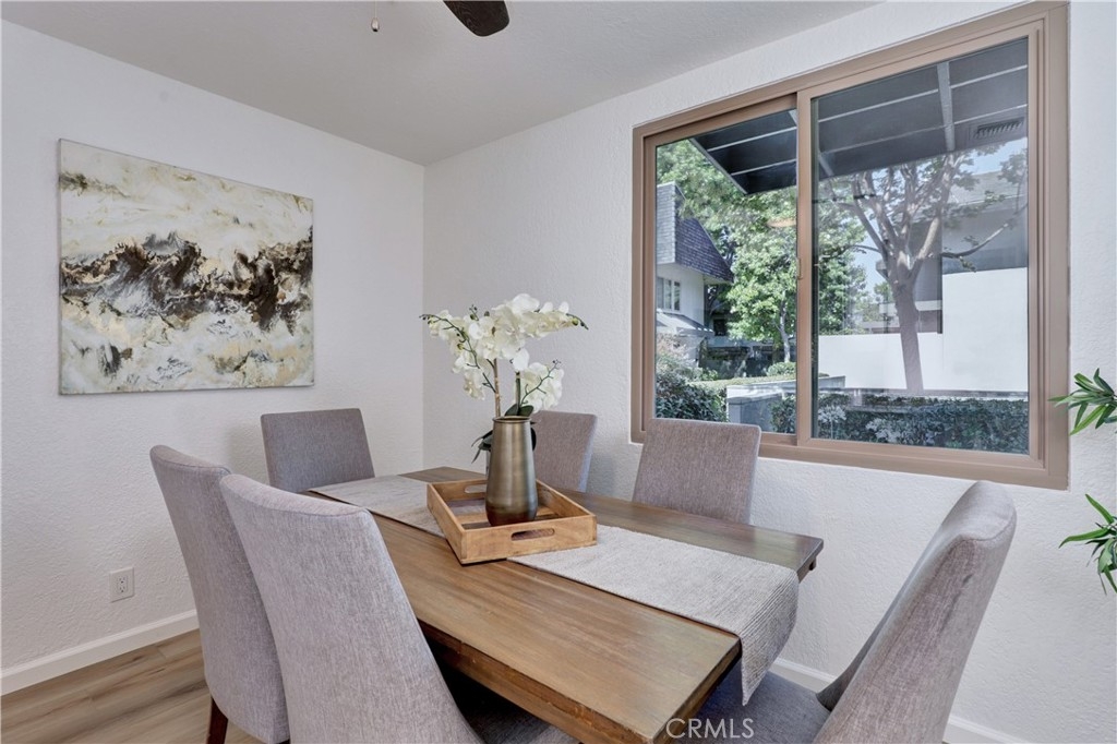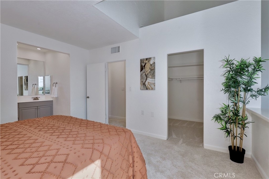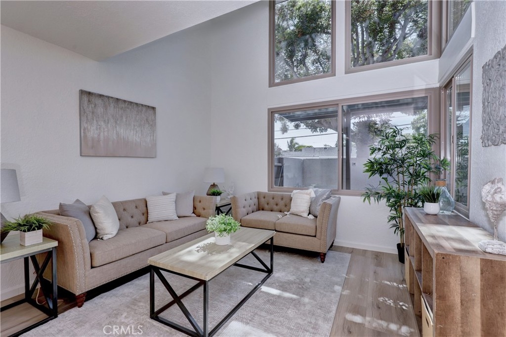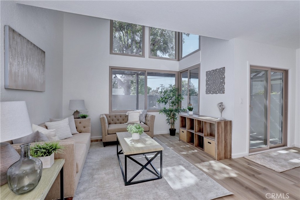 Welcome to this beautifully updated 2-bedroom, 2-bathroom corner-unit condo offering comfort, style, and convenience. This two-story home features soaring ceilings in the family room, creating a bright and airy atmosphere filled with natural light. Recent upgrades include new laminate flooring, plush new carpet, Corian kitchen counters, and modernized bathroom vanities. This community was created by renowned architect Frank Gehry. The spacious primary bedroom boasts a walk-in closet and a private en suite bathroom. Enjoy the convenience of inside laundry and an open, functional layout perfect for everyday living. Community amenities include a sparkling pool and relaxing spa, with assigned parking spot. Ideally located near shopping, dining, and major freeways—this home combines tasteful updates with an unbeatable location. Don’t miss this opportunity!