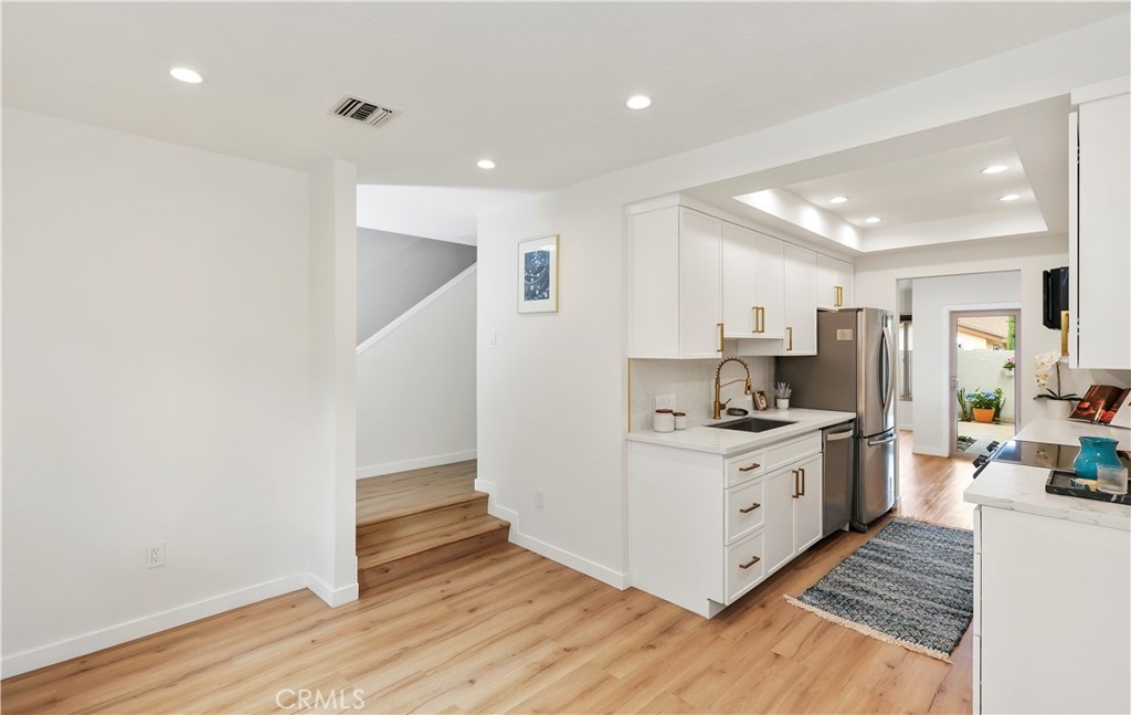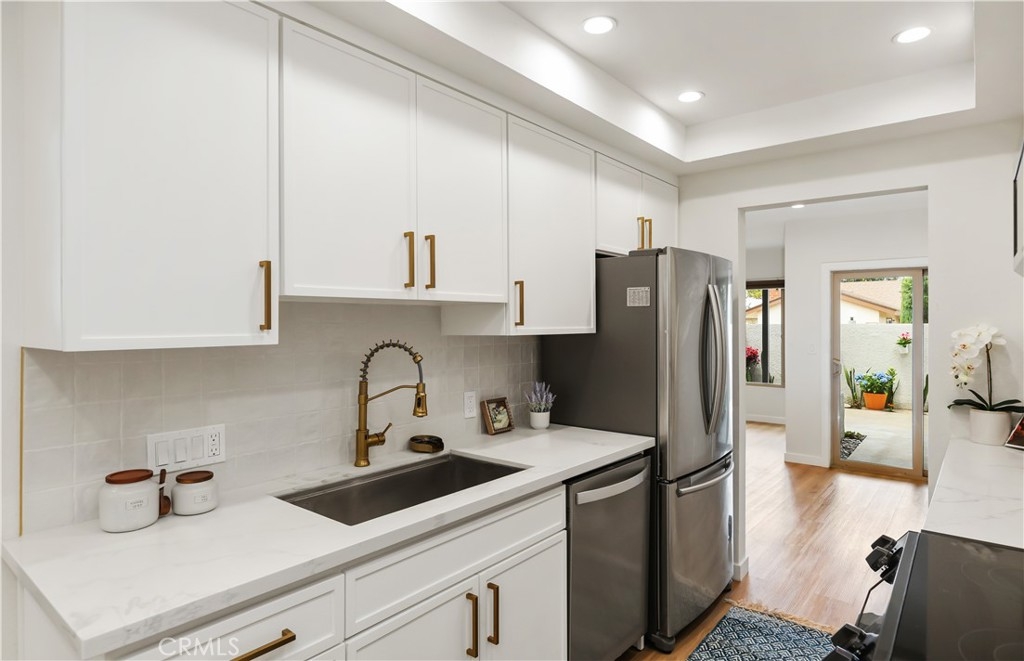 Experience modern living in the gated community of Bixby Green, designed by world-renowned architect Frank Gehry. This 3 bed, 2.5 bath condo offers 1,386 sq ft of open-concept space with a private patio perfect for entertaining. The remodeled kitchen features soft-close cabinetry, quartz counters, a built-in glass rinser, and a sensor-activated faucet. All three bathrooms have been fully remodeled. Additional upgrades include vinyl flooring downstairs, recessed lighting with adjustable color tone, and a Nest thermostat. The spacious primary suite includes vaulted ceilings, a walk-in closet, and a beautiful walk-in shower. Enjoy recent HOA upgrades: new roofing, exterior paint, concrete work, garage storage, and updated pool/spa areas. HOA covers water, trash, and sewer. Close to top-rated GGUSD schools, shopping, dining, and 91/5/22 freeways. Don’t miss this rare opportunity!