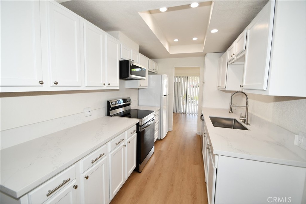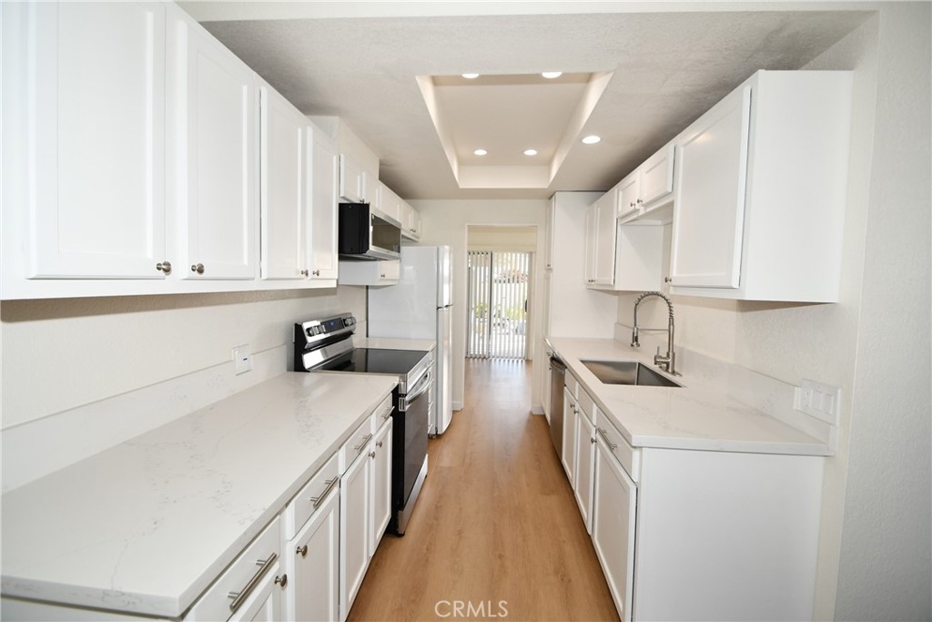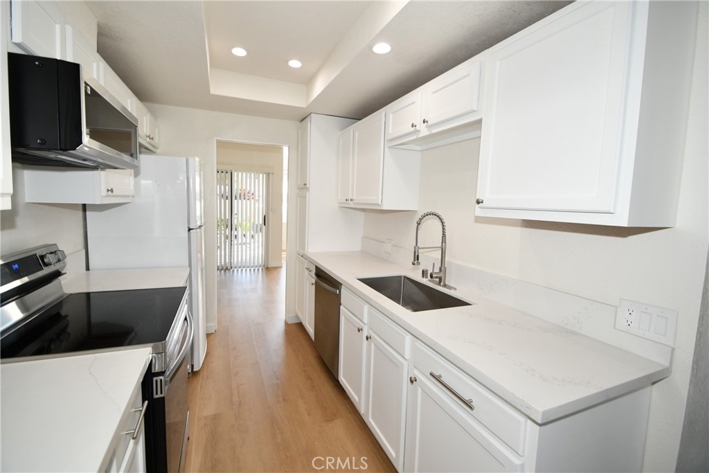 Welcome to 12583 Cluster Pines Road, where your search for the perfect home ends. This meticulously renovated 2-bedroom, 2.5- bathroom unit boasts over 1300 sq. feet of living space, making it a rare gem in the market. Step inside to discover a completely updated interior featuring fresh paint, new laminate flooring ,new carpet in the bedrooms and modern bathrooms. The kitchen is a true standout, showcasing new quartz countertops, refinished cabinets, a new stainless steel farm sink, and new stainless steel appliances. The vaulted ceilings and extensive windows flood the space with beautiful natural light, creating an inviting ambiance throughout the day. Outside, the patio offers a refreshing breeze, perfect for enjoying the nice So Cal evenings. Up the stairs are the 2 bedrooms each with private bathrooms. The primary suite features high ceilings, large walk in closet, and completely remodeled large bathroom with a vanity and walk-in shower. The second bedroom is also with private completely remodeled bathroom and his and her closets.The property is part of the esteemed Bixby Green Community designed by the world-renowned architect Frank Gehry ensuring a high-quality living experience. This is a home that will not disappoint, especially having your in-unit laundry, central heat and AC and 2 conveniently located parking spaces. The Bixby Green complex features a pool and spa as well as a courtyard with mature trees. This community also features guest parkings and is conveniently located near 22, 405, & 605 freeways as well as local shopping, and access to highly rated schools. Close by Disneyland and Knotts Berry Farm for the amusement park enthusiasts.This lovingly remodeled home is a must see!