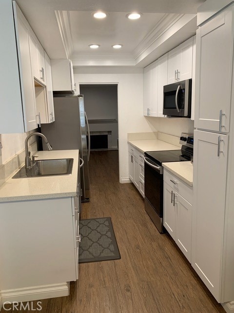 Beautifully remodeled 2 bed 3 bath condo located in the well maintained community of Bixby Green in Garden Park. This home features a newly remodeled kitchen with white cabinets and cortz countertops, Stainless steel appliances. Recessed lighting & crown molding throughout, high vaulted ceilings, Vynil laminate flooring throughout the house. Cozy fireplace Off of the living room which connects to a private patio with cover. Upstairs you will find two master bedroom suites. One with vaulted ceiling, mirrored wardrobe and an on suite master bath with vanity and a walk in shower. The secondary master bedroom has a full bath with a tub and shower. This unit also comes with indoor laundry and central A/C and heating. Parking is conveniently located at the bottom of the stairs with 3 reserved spots (third spot with small fee). one spot is covered with storage.This community is fully gated and secured for added comfort. Located in an excellent school district across the street of Pacifica high school which is rated as one of California's distinguished schools. Great neighborhood, close to shopping centers and fwys for easy access.