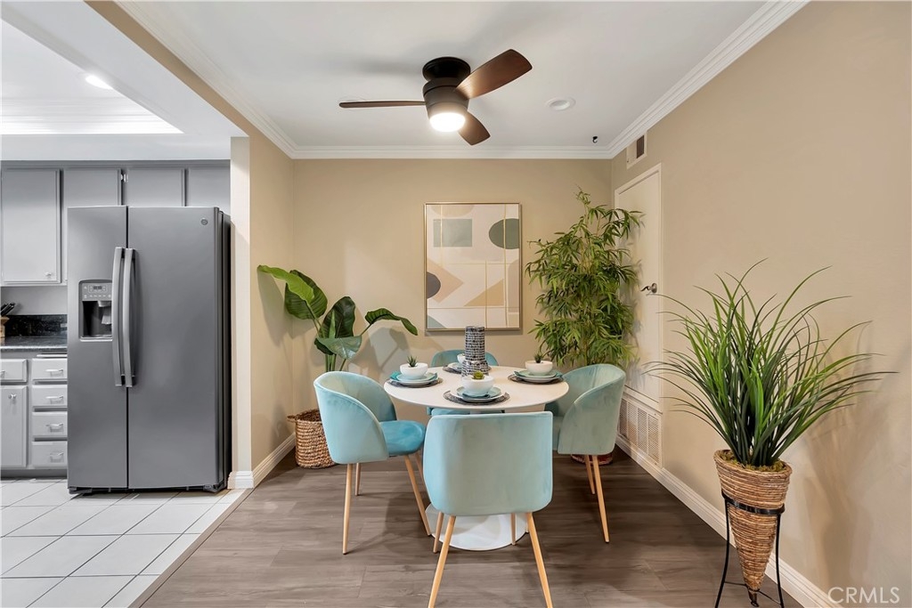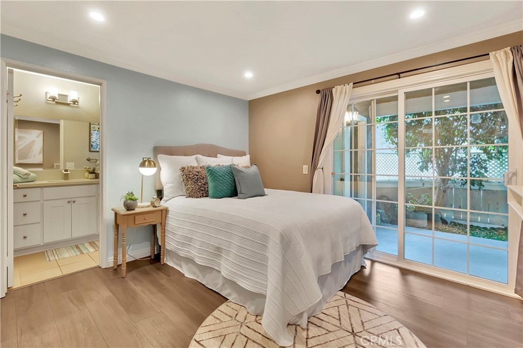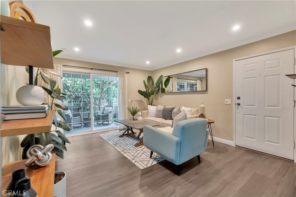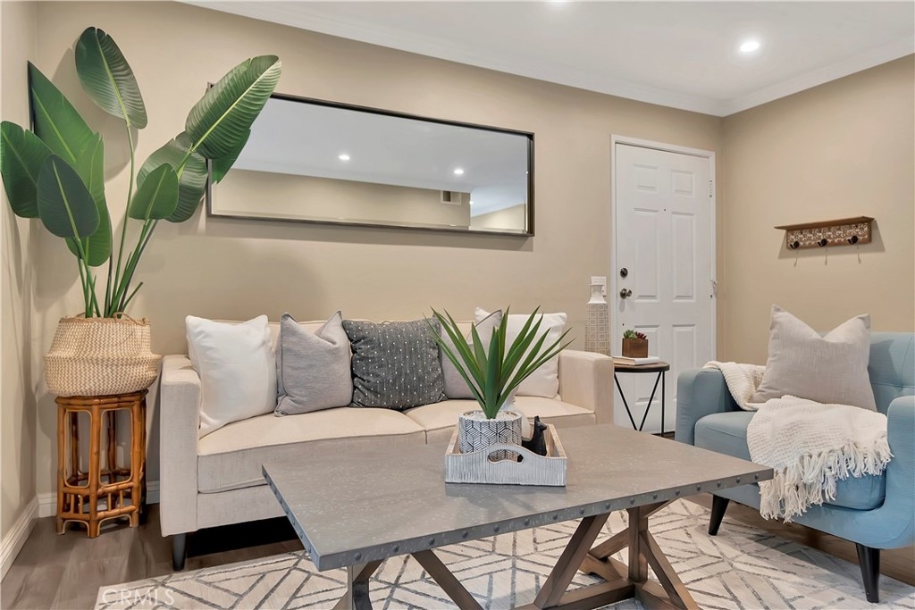 Model perfect upgraded end unit. First floor, one level home in the beautifully landscaped gated community of Brookhaven Circle in the heart of Garden Grove. Spacious 2bed/2bath unit features contemporary laminate flooring in hallway, dining room, living room and bedrooms. Updated kitchen with newer appliance suite that includes a gas range/oven, refrigerator, dishwasher and microwave. Recently installed, new water heater and Smart Thermostat. Tastefully painted in subtle neutral tones and accented with crown molding, scraped ceilings and recessed lighting throughout. Access to patio from the guest bedroom or from the living room through large sliding dual paned glass doors. Guest bedroom has en suite updated bathroom. Spacious laundry room is off of the private patio and offers new front load washer and dryer. Pool and spa have convenient access. Detached 2 car garage has extended storage space. Brookhaven Circle HOA is a very well maintained complex. Monthly hoa dues include water, trash, landscaping and exterior maintenance and repairs. Also included; pool, spa and earthquake insurance! Conveniently located down the street from the new Sprouts market and recently opened Habit Burger. Nearby to Historic Main Street which has great dining and entertainment and also holds Classic Car shows every Friday night along with a wonderful Farmer's market every Sunday morning. Not far is Great Wolf Lodge and Disneyland, Costco, Walmart, Marshall's. Also close by, Award winning Garden Grove Unified School District.
