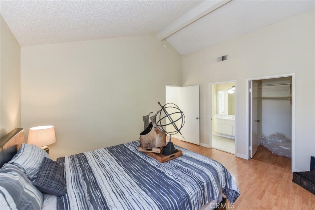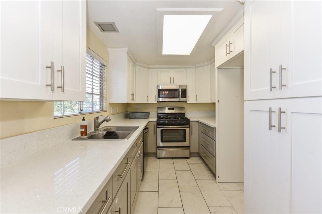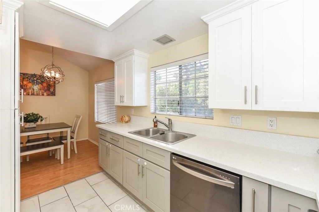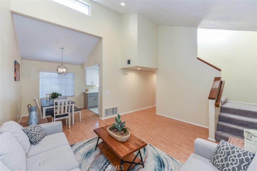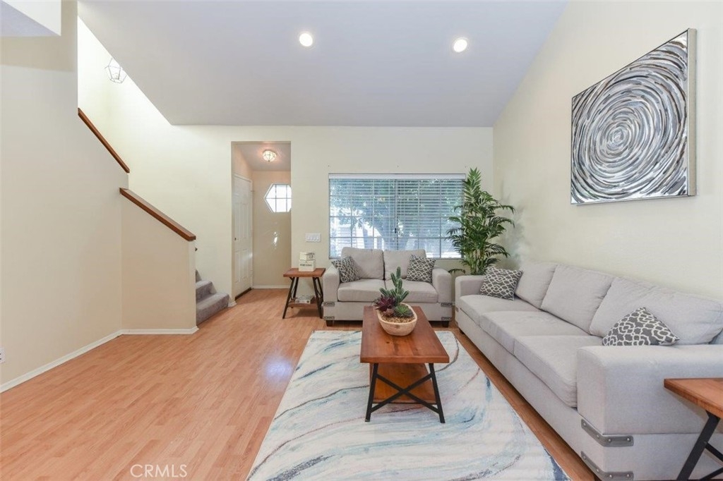 WELCOME TO BROOKHAVEN CIRCLE! PICTURE PERFECT, CONTEMPORARY AND COZY! OUTSTANDING GATED COMMUNITY CENTRALLY LOCATED IN ORANGE COUNTY! 10 MINUTES FROM DISNELAND! This multi-level contemporary 2b/2b is the perfect condo. Unit boasts tons of natural sunlight throughout the entire house and only shares one common wall being an end unit. Upon Immediate entry, you are greeted with vaulted ceilings, an open floorplan from the living room to the dining room and tons of natural sunlight. The kitchen has been remodeled in 2016 with upgraded cabinets, recessed lighting, quartz counter-top and luxury tile flooring. The living room, dining room, hallways and bedrooms are all lined with wood flooring and the kitchen, bathrooms, laundry room are tile. The large master bedroom comes with vaulted ceilings, a deep walk-in closet, an attached bathroom and a skylight over the shower/bathtub. This unit also features a 2 car detached garage with a thoughtful storage nook, shelving for extra storage, a keypad and garage remote for easy access. Furthermore, there is a private fenced patio on the ground floor that is perfect for bbq's, plants and a patio set. Is is just a short distance from a Costco, shopping complexes, public schools, fitness centers and centrally located between the I-5, 57, 22 and 39 (Beach Blvd). HOA consists of pool, spa, trash, exterior maintenance, Gated Entry.