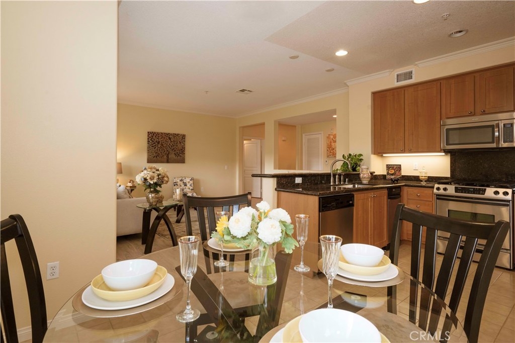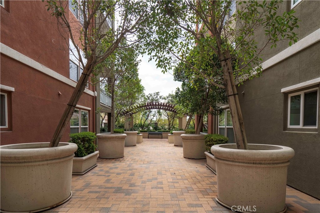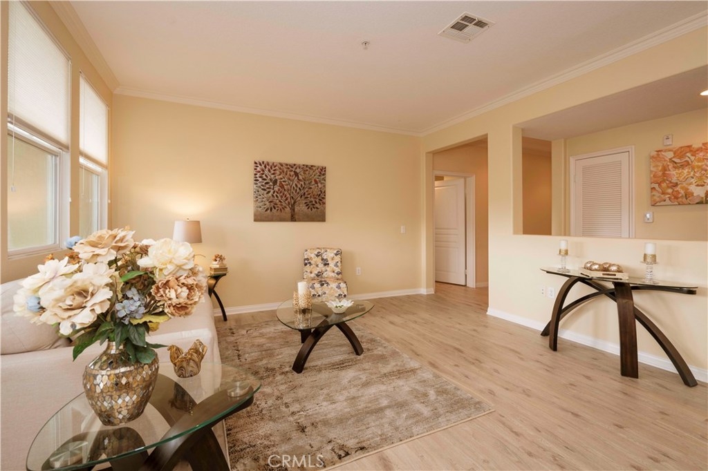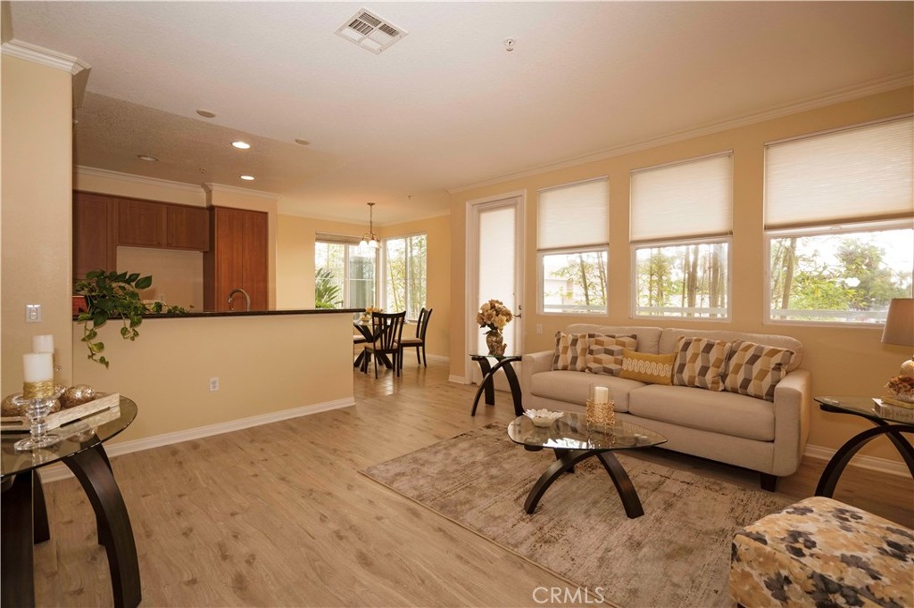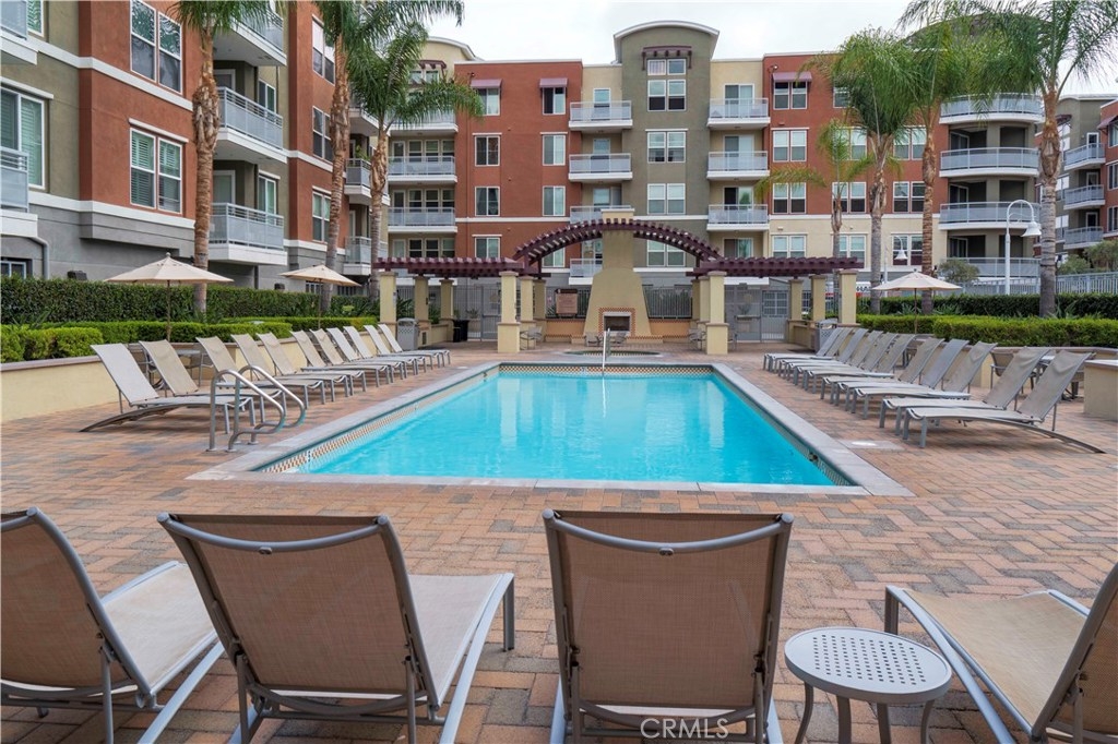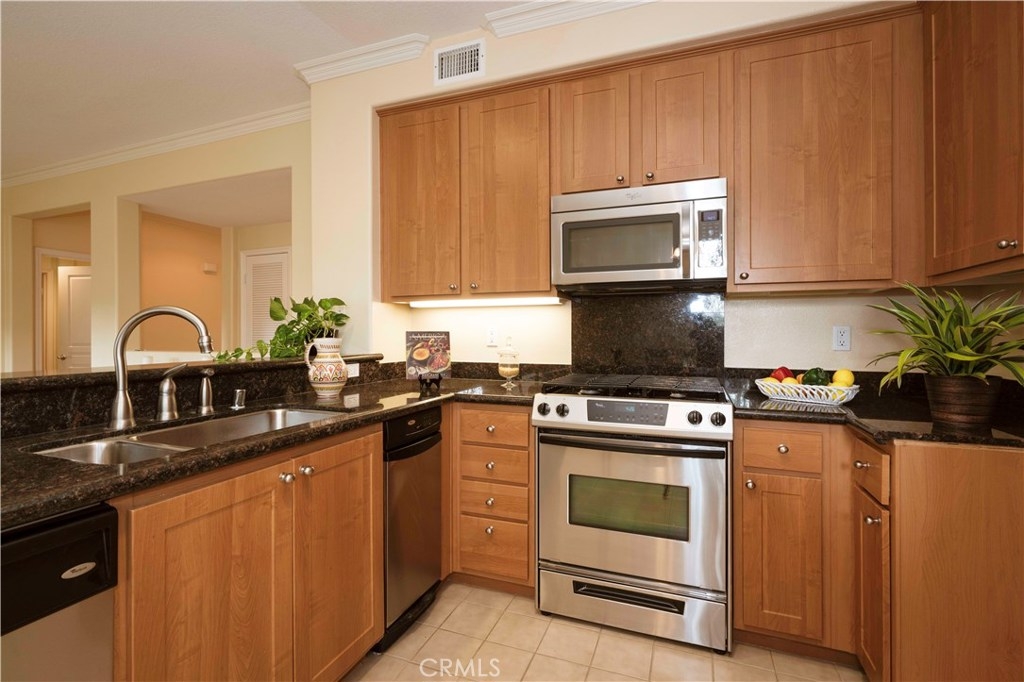 Welcome to centrally located urban living at the gated community at Chapman Commons! This bright and light 2 bedroom, 2 bath open floor plan has plenty to offer. Located conveniently on the first floor of the community the condo faces a fountain centered courtyard just a few steps from the elevators. Brand new luxury vinyl flooring, custom paint, large baseboards, crown moldings, central heating & air conditioning, inside laundry, and dual pane windows are just some of the fantastic details. The upgraded kitchen is adjacent to the dining area and opens up to the living room and it features dark granite countertops set over maple colored cabinets, stainless steel fixtures and appliances include double basin sink, trash compactor, dishwasher, oven with four burner stove gas stove and microwave with recessed lighting overhead. The well appointed large bathrooms have the same matching granite counter tops and cabinets as the kitchen. The sizable Master bedroom has a walk-in closet and opens to the master bath with a large tub shower with sliding glass shower doors. Chapman Commons community provides amenities for you to enjoy such as a gym, clubhouse, BBQ area, pool, and hot tub. The community is also handicap accessible. Just beyond the gate is a driveway to your 2 underground parking spaces and a great storage unit as well. Added bonus the HOA pays water and trash! Conveniently located near the 5 Freeway, UCI Medical Center, tons of shopping & dining options in Anaheim.