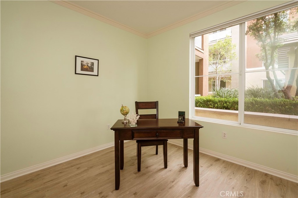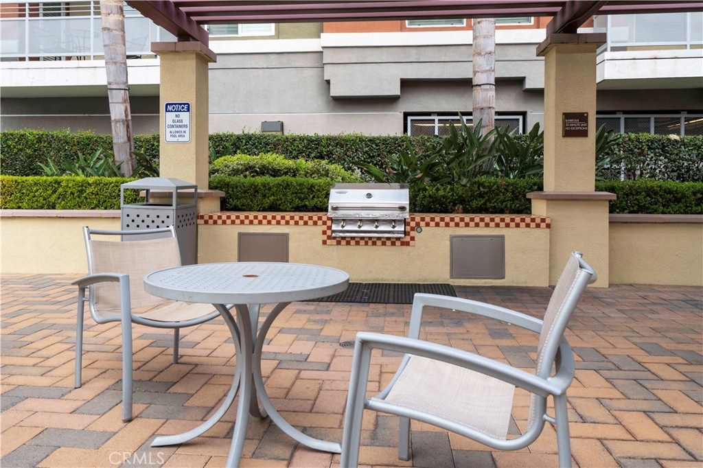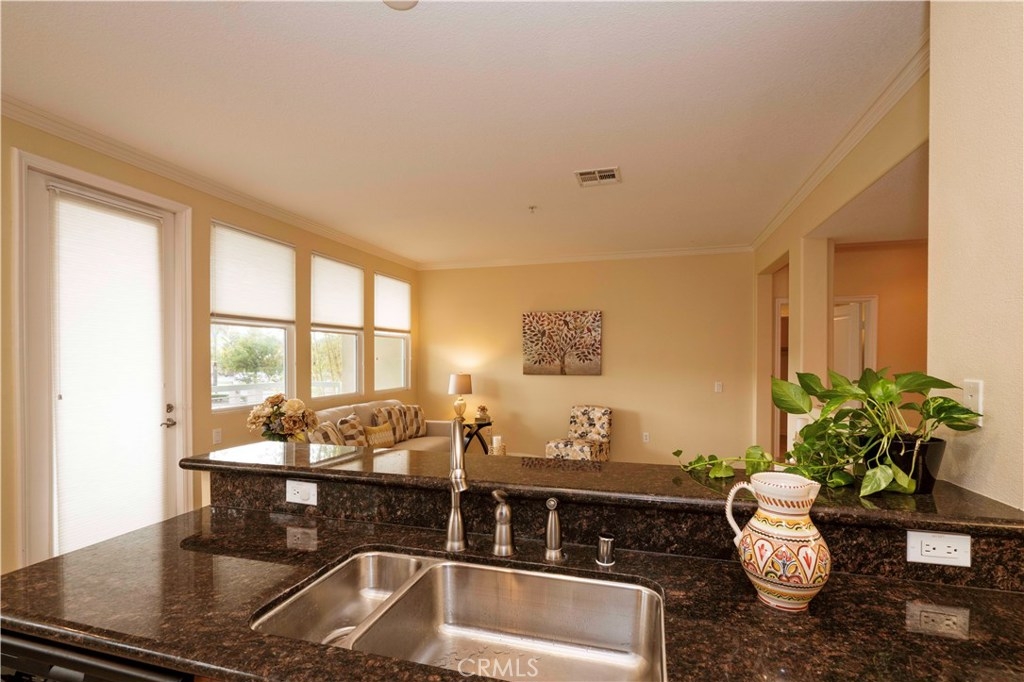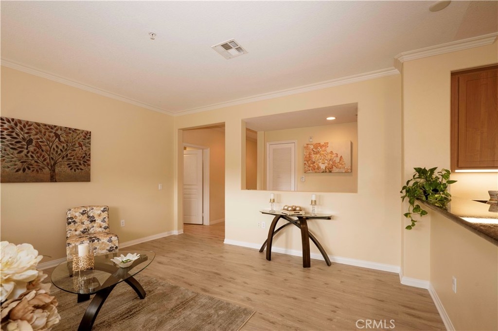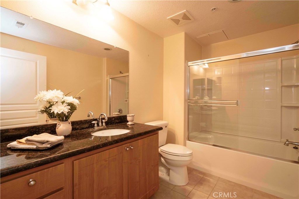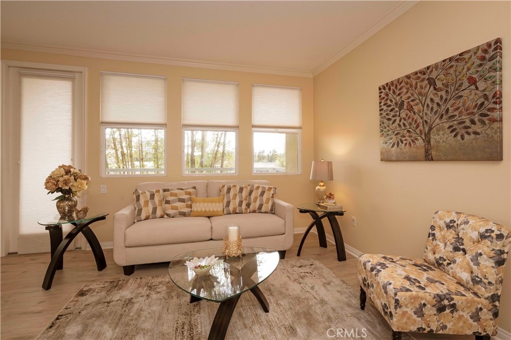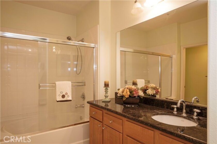 Welcome to centrally located urban living at the gated community at Chapman Commons! This bright and light 2 bedroom, 2 bath open floor plan has plenty to offer. Located conveniently on the first floor of the community the condo faces a fountain centered courtyard just a few steps from the elevators. Brand new luxury vinyl flooring, custom paint, large baseboards, crown moldings, central heating & air conditioning, inside laundry, and dual pane windows are just some of the fantastic details. The upgraded kitchen is adjacent to the dining area and opens up to the living room and it features dark granite countertops set over maple colored cabinets, stainless steel fixtures and appliances include double basin sink, trash compactor, dishwasher, oven with four burner stove gas stove and microwave with recessed lighting overhead. The well appointed large bathrooms have the same matching granite counter tops and cabinets as the kitchen. The sizable Master bedroom has a walk-in closet and opens to the master bath with a large tub shower with sliding glass shower doors. Chapman Commons community provides amenities for you to enjoy such as a gym, clubhouse, BBQ area, pool, and hot tub. The community is also handicap accessible. Just beyond the gate is a driveway to your 2 underground parking spaces and a great storage unit as well. Added bonus the HOA pays water and trash! Conveniently located near the 5 Freeway, UCI Medical Center, tons of shopping & dining options in Anaheim.