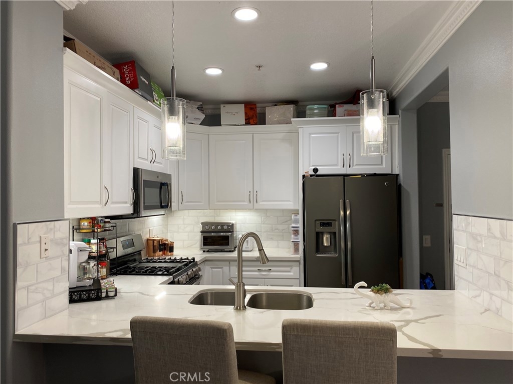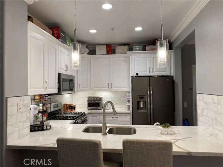 Welcome home to Chapman Commons! This 2 Bedroom/2 Bathroom unit with trendy, modern high-end upgrades won't be on the market for long. A serene water fountain courtyard welcomes you home. Entertain guests in the kitchen with new matching GE gunmetal appliances complement new recessed and pendant lighting. New quartz countertops and custom white cabinetry throughout in kitchen and bathrooms. Take a break and enjoy the private balcony with dual entry. The unit is also upgraded with new grey paint and high-end crown molding. The Master suite features a walk-in closet. Assigned two parking spots conveniently located by elevator and private caged storage. Amenities include: Pool, Spa, BBQ, Poker Room, Gym, Banquet Room, and an on-site Manager. Near 5,22,57 freeways for convenience. Disneyland is less than 10 minutes away. Within 1 block walking distance of shopping centers. ASSOCIATION FEE INCLUDES: WATER, GAS, AND TRASH.