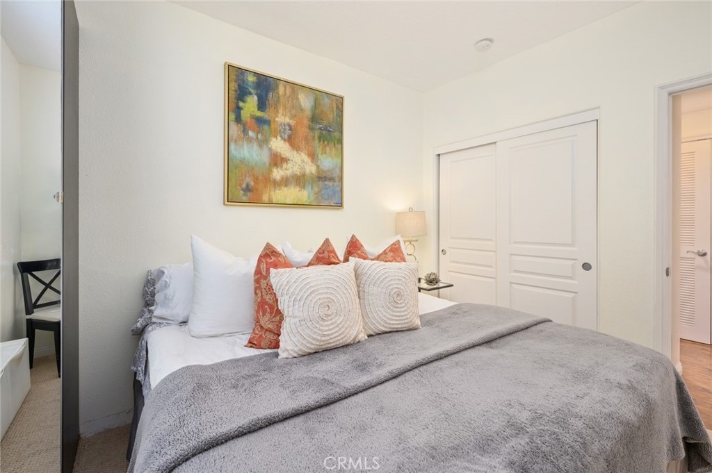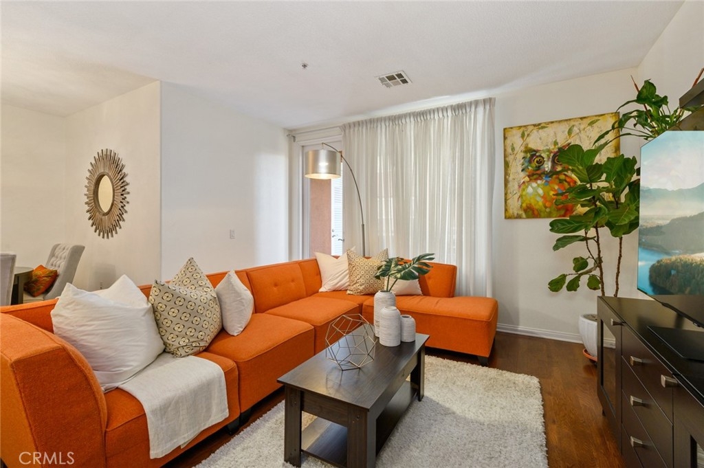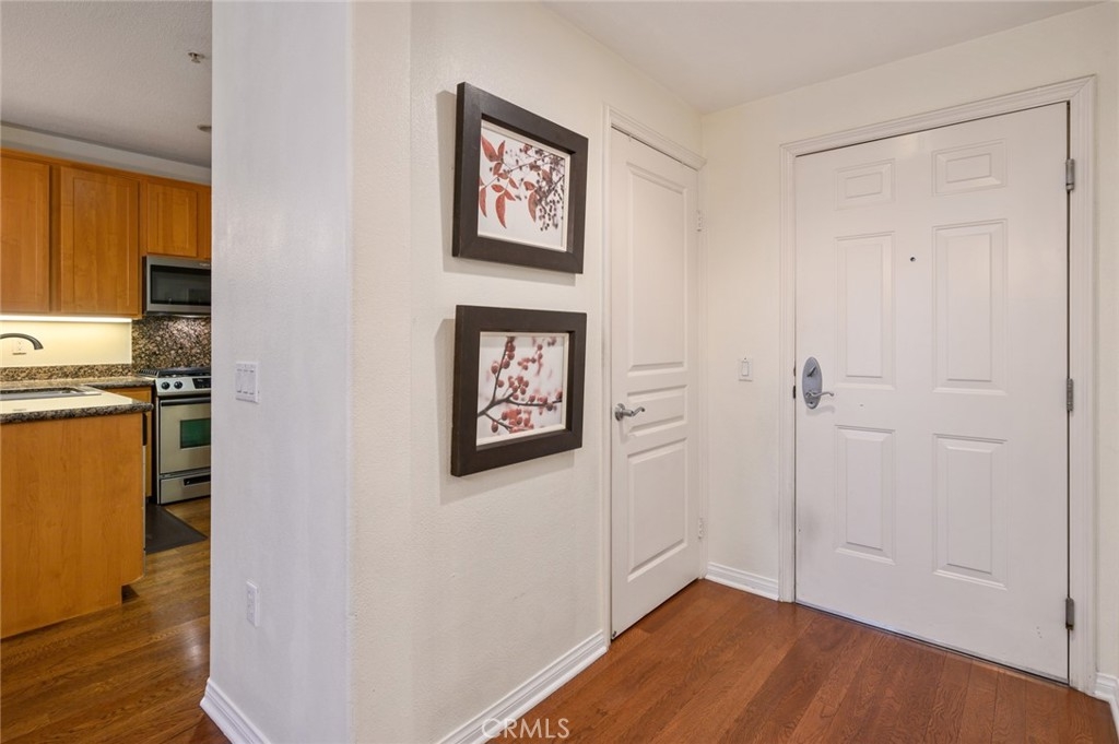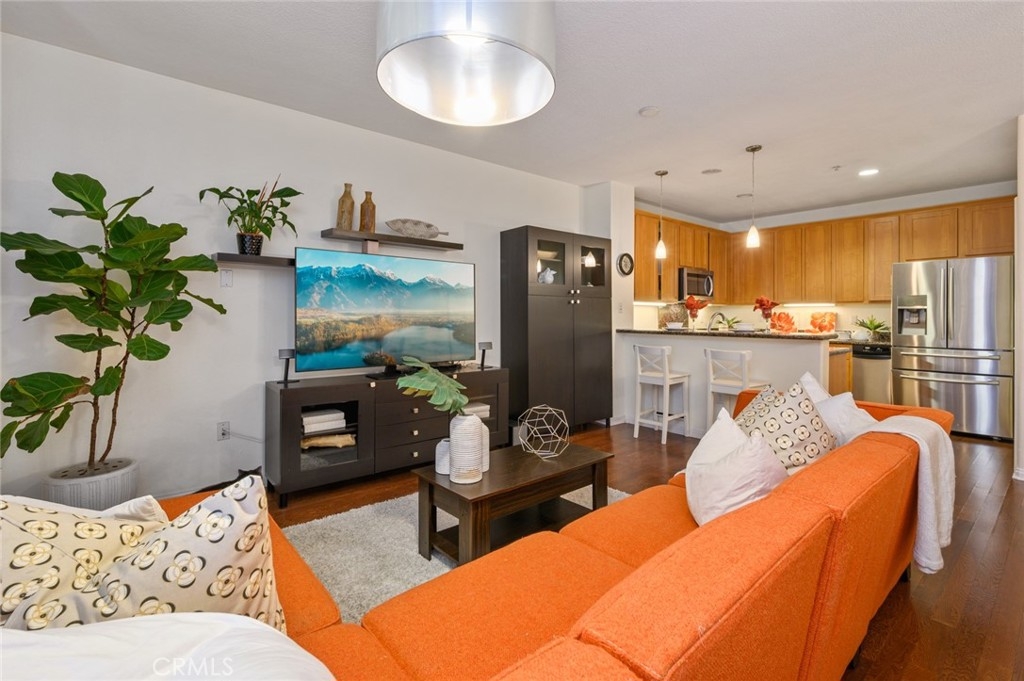 Discover True City-Style Life at Chapman Commons. This mid-rise Modern Condominium Community is a collection of homes with distinctive flair. Be delighted to find a rare Plan 6 available for Homebuyers. The end unit location with only 1 common wall away from street noise could easily make this Home highly coveted. This interior unit located not too far from the elevator for convenience, offers 3 spacious bedrooms and 2 full sized bathrooms. The unique location allows for private views in the balcony off the living room. Properly appointed spaces is immediately realized upon entry into the unit. The inter-connected Kitchen, Living and Dining is well positioned on one side featuring gleaming wood flooring. The hallway takes you to restful accommodations with bedrooms & bathroom lining side by side. The Kitchen is fitted with granite counters nicely contrasted with modern stainless steel appliances against a light-stained cabinetry. A breakfast counter bar lends a functional space for serving daily meals and eating area. Custom sheer window treatment dress up the full sliding door in the living room. This Unit is equipped with full sized washer and dryer in a separate laundry closet with shelving for organization. Community amenities offer resort style Living with a Pool, Spa, Clubhouse, Multi-Purpose Room, A fully outfitted Separate Gym/Exercise Room, Gated Entrance for Residents and 3 assigned parking spaces conveniently located close to the elevator. A separate storage space is also provided for this unit. The Monthly HOA pays for Trash, Water & Gas. The Community's Location is centered around Employment, Dining & Entertainment. Disneyland Resort, Christ Cathedral, The Shops at The Block in Orange and access to freeways are very close by.
