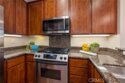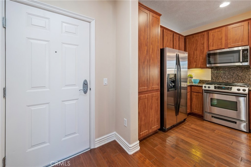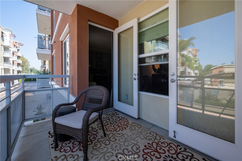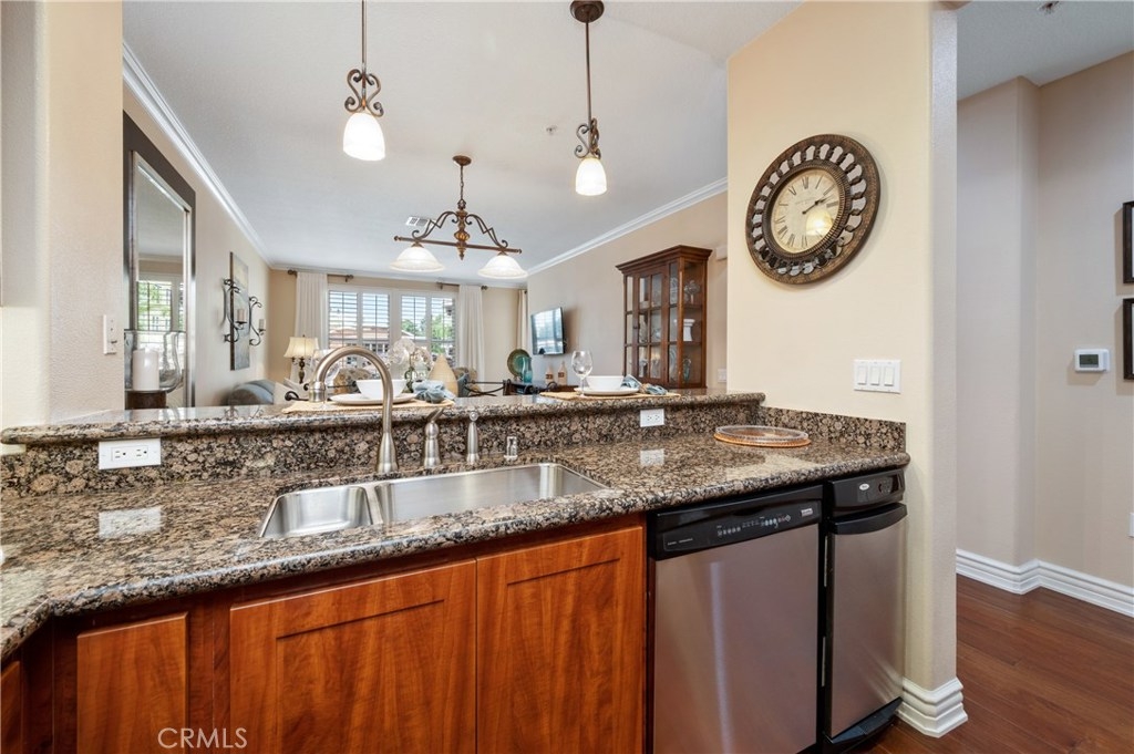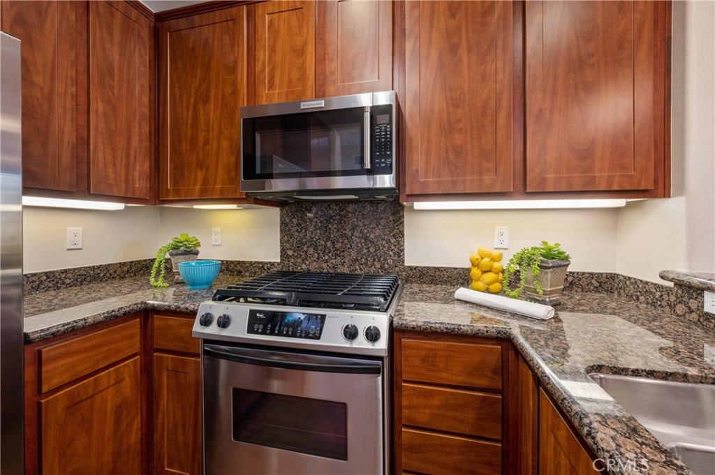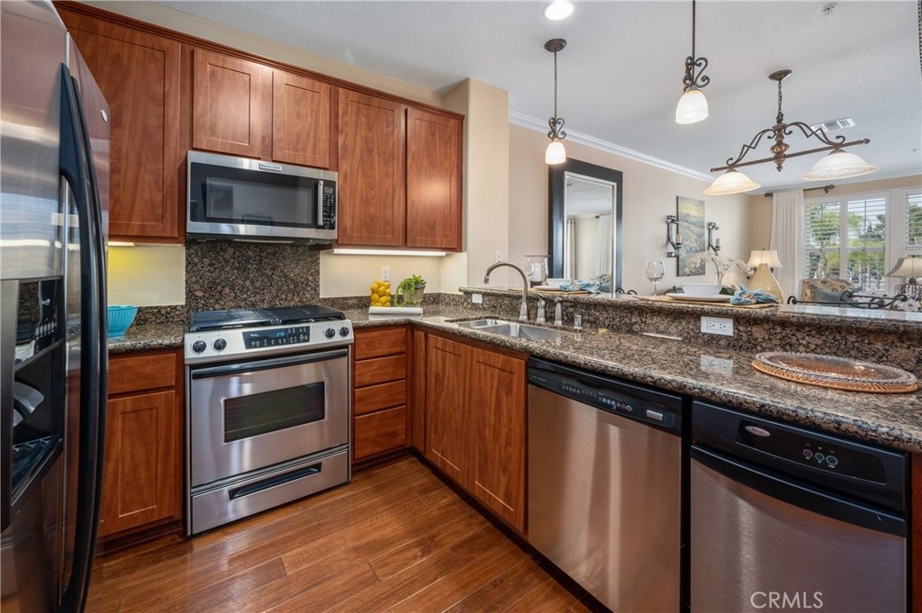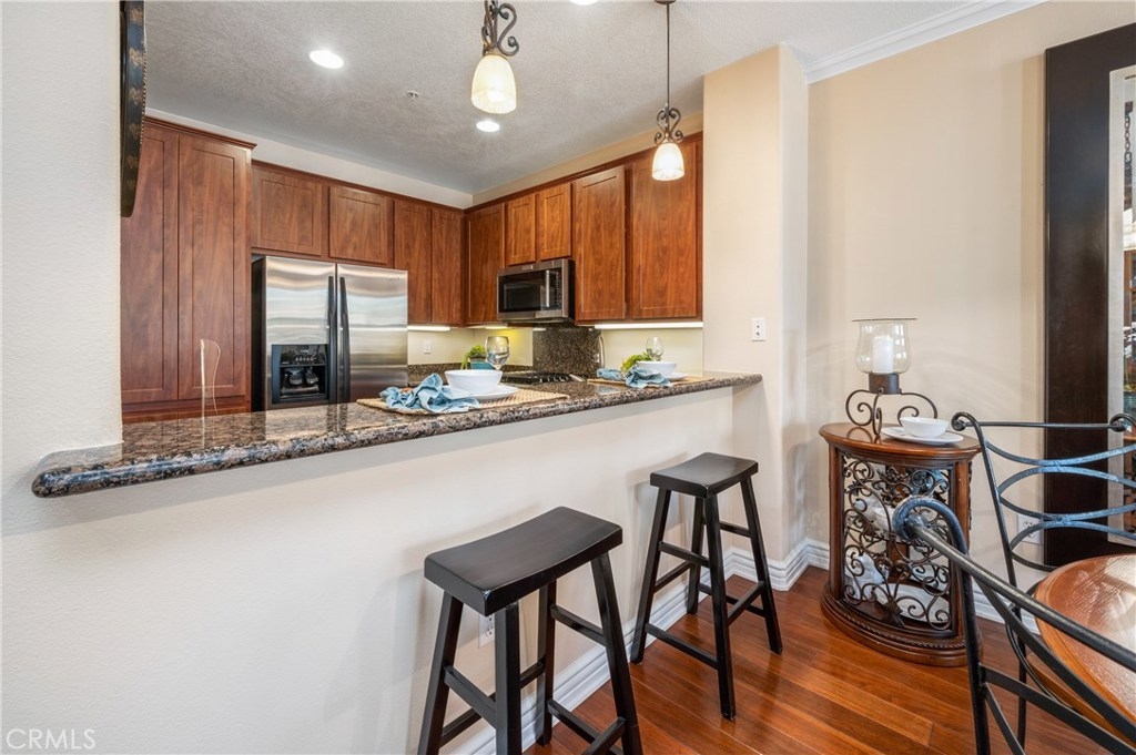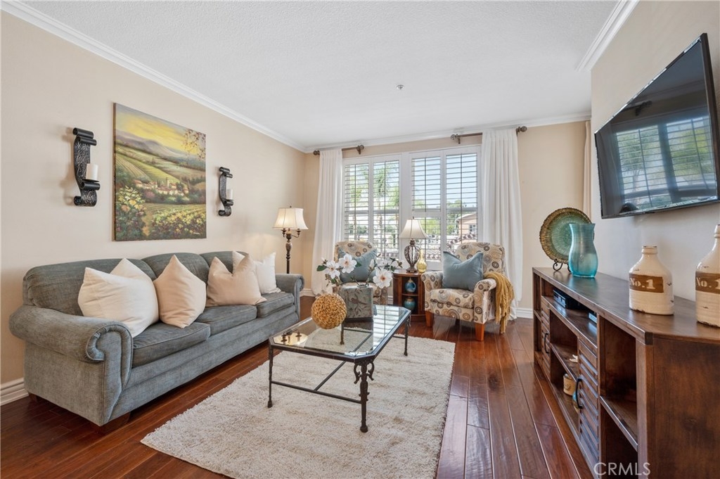 Bask in the glory of True Pride of Ownership! This Beautifully maintained & tastefully updated unit will absolutely delight you from it's interior quiet location to its superior quality of upgrades. Deep stained distressed wood flooring complemented with warm earth tone wall colors,clean base boards, crown molding,plantation wood shutters,bronze finished iron work chandelier & pendant lights,new berber carpeting in the bedrooms,phantom door screens,woven shades,custom closets & an ultra luxurious Master Bathroom,makes this a "Must Have Home"! Newly installed HVAC system guarantees comfort despite any weather.The granite in the kitchen counters & serving bar nicely contrast with all Stainless steel appliances.A seating balcony separates the living room & the primary bedroom,well suited for reading,a glass of wine,afternoon tea or people watching.The resplendent Master Bathroom's ambience promotes relaxation & wellness. Floor to ceiling ceramic subway tiles with intricate scroll tile in-lay enhanced with hand-rubbed bronze shower fixtures completes the space.Double sinks lends convenience & function,framed with new full sized vanity & cabinetry. Combine all of this with outstanding Community amenities of a clubhouse,a modern-equipped fitness room, pool & spa,barbecue area & neatly maintained common spaces.Top this with the vibrancy of it's location,centered around Shopping, Dining,entertaining,employment & access to freeways! Discover & Thrive the Best of Orange County living!