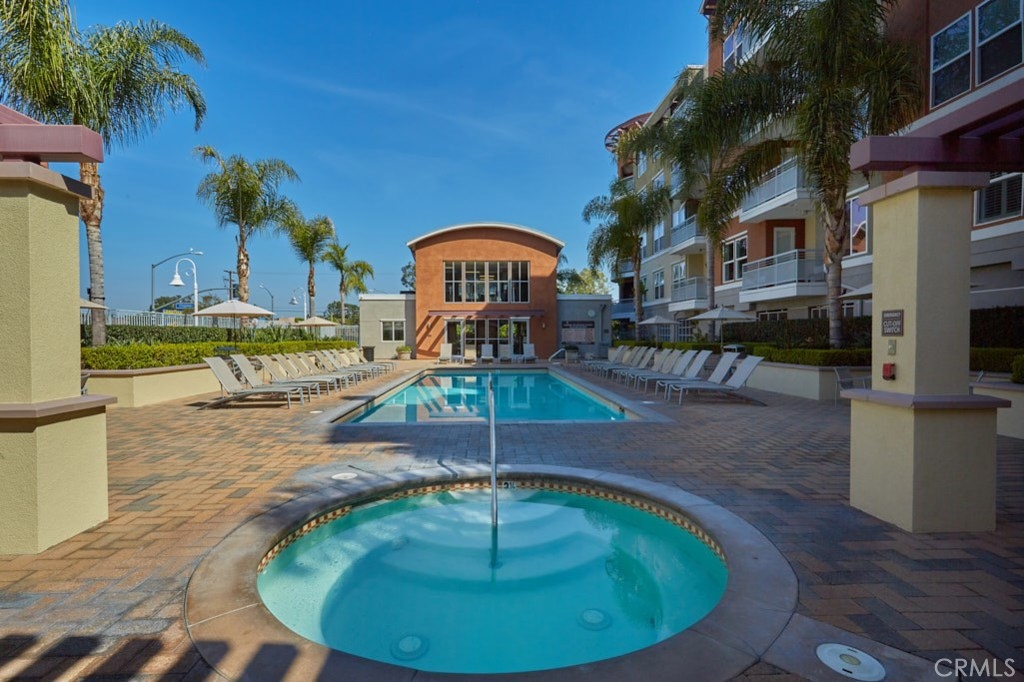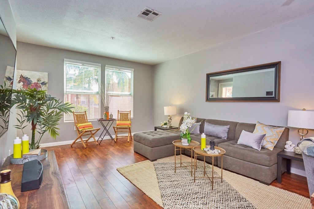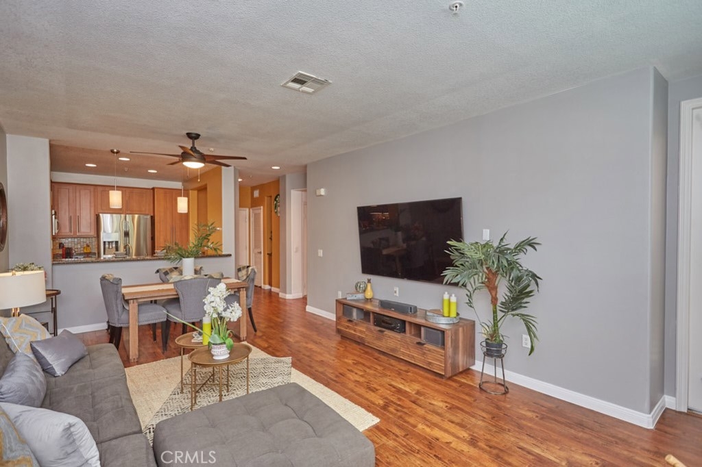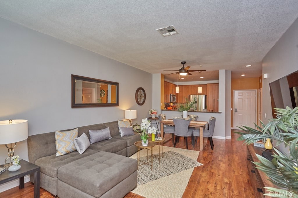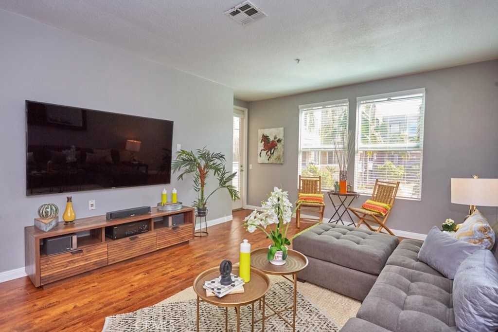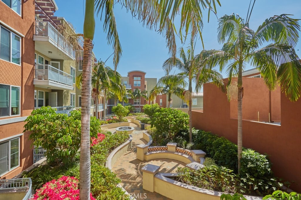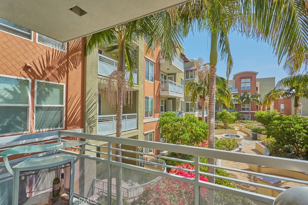 Resort Style Living with the Comforts of Home Await you at Chapman Commons in this beautiful single level condo on the 2nd floor. As you enter the home you will notice the beautiful granite counters and stainless-steel appliances in the kitchen. The open concept living and dining rooms with engineered wood flooring and neutral paint color lend themselves nicely to entertaining guests. There is a private balcony area that extends from the living room to the master bedroom that overlooks a tranquil garden courtyard with fountain. The luxurious master retreat includes a well-appointed master bath with soaking tub, granite topped vanity and a walk-in closet. Off the hallway you will find a large secondary bedroom, guest bath with granite counter tops and hook ups for a stackable washer and dryer. New carpet in the hallway and bedrooms. The unit includes two assigned parking spaces and extra storage in lower garage. The well maintained gated community offers a resort like pool and spa with an outdoor gas fireplace, BBQ's, and seating to enjoy a day around the pool. The clubhouse features a kitchen, game room large gathering area with a private gym on the 2nd floor. There is on-site property management. Association fees include trash, water, sewer & gas. Chapman Commons is located in the Grove District-Anaheim Resort area, close to the 57, 22 and 5 freeways and minutes away to Disneyland, Downtown Disney and The Garden Walk with tons of dining, shopping and nightlife options.