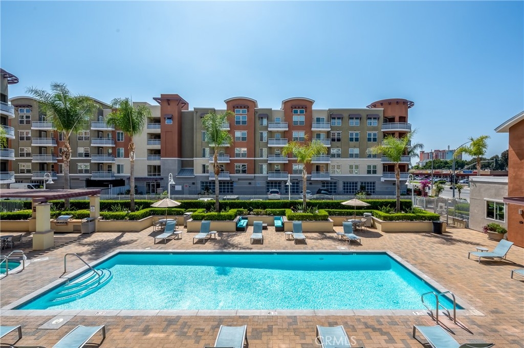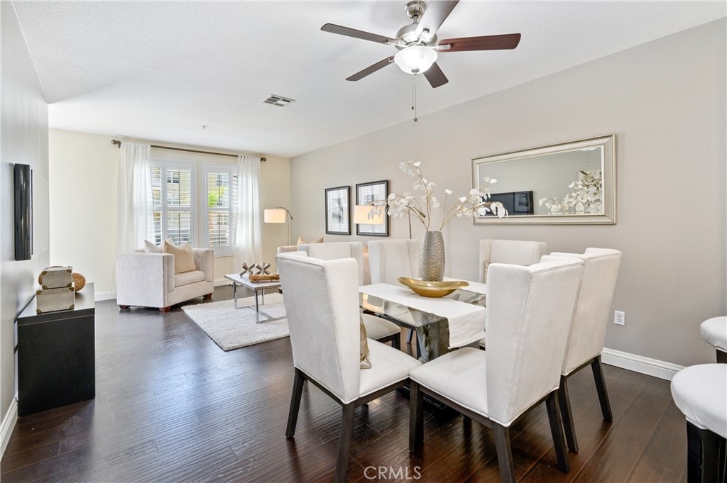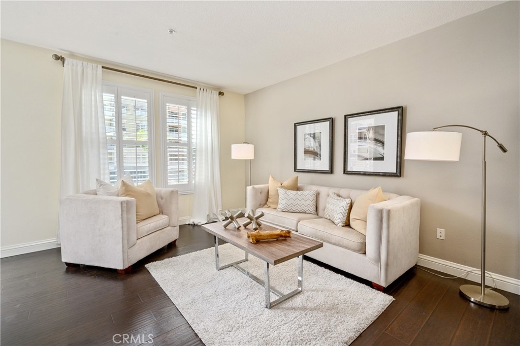Clean, Uncluttered and Sophisticated best describes this Move-In ready unit. Refreshed walls rendered in neutral palette creates a blank canvass for Artful & Contemporary decorating. Laminated wood floors in deep cocoa brown stain defines the open dining and living space. Granite countertops adorn the functional spaced kitchen with stainless steel appliances providing a nice contrast. Well spaced full bathrooms with granite counters and sliding glass enclosures promotes wellness and relaxation. Plantation wood shutters frame all windows and doors. The newly installed full-sized stacked washer & dryer offers convenience. Ceiling light and fan fixtures are well placed in the primary bedroom and the dining area. A walk in closet featured in the primary bedroom, help keep things organized. To unwind, simply Step outside the patio to take in fresh air and capture the community vibrancy. Enjoy aqua blue view afforded by the expansive Resort quality Association pool, spa and outdoor lounge and barbecue area. Healthy living is encouraged with a fully equipped Fitness room. Permanently assigned 2 parking spaces and storage cage is included in the purchase of the unit. The monthly HOA dues pays for Trash, Water & Gas. With employment centers close by, loads of Shopping at The Block of Orange, endless fun and magic at Disneyland Resort, easy freeway access, The City-Style Life is at your Doorstep! Discover true verve, style and the endless rewards embracing and living at Chapman Commons.