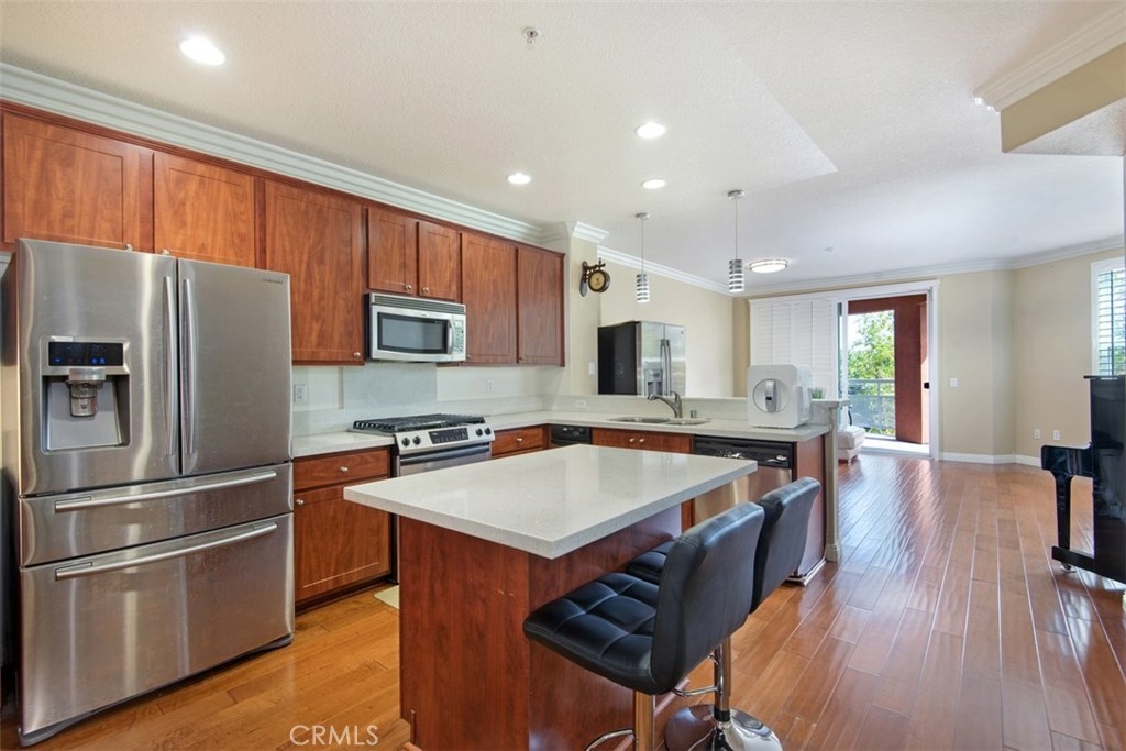 Chapman Commons is Garden Grove's finest. Beautifully upgraded urban style mid-rise Condo built by DR Horton. Enjoy Disneyland fireworks every night. This rare corner unit has a unique layout with an entry hall that opens to open living layout, dining area, perfect for 3 bedrooms and 2 full baths. Beautiful hardwood floor throughout, wood shutters, crown molding and 2 large, private balconies overlooking the park with Disneyland fireworks views and ample space for entertaining. Spacious kitchen features Corion solid surface counter tops with breakfast bar, stainless steel appliances, counter island and pantry storage. Large master suite includes a private balcony and well-appointed master bath with bathtub and huge walk-in closet and large granite vanity. Additional features include a large laundry closet, tons of storage and 3 premium parking spaces near by elevator. Chapman Commons is located in the Grove District-Anaheim Resort, close to the 57, 22 and 5 freeways and adjacent to Disneyland, Downtown Disney and The Garden Walk with tons of dining, shopping and nightlife options. The resort-like community is loaded with amenities including a pool and spa with BBQ's and lounge area, fully loaded fitness center, parking garage with guest parking, secured access with 12 hour security guard and on-site management. HOA fees include trash, water, sewer & gas. A MUST SEE!