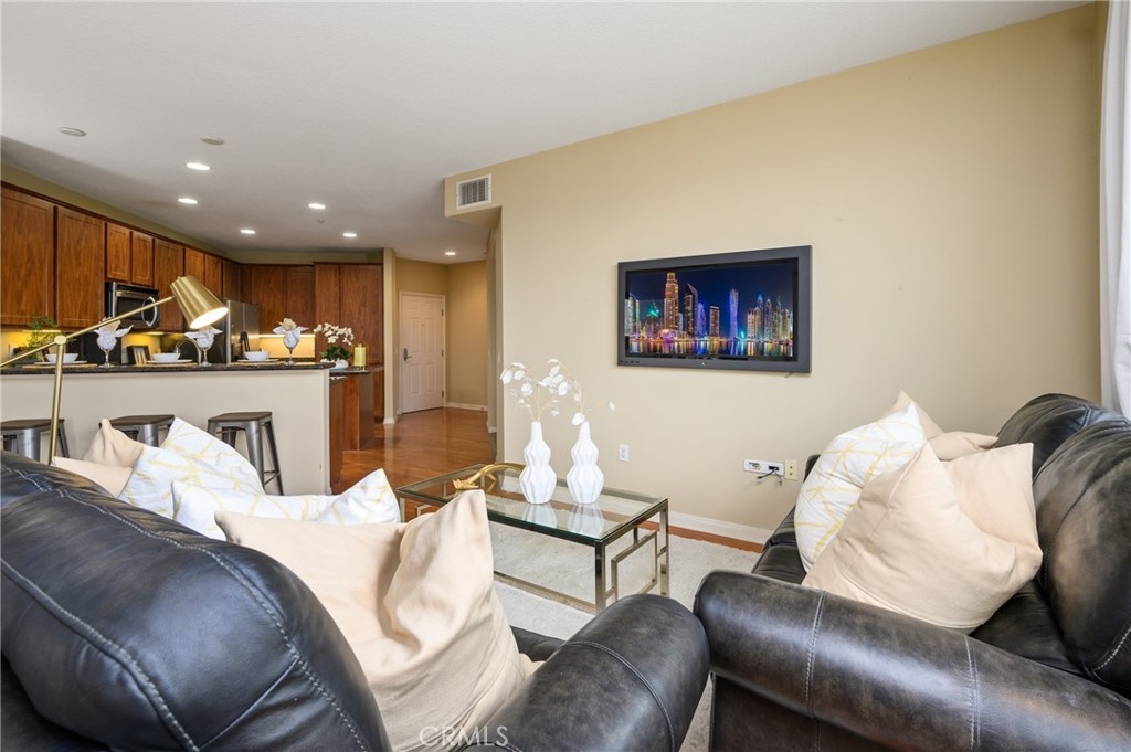 Welcome and Embrace Metropolitan Living in Central Orange County. Good condition, great value and convenient location is realized in this Move-in ready Condominium. This corner unit allows you to enjoy city light views and the colorful Disneyland fireworks. It's highly desired floor plan offers a functional-spaced kitchen with a center island that lends additional work space or table for quick everyday meals. Stainless steel appliances complements the kitchen's thermafoil cabinetry. Clean lines neatly separate all other spaces for comfort and easy decorating. The primary bedroom extends to a balcony/porch that allows homeowners for city light viewing. 2 additional secondary bedrooms are spotless with full-sized closet space. Kitchen and bathroom countertops are in uniform granite. Both bathrooms are fitted with shower over tub for a restful and relaxing retreat. The inside laundry can accommodate a side-by-side washer and dryer, tucked away in a separate closet. The interconnected living and dining area extends to a covered balcony for outdoor seating. Wood flooring combined with premium carpeting, refreshed walls, an inside laundry and a newly installed Heating and Airconditioning System, ensures a comfortable accommodation. Stepping out to the common courtyard, is a Zen-inspired garden, with towering bamboos and spherical water fountains. The outstanding community amenities features a sparkling pool & spa, BBQ area, fire pit, a clubhouse with a full service kitchen and a fully outfitted fitness room that's regularly maintained and sanitized. Right around the community's corner is a park for dog walking. The monthly HOA pays for trash, water and gas. The unit comes with 3 assigned parking spaces and a storage cage to secure seasonal or occasional bulky items. Top this with ideal Orange County location, with easy access to major freeways, dining, shopping, entertainment and employment. Discover the vitality and convenience of City Living!