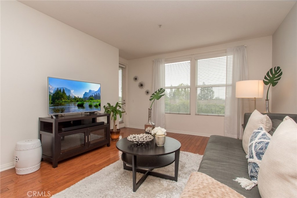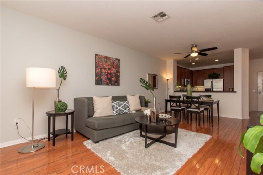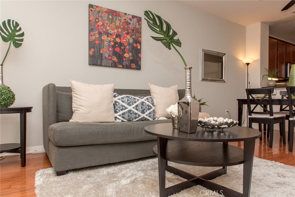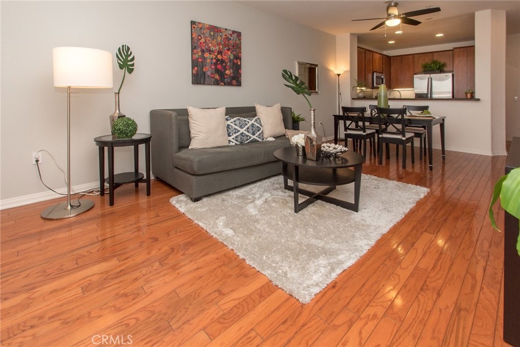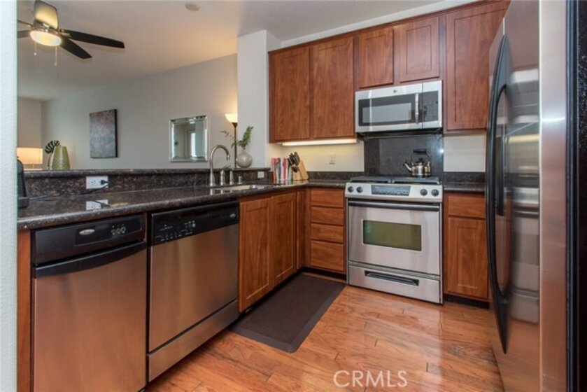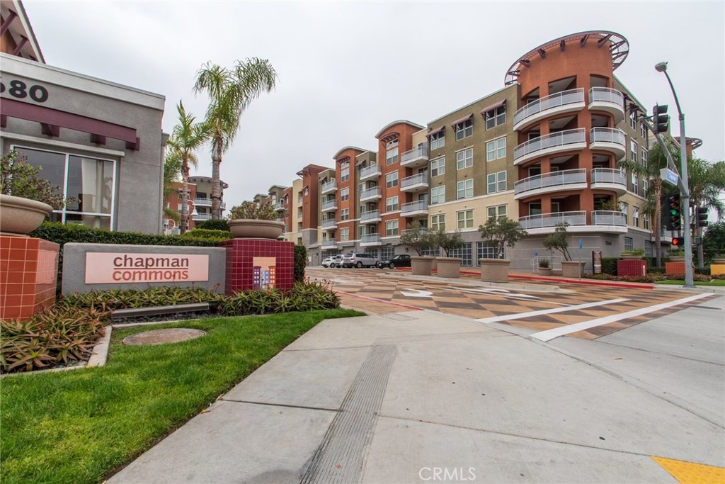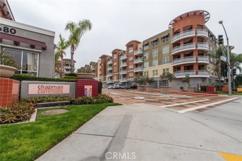 MODERN YET TRULY COMFORTABLE LIVING FITTINGLY CHARACTERIZES THIS 2 BEDROOM 2 BATH CONDO, LOCATED IN THE REMARKABLE & WELL MAINTAINED COMMUNITY OF CHAPMAN COMMONS.AN OPEN FUNCTIONAL FLOOR PLAN ALLOWS NATURAL LIGHT TO FLOOD THROUGH THE ENTIRE UNIT. CONTEMPORARY DESIGNED CEILING LIGHT & FAN FIXTURE IN THE DINING SPACE & MASTER BEDROOM LENDS FUNCTION & GOOD AESTHETICS. MODERN UPGRADES HAVE BEEN UTILIZED INCLUDING GRANITE ON ALL SURFACES IN THE KITCHEN & THE TWO FULL SIZED BATHROOMS. EXQUISITELY MAINTAINED GLEAMING WOOD FLOORS EXTENDS FROM THE ENTRYWAY,THE KITCHEN THEN TO THE DINING & LIVING ROOM AREA. WALLS HAVE BEEN REFRESHED IN NEUTRAL TONE & ACCENTUATED W/ A CRISP SOFT GRAY THAT'S ULTRA CHIC. A SPARKLING CONTRAST OF MATCHING STAINLESS STEEL APPLIANCES AGAINST A DARK STAINED CABINETRY ANCHORS THE KITCHEN.THROUGH THE HALLWAY DISCOVER A SPACIOUS SECOND BEDROOM LINED W/ PLUSH CARPET,FITTED W/ FULL SIZED CLOSET & ADORNED W/ FLOOR TO CEILING DRAPERY.A FULL SIZED BATH SITS RIGHT ACROSS.THE SPACIOUS MASTER BEDROOM TUCKED AT THE END OF THE HALLWAY FEATURES A WALK IN CLOSET.STEP OUT TO THE TERRACE & ENJOY CITY LIGHT VIEW & FIREWORKS FROM DISNEYLAND.A ZEN GARDEN IS YOUR DIRECT VIEW RIGHT IN FRONT OF THE UNIT.COMMUNITY AMENITIES OFFER RESORT STYLE LIVING W/ A POOL,SPA,CLUBHOUSE,MULTI PURPOSE ROOM,SEPARATE GYM/EXERCISE ROOM.GATED ENTRANCE FOR RESIDENTS, 2 ASSIGNED PARKING SPACES CONVENIENTLY LOCATED NEXT TO THE ELEVATOR & A SEPARATE STORAGE FOR THE UNIT. HOA FEE PAYS TRASH,WATER & GAS.