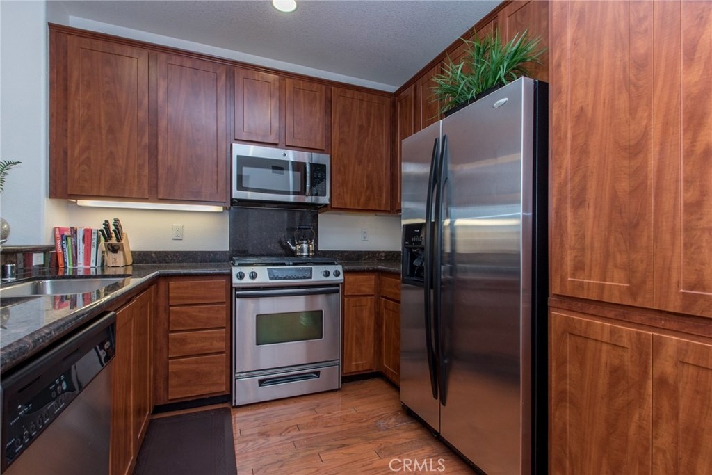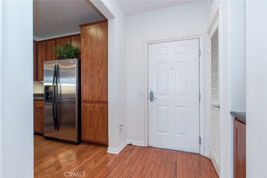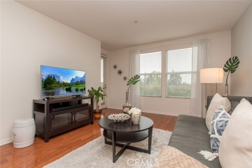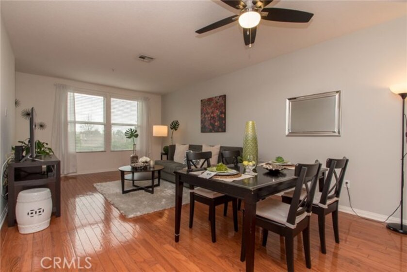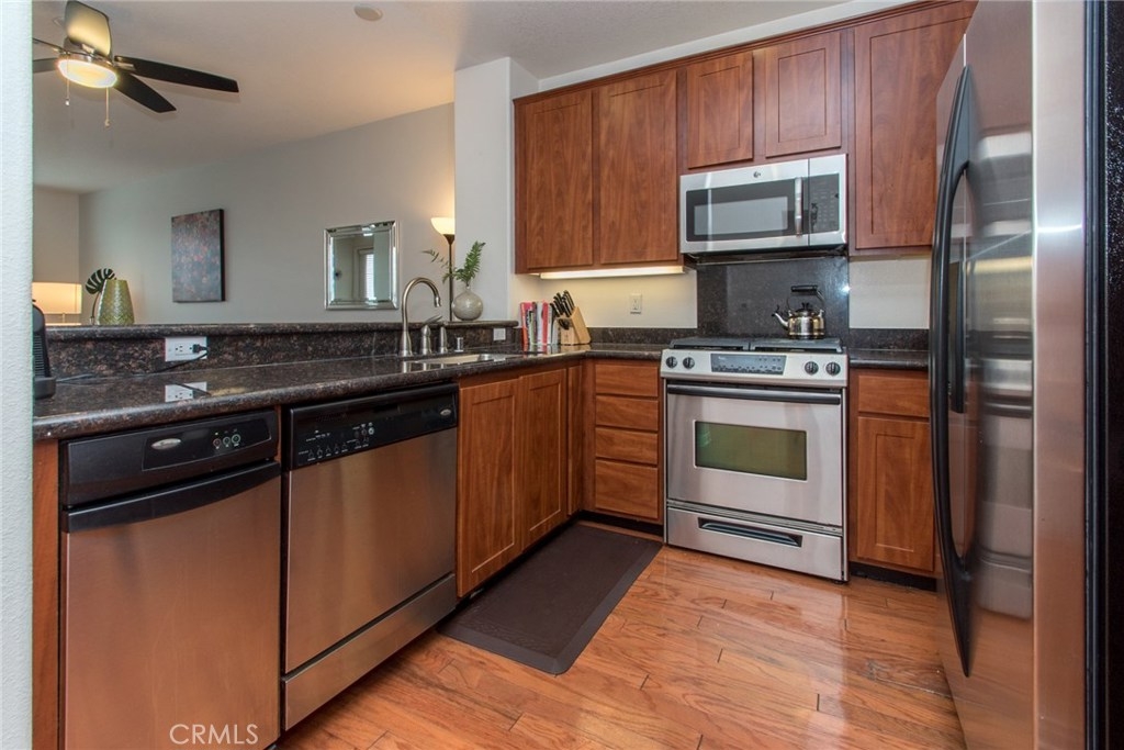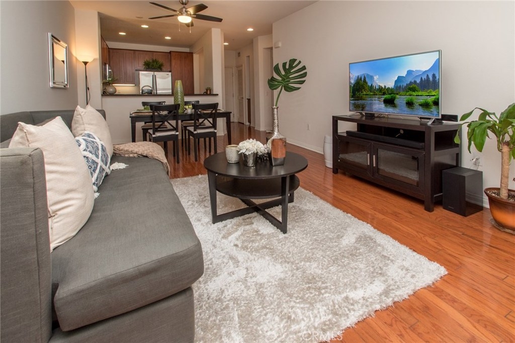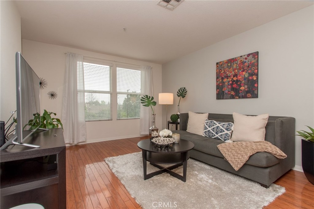 MODERN YET TRULY COMFORTABLE LIVING FITTINGLY CHARACTERIZES THIS 2 BEDROOM 2 BATH CONDO, LOCATED IN THE REMARKABLE & WELL MAINTAINED COMMUNITY OF CHAPMAN COMMONS.AN OPEN FUNCTIONAL FLOOR PLAN ALLOWS NATURAL LIGHT TO FLOOD THROUGH THE ENTIRE UNIT. CONTEMPORARY DESIGNED CEILING LIGHT & FAN FIXTURE IN THE DINING SPACE & MASTER BEDROOM LENDS FUNCTION & GOOD AESTHETICS. MODERN UPGRADES HAVE BEEN UTILIZED INCLUDING GRANITE ON ALL SURFACES IN THE KITCHEN & THE TWO FULL SIZED BATHROOMS. EXQUISITELY MAINTAINED GLEAMING WOOD FLOORS EXTENDS FROM THE ENTRYWAY,THE KITCHEN THEN TO THE DINING & LIVING ROOM AREA. WALLS HAVE BEEN REFRESHED IN NEUTRAL TONE & ACCENTUATED W/ A CRISP SOFT GRAY THAT'S ULTRA CHIC. A SPARKLING CONTRAST OF MATCHING STAINLESS STEEL APPLIANCES AGAINST A DARK STAINED CABINETRY ANCHORS THE KITCHEN.THROUGH THE HALLWAY DISCOVER A SPACIOUS SECOND BEDROOM LINED W/ PLUSH CARPET,FITTED W/ FULL SIZED CLOSET & ADORNED W/ FLOOR TO CEILING DRAPERY.A FULL SIZED BATH SITS RIGHT ACROSS.THE SPACIOUS MASTER BEDROOM TUCKED AT THE END OF THE HALLWAY FEATURES A WALK IN CLOSET.STEP OUT TO THE TERRACE & ENJOY CITY LIGHT VIEW & FIREWORKS FROM DISNEYLAND.A ZEN GARDEN IS YOUR DIRECT VIEW RIGHT IN FRONT OF THE UNIT.COMMUNITY AMENITIES OFFER RESORT STYLE LIVING W/ A POOL,SPA,CLUBHOUSE,MULTI PURPOSE ROOM,SEPARATE GYM/EXERCISE ROOM.GATED ENTRANCE FOR RESIDENTS, 2 ASSIGNED PARKING SPACES CONVENIENTLY LOCATED NEXT TO THE ELEVATOR & A SEPARATE STORAGE FOR THE UNIT. HOA FEE PAYS TRASH,WATER & GAS.