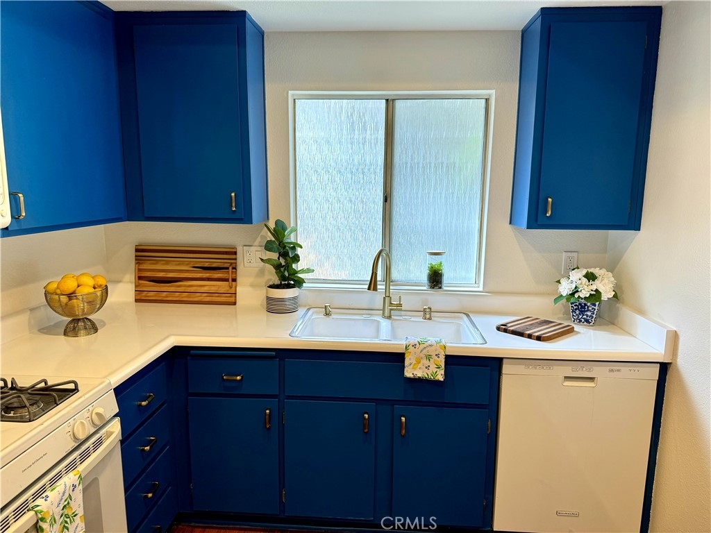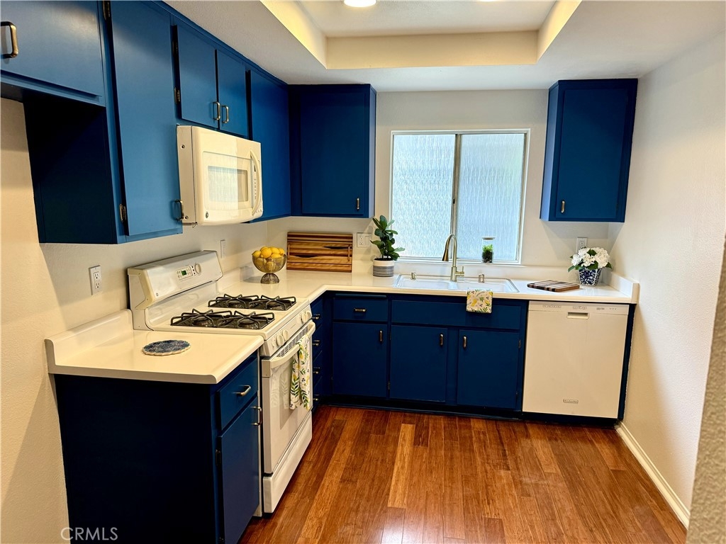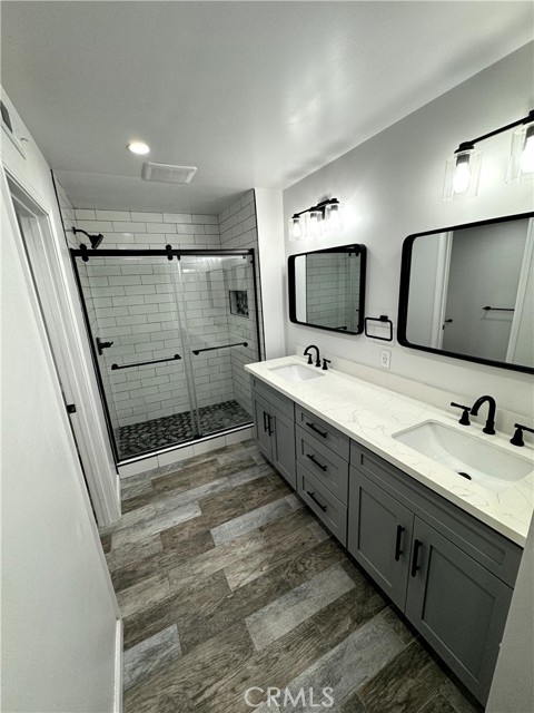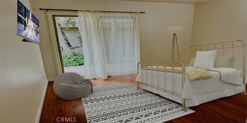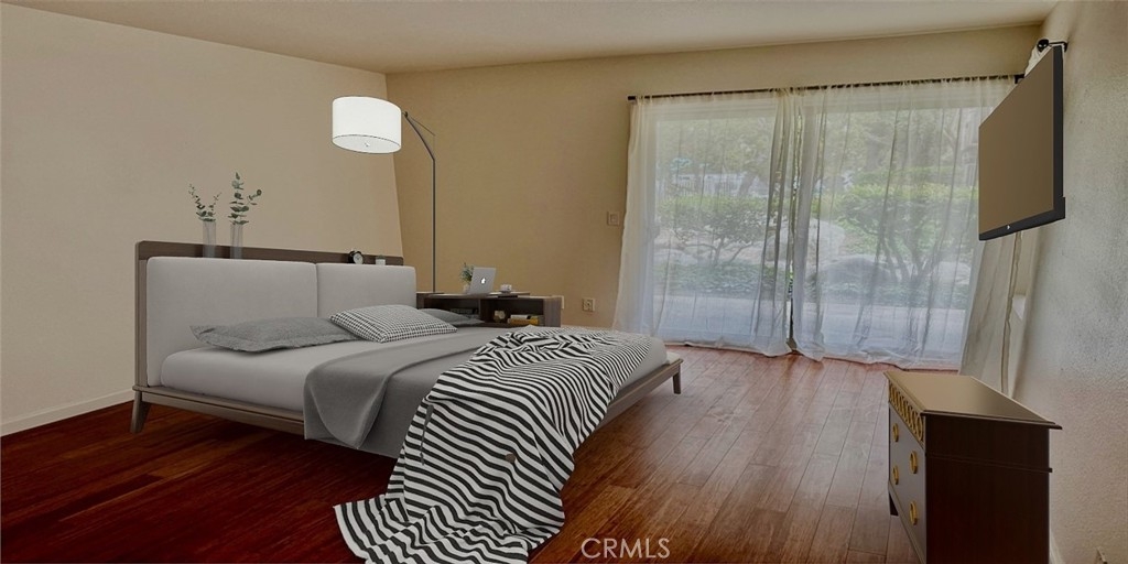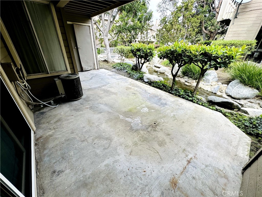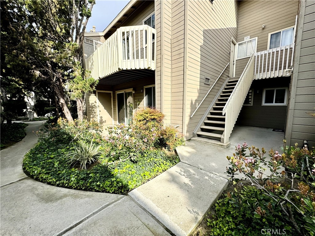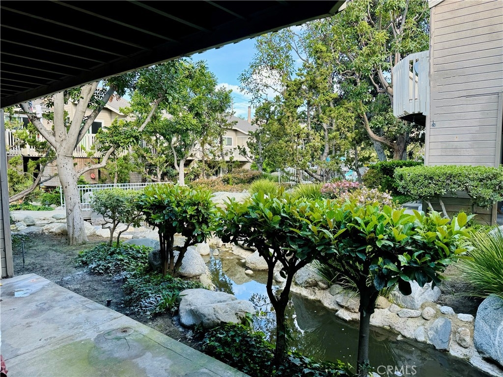 Escape to tranquil living at Cobblestone Creek, a peaceful oasis centered around lushly landscaped creeks. This single-level 2 bed/2 full bath desirable downstairs condo offers a prime location with limited foot traffic and is close to the detached 2-car garage. Entering the open floor plan, you’ll be immediately drawn to the spacious living room with a cozy brick fireplace that flows directly onto the large private covered patio overlooking the babbling creek. The master suite is a serene retreat, boasting direct patio access and a fully remodeled en-suite bathroom with a quartz double vanity, and stylish barn door closets. The second bedroom also enjoys access to an additional private patio and has plenty of closet space with the second remodeled full bath with upscale tile floors nearby. The freshly painted updated kitchen boasts modern bold blue cabinets with plenty of storage, a new faucet, and bamboo wood floors flowing throughout. The in-unit washer/dryer space adds convenience. Enjoy the complex’s pool, spa, walking paths, and gated security. Just minutes from amusement parks, shopping, dining, and freeways, this creekside condo offers the perfect blend of serenity and accessibility in a highly sought-after community. Welcome to your private retreat.