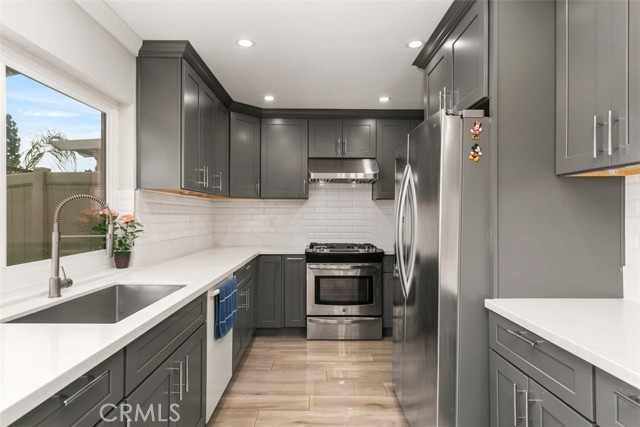 This captivating two-story townhome is ready for you to move in and is situated in the highly sought-after Garden Park Community. Classified as a Single Family Residence, this distinctive townhome features 3 bedrooms, 2.5 baths, boasting a spacious living area of 1,404 sqft, all nestled on a generous lot size of 1,908 sqft. Upon stepping inside, you'll be embraced by the inviting glow of warm amber natural light that floods the interior. The home has undergone a complete remodel, showcasing fresh new paint throughout, along with custom kitchen cabinets, tile flooring, doors, and stairways. Every bathroom has been tastefully upgraded, and modern appliances, including a refrigerator, gas cooking range, and indoor laundry with a brand-new washer and dryer, adorn the space. Additional enhancements encompass recessed lighting, a new water softener, a water heater, central AC, and windows, ensuring comfort and convenience. Exiting the kitchen, a welcoming patio and garden await, leading to the detached two-car garage, complemented by an additional parking space behind it. Enjoy the convenience of being close to Disneyland, vibrant Korean and Vietnamese communities, as well as Costco and Home Depot, with effortless access to the nearby 22 freeway.