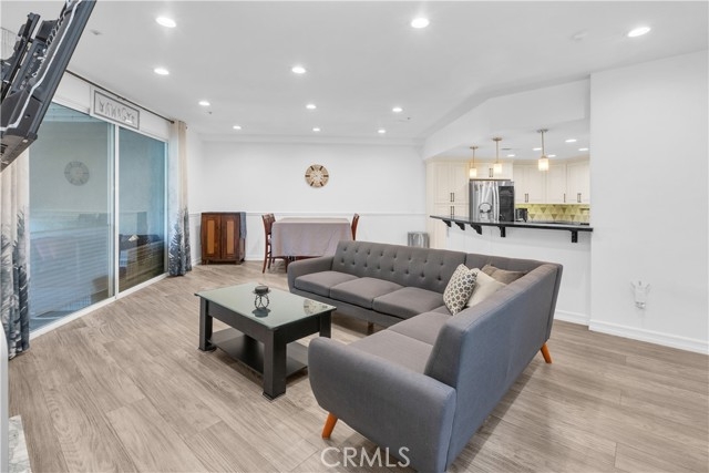 Step into this gorgeous, single-level condominium nestled in Garden Grove's exclusive Greenbrier Terrace community. Enjoy the rare convenience of an attached 2-car garage with direct home access, a coveted feature in this gated enclave. Boasting an airy open concept, this home features 2 bedrooms and 2 bathrooms. The spacious living room is enhanced by an electric fireplace with a custom mantel, complemented by an oversized private patio that overlooks the pool, complete with a private exit for easy poolside access. A remodeled kitchen awaits with quartz counters, custom cabinetry, stainless steel appliances, and a breakfast bar illuminated by pendant lighting. Additional highlights include a laundry closet in kitchen (washer/dryer is included), recessed lighting throughout the main areas and light/fans in rooms, central A/C, water softener, and newly tiled floors in the garage. Greenbrier Terrace offers 5 gated entries, 4 pools and spas, plus private parking patrol. HOA covers water/sewer, trash, and common area maintenance. Perfectly situated near freeways, shopping, dining, parks and schools. This turnkey home is ready for you to move right in! Don't miss out! Schedule your tour today!