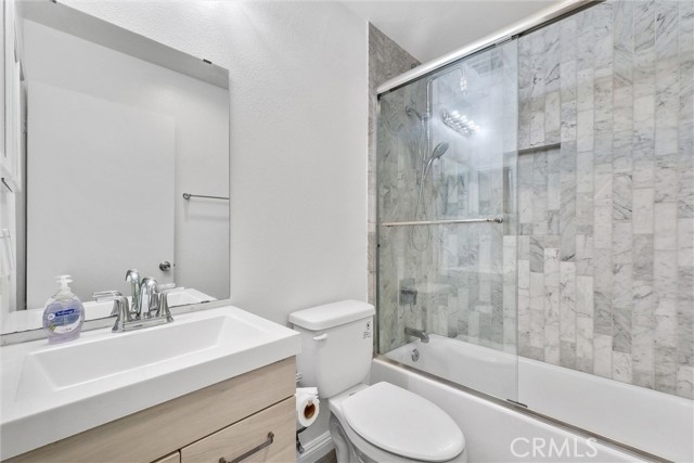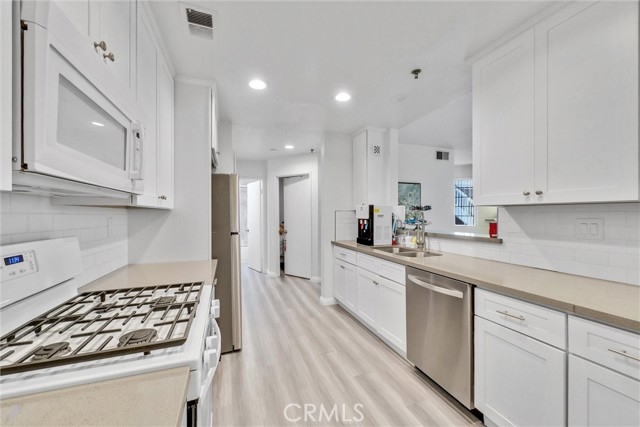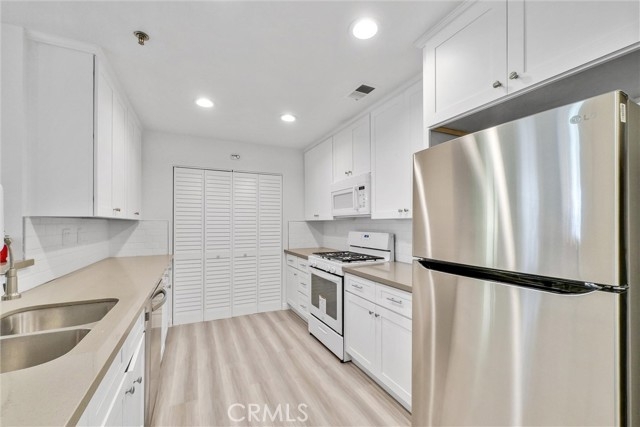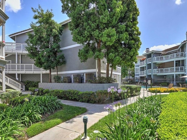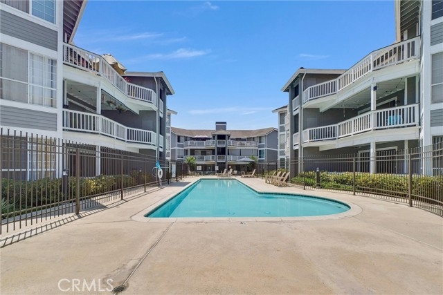 Beautifully upgraded Greenbrier Terraces 2 Bedroom/2 Bath Floorplan! Pool level location with a 2 Car Garage. Featuring a spacious master bedroom, walk-in closet, upgraded master bathroom with large shower, dual sinks, high-ceilings, a living room fire element, quartz kitchen countertops, indoor laundry behind custom doors, central A/C and heating with plenty of storage throughout. Private patio with custom shades, perfect for entertaining, and relaxing, just steps to the pool and spa. Includes newer flooring, refrigerator and washer/dryer. Community pool, spa, water and trash disposal are included in the HOA. **Open House 12-4 on Sat 7/27 AND Sun 7/28** https://media.realestatephotoshoot.com/10371-Garden-Grove-Blvd-24