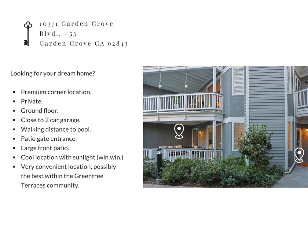 Incredible opportunity with everything you could ask for in the perfect home: open floor plan, large kitchen, huge balcony, interior laundry, 2 car garage, ground level, near garage and pool, private corner location. Water and trash paid by association. VA approved. Located in premium Garden Grove location.