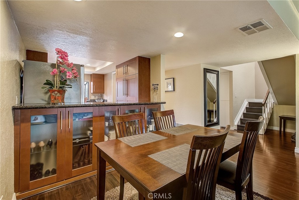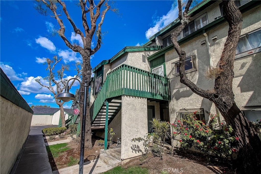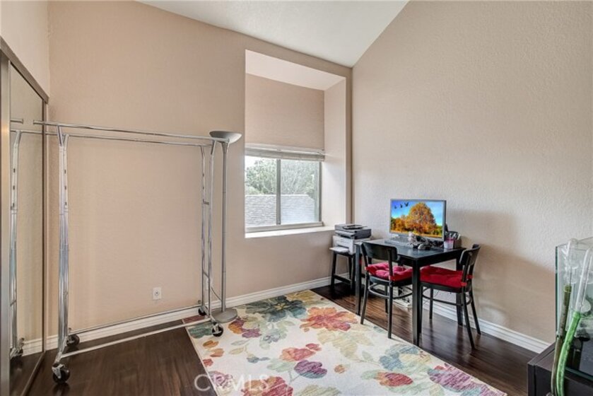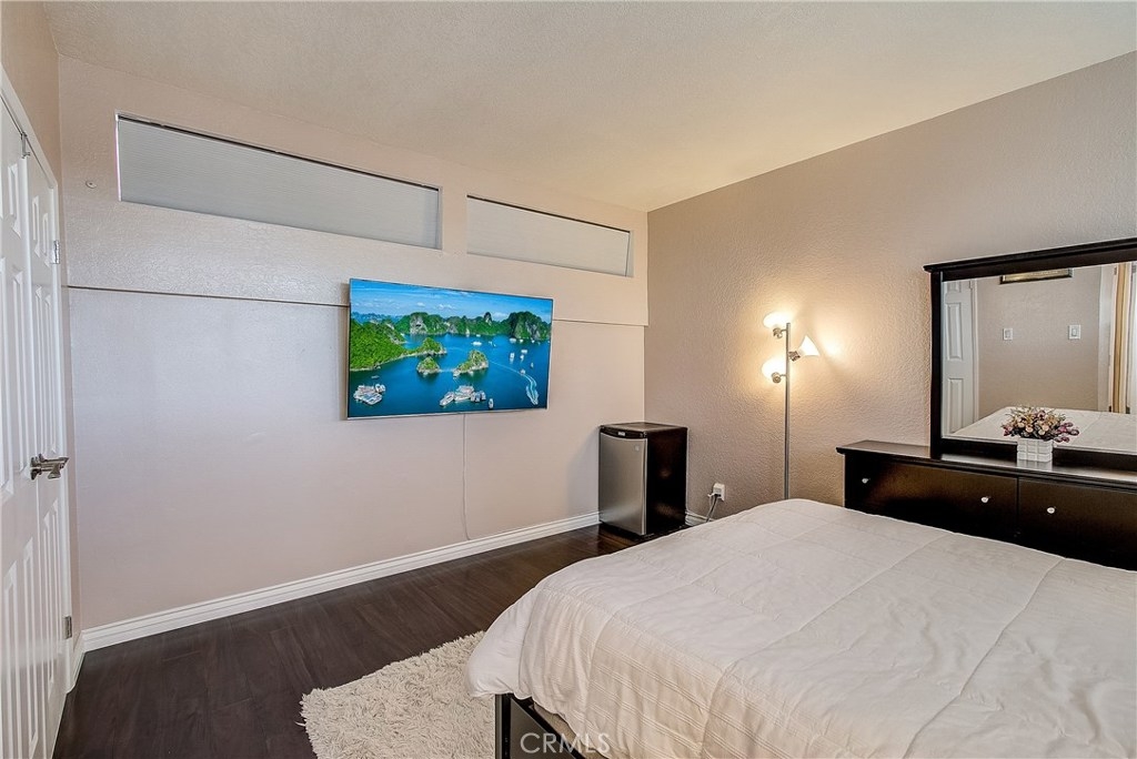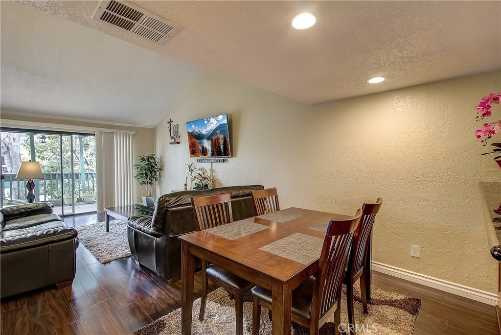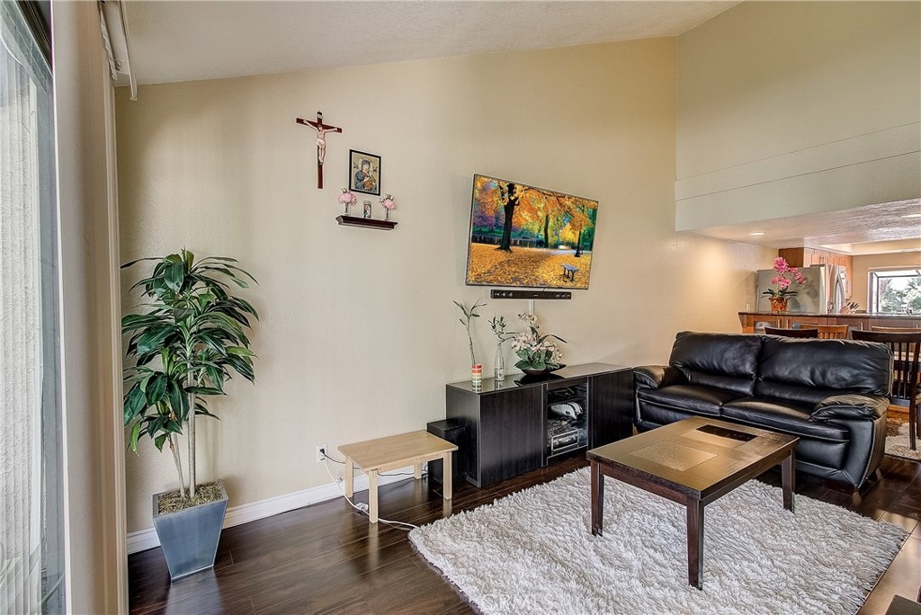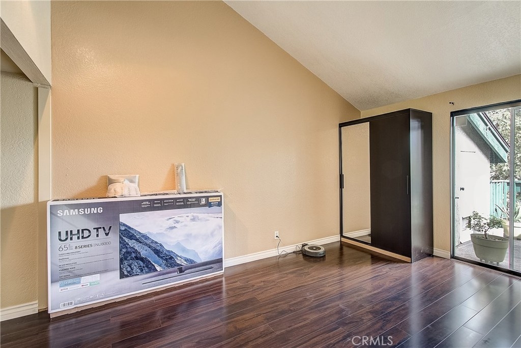 This upgraded, upper-level condo located in the gated Greenhouse West community of Garden Grove is truly turnkey! Rich hardwood floors and vaulted ceilings throughout complement the bright and open floorplan. The upgraded kitchen is well-appointed with granite counters, stainless steel appliances and a breakfast bar with plenty of storage space that opens to the dining area. The dining area seamlessly flows to the living room with light-catching sliding doors to the spacious and private balcony. Just off the living room, double doors open to a spacious bedroom with vaulted ceilings. Down the hall is a secondary bedroom adjacent to the full hall bathroom. Upstairs, the master suite boasts dual closets and an en-suite bathroom with a granite-topped vanity and a walk-in shower. Also featuring a convenient indoor laundry closet. Enjoy the nearby community pool and spa. Welcome home!