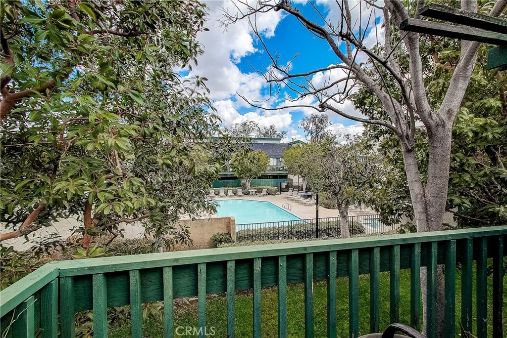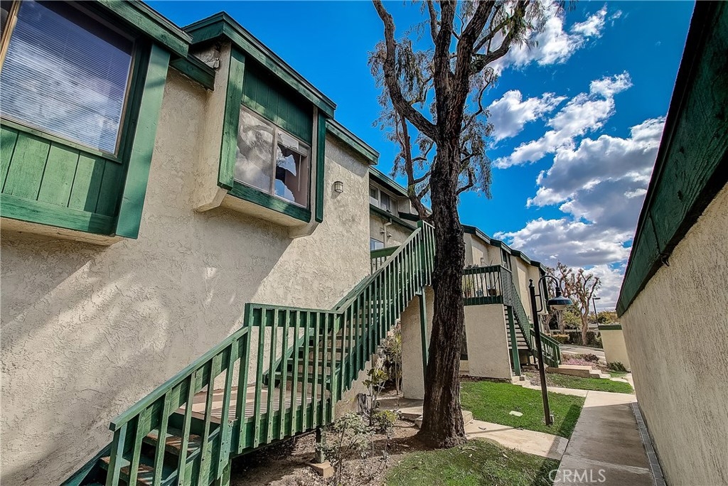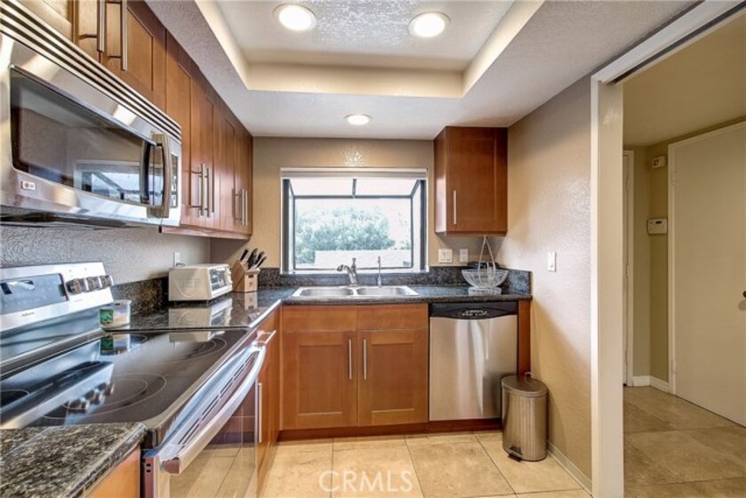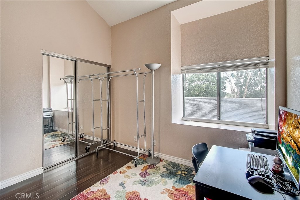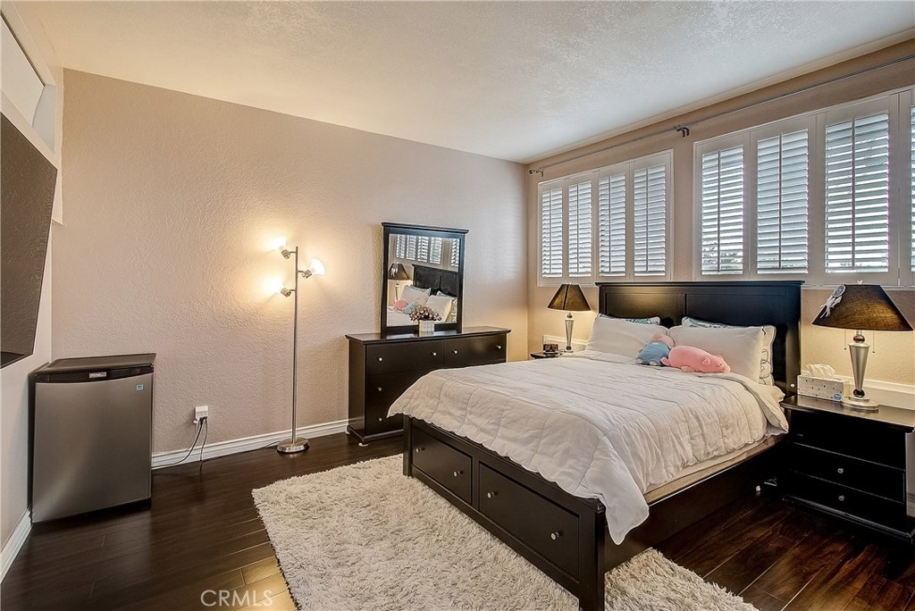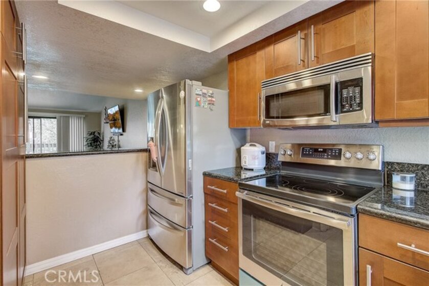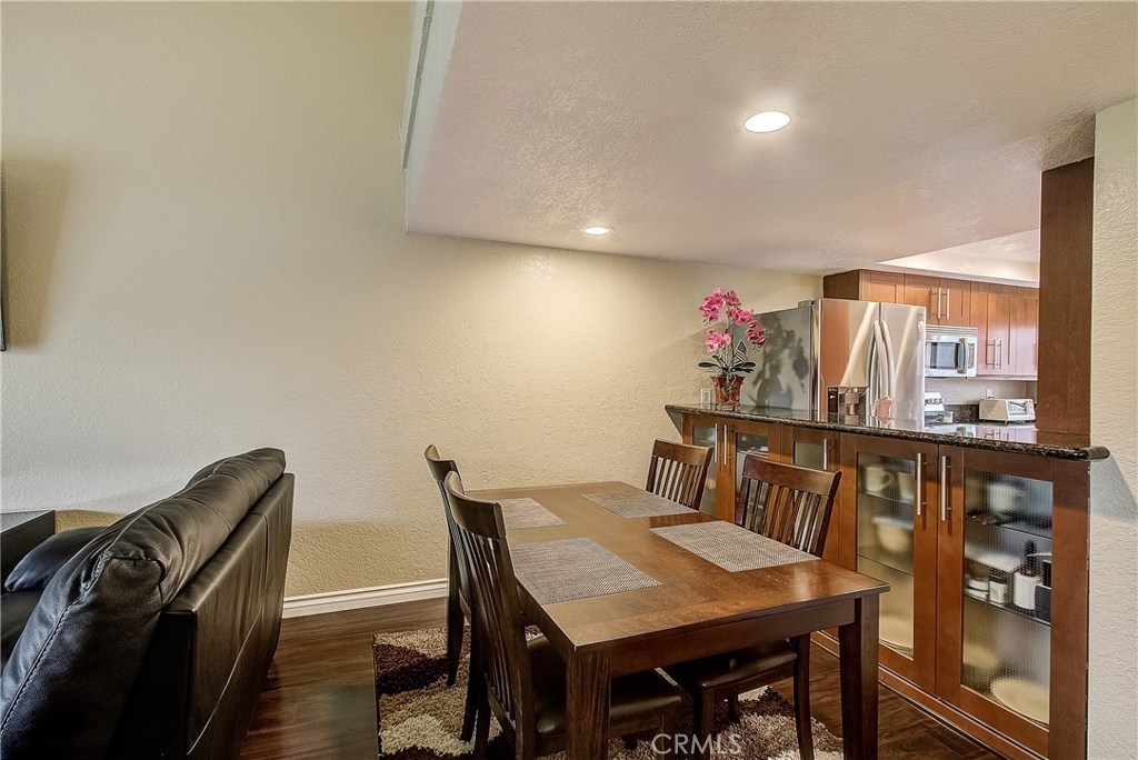 This upgraded, upper-level condo located in the gated Greenhouse West community of Garden Grove is truly turnkey! Rich hardwood floors and vaulted ceilings throughout complement the bright and open floorplan. The upgraded kitchen is well-appointed with granite counters, stainless steel appliances and a breakfast bar with plenty of storage space that opens to the dining area. The dining area seamlessly flows to the living room with light-catching sliding doors to the spacious and private balcony. Just off the living room, double doors open to a spacious bedroom with vaulted ceilings. Down the hall is a secondary bedroom adjacent to the full hall bathroom. Upstairs, the master suite boasts dual closets and an en-suite bathroom with a granite-topped vanity and a walk-in shower. Also featuring a convenient indoor laundry closet. Enjoy the nearby community pool and spa. Welcome home!