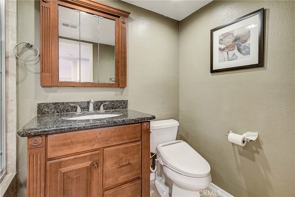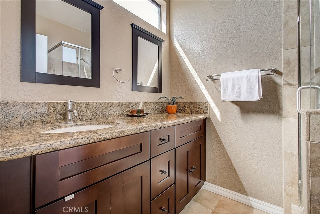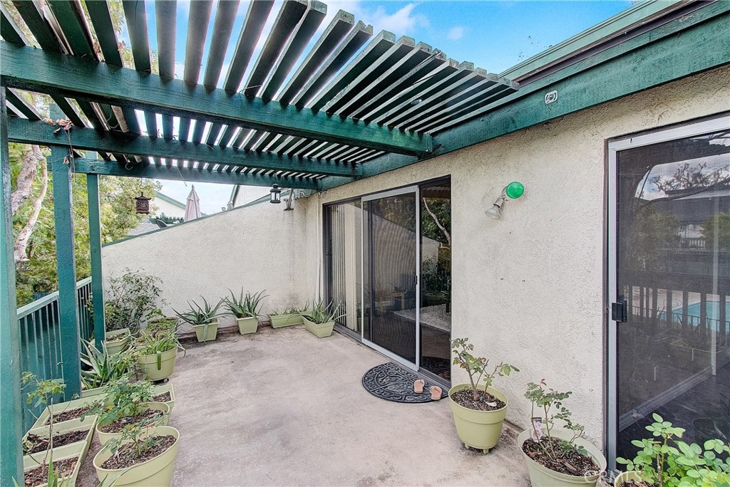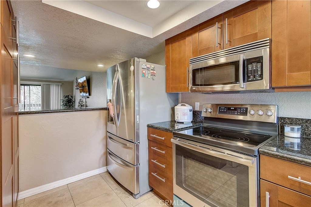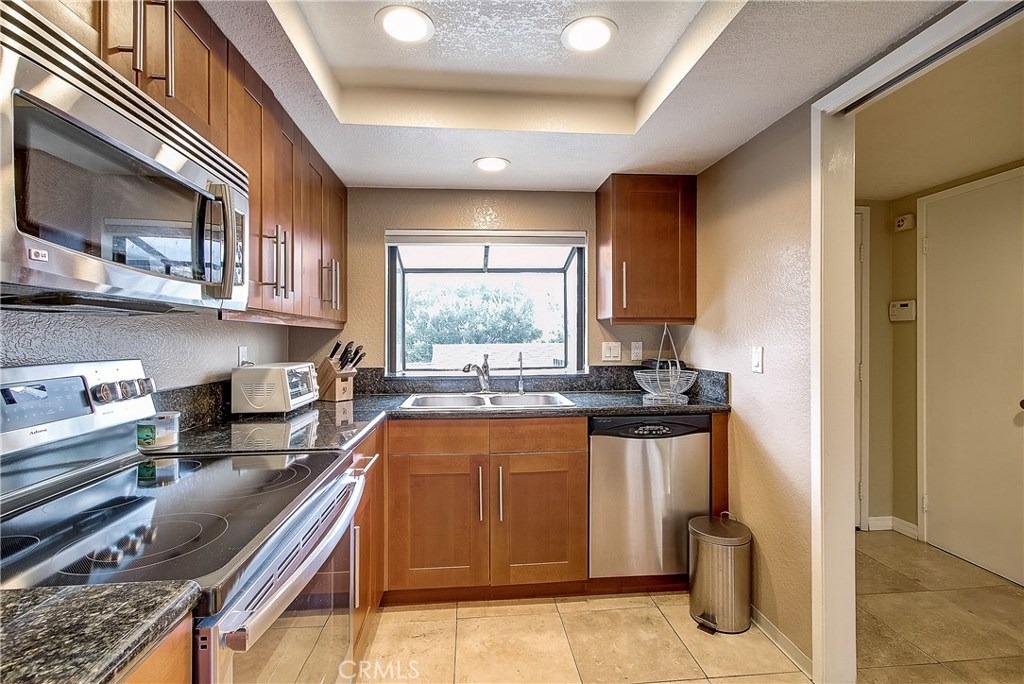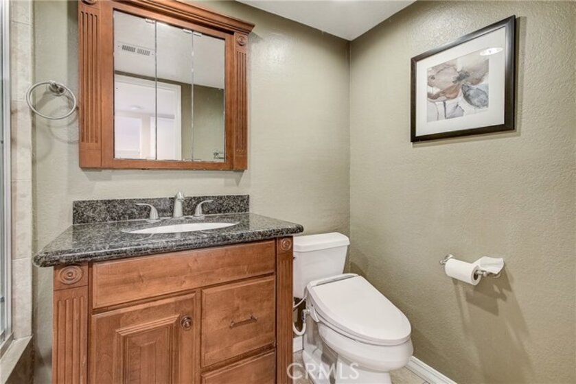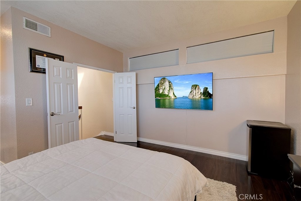 This upgraded, upper-level condo located in the gated Greenhouse West community of Garden Grove is truly turnkey! Rich hardwood floors and vaulted ceilings throughout complement the bright and open floorplan. The upgraded kitchen is well-appointed with granite counters, stainless steel appliances and a breakfast bar with plenty of storage space that opens to the dining area. The dining area seamlessly flows to the living room with light-catching sliding doors to the spacious and private balcony. Just off the living room, double doors open to a spacious bedroom with vaulted ceilings. Down the hall is a secondary bedroom adjacent to the full hall bathroom. Upstairs, the master suite boasts dual closets and an en-suite bathroom with a granite-topped vanity and a walk-in shower. Also featuring a convenient indoor laundry closet. Enjoy the nearby community pool and spa. Welcome home!