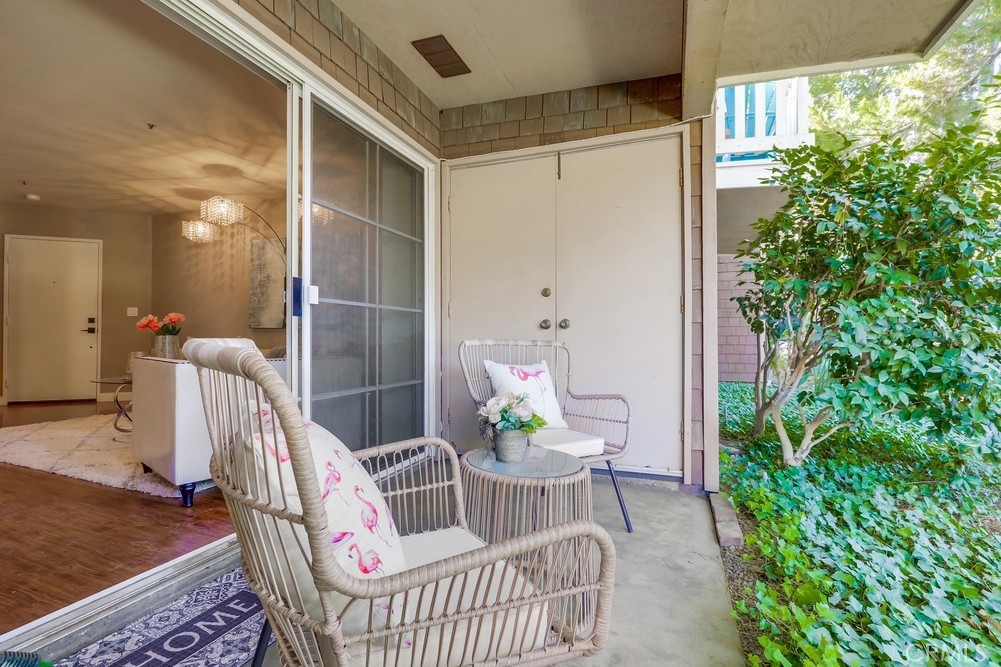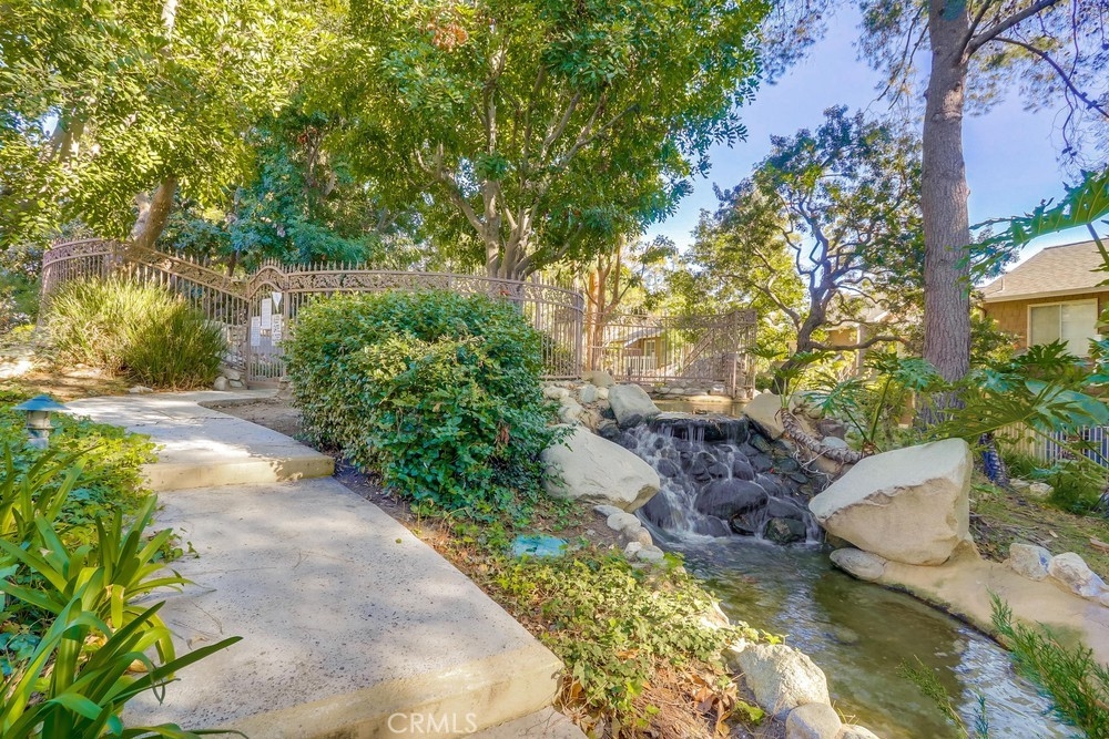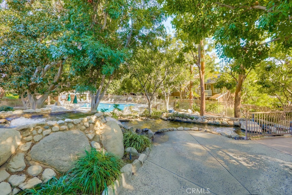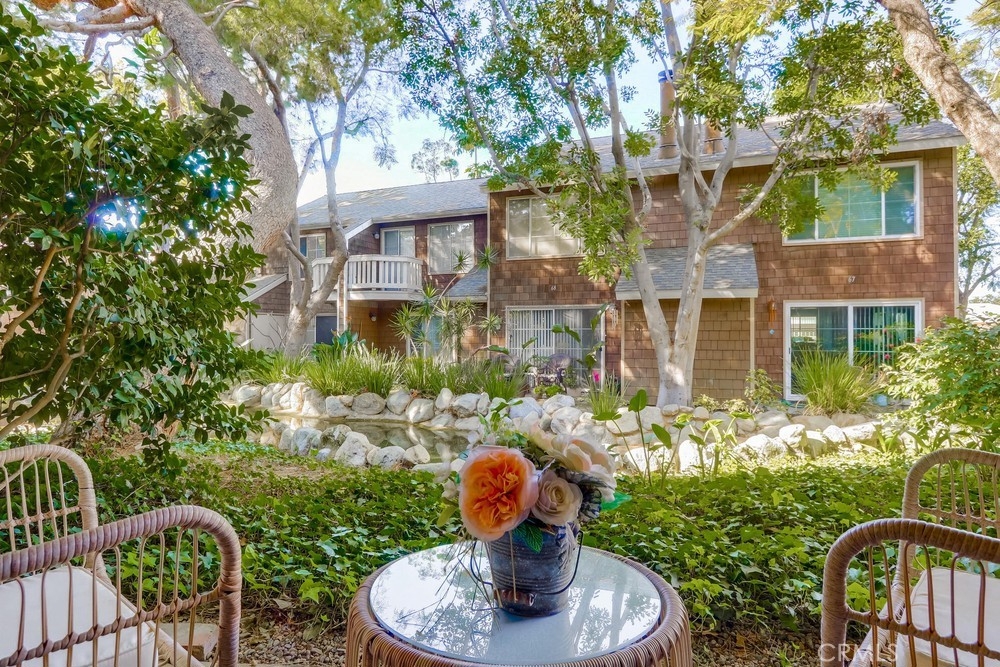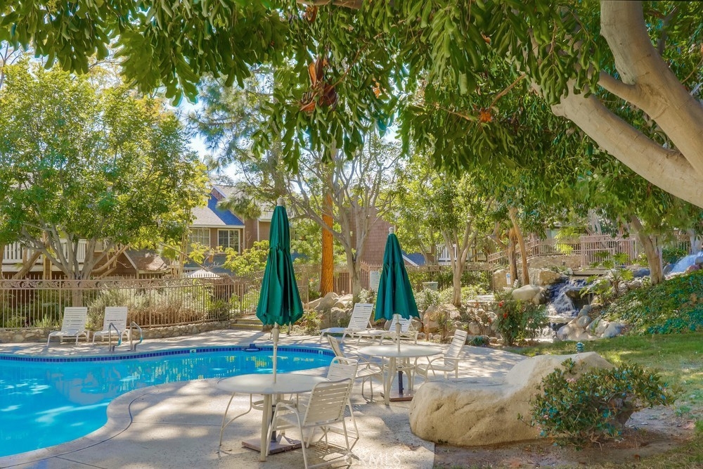 Highly desired and rare to find lower level, end-unit in the Lake Grove Community! Enter the home and immediately take in the view of lush greenery and a soothing stream. Open the large sliding glass door to relax under the covered patio while drinking your coffee or wine! Inside is an open floor concept with the living room open to the dining area and kitchen through the bar-counter window. Updated flooring and baseboards throughout. The kitchen takes on a contemporary appearance with wood laminate cabinets, recessed lighting and stainless-steel appliances, which are staying with the property. The elevated microwave gives more counter space, and the refrigerator has a connected water line for drinking-water and ice. The sink has a pull-away faucet for convenience and there’s a floor-to-ceiling pantry too! The bedroom has mirrored closet doors and leads to the remodeled bathroom. The vanity is newer with a quartz counter and framed mirror. The bathroom has been modernized with a new sliding glass shower door, pull-away showerhead, and also has a built-in storage cabinet. This unit also includes a washer & dryer, located in the patio area, as well as a 2-car garage with two interior storage spaces. You’ll also keep cool in the summer with Central AC, or you can take a dip in the community pool. The Association includes the pool, spa, maintenance of grounds and water features, as well as water and trash. This residence is also close to the 22 fwy, 5 fwy, restaurants and shops!