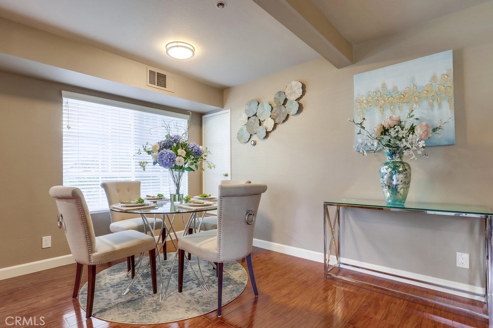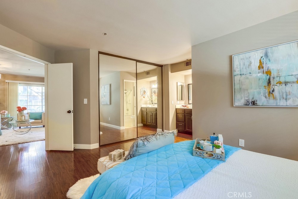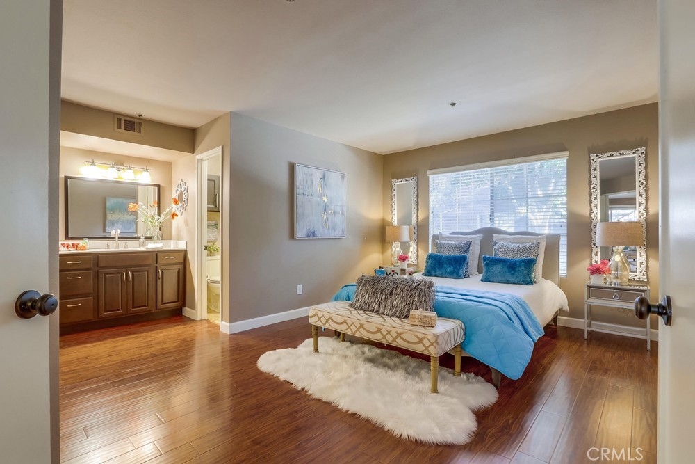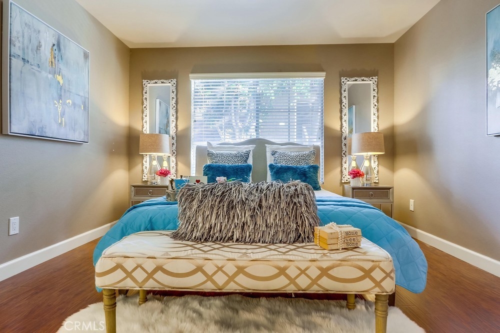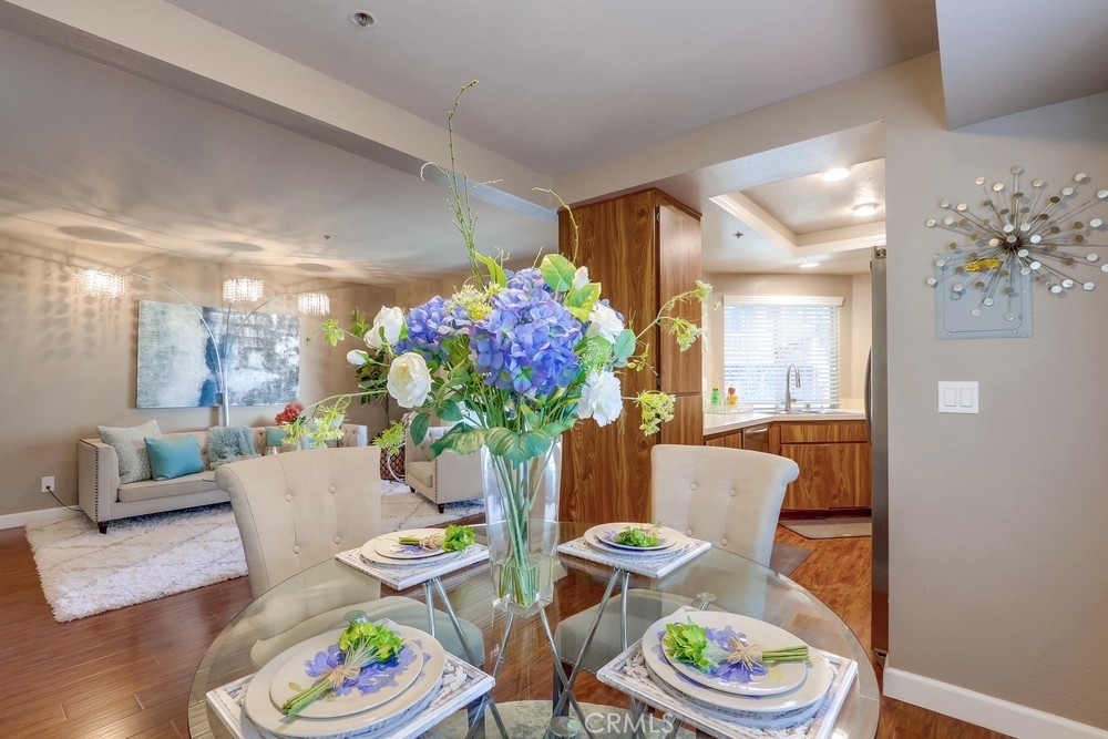 Highly desired and rare to find lower level, end-unit in the Lake Grove Community! Enter the home and immediately take in the view of lush greenery and a soothing stream. Open the large sliding glass door to relax under the covered patio while drinking your coffee or wine! Inside is an open floor concept with the living room open to the dining area and kitchen through the bar-counter window. Updated flooring and baseboards throughout. The kitchen takes on a contemporary appearance with wood laminate cabinets, recessed lighting and stainless-steel appliances, which are staying with the property. The elevated microwave gives more counter space, and the refrigerator has a connected water line for drinking-water and ice. The sink has a pull-away faucet for convenience and there’s a floor-to-ceiling pantry too! The bedroom has mirrored closet doors and leads to the remodeled bathroom. The vanity is newer with a quartz counter and framed mirror. The bathroom has been modernized with a new sliding glass shower door, pull-away showerhead, and also has a built-in storage cabinet. This unit also includes a washer & dryer, located in the patio area, as well as a 2-car garage with two interior storage spaces. You’ll also keep cool in the summer with Central AC, or you can take a dip in the community pool. The Association includes the pool, spa, maintenance of grounds and water features, as well as water and trash. This residence is also close to the 22 fwy, 5 fwy, restaurants and shops!