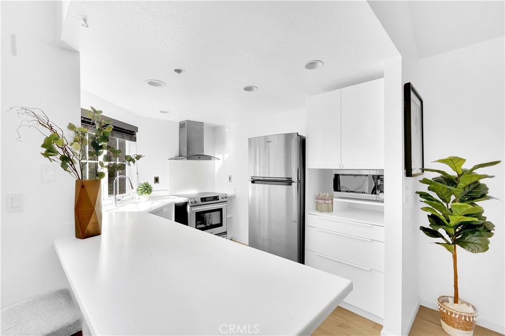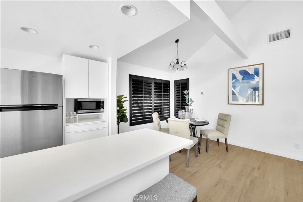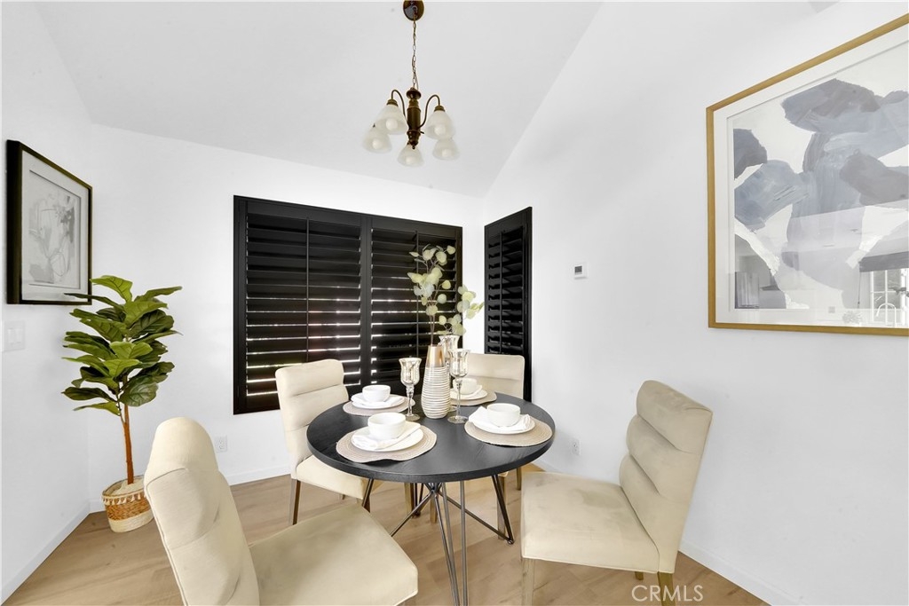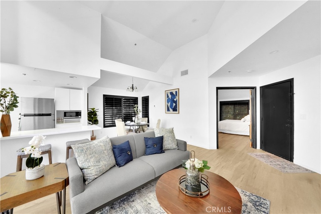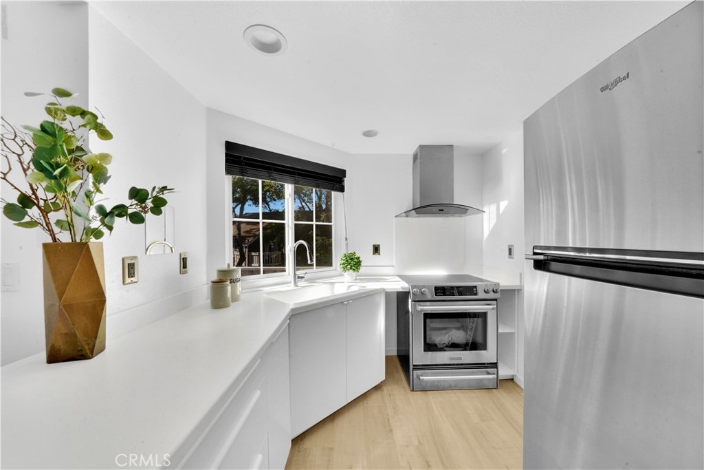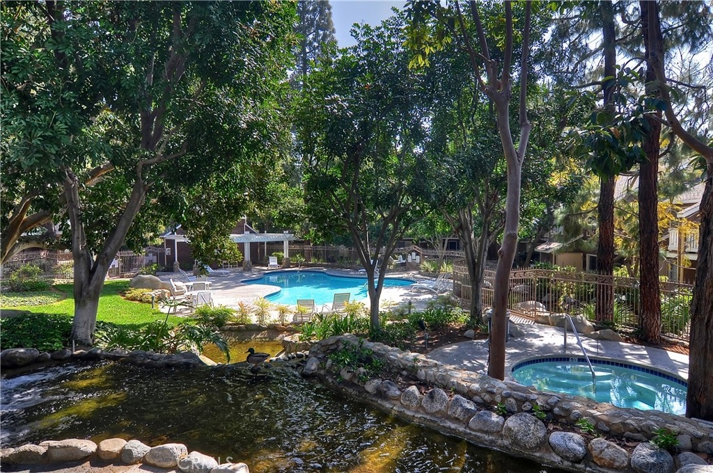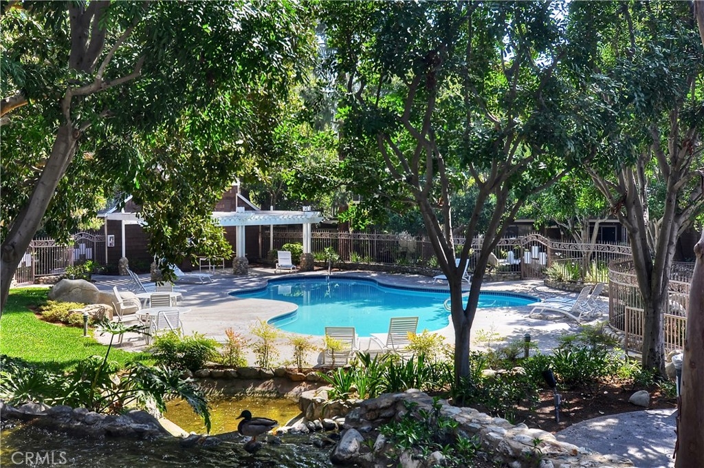 Move-In Ready 1-Bedroom Condo in Serene Lake Grove Gated Community! This rare upgraded end-unit condo offers a peaceful, private setting in the gated Lake Grove Condos. Nestled among lush landscaping with tranquil creeks and ponds, this spacious 1-bedroom, 1-bathroom home features an open concept layout with cathedral ceilings that fill the space with natural light (extra window on end unit) and has newer stylish Pergo Timber Craft flooring throughout. The large family room is enhanced by plantation shutters and flows seamlessly into a newly remodeled kitchen boasting sleek countertops and soft-close drawers. The generously sized bedroom includes a custom-built closet with ample storage. Enjoy year-round comfort with a recently installed American Standard heat pump for central A/C and heating.The unit also includes a detached 2-car garage with extra storage, an in-unit laundry area with washer and dryer included, and a private patio overlooking the soothing sounds of a bubbling brook. Community amenities include a beautiful pool and spa set amidst serene creeks, ponds, and waterfalls. Conveniently located within walking distance to Ralston Junior High, Garden Grove High School, Costco, and Dalat Supermarket. Low HOA dues cover water and trash. Easy access to freeways and local restaurants. Don’t miss this rare opportunity – schedule your tour today!