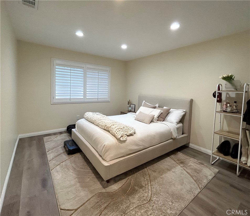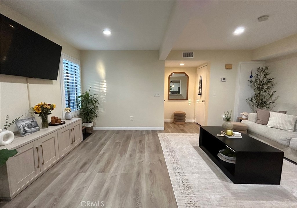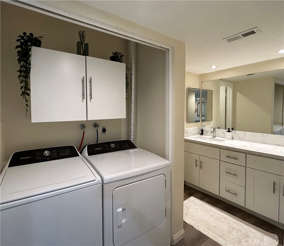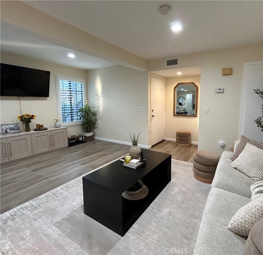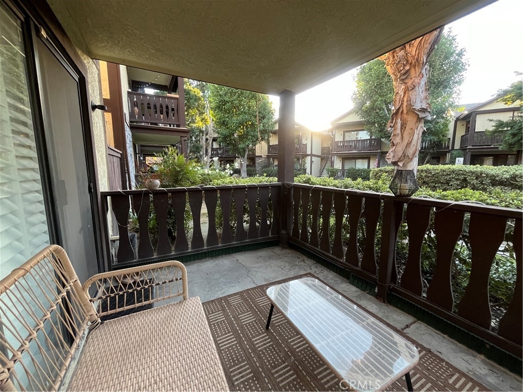 Charming ground-level condo in the gated Les Jardins community. Featuring 1 bedroom, 1 bathroom, kitchen with Quartz counter top and hardwood flooring all appliances are included :Fridge, stove, microwave ,dishwasher washer and dryer, molding and baseboard.Open floor plan concept with recess lights and abundance of sunlight.Spacious master bedroom with walk-in closet. Beautiful Bathroom ,Large patio off main living room perfect for your morning coffee or afternoons barbecues while enjoying watching the green belt trees .Breakfast area. Convenient inside laundry closet ,washer and dryer machines are included in the sale of the property.Detached spacious 2-car garage (#145) near the unit. Community features 2 pools and spa, clubhouse, lush landscaping and tranquil streams throughout. HOA covers trash, water, and common area. Convenient access to Freeways 22, 5, and 57. Near the Outlets at Orange and Disneyland Park. This property wont last .