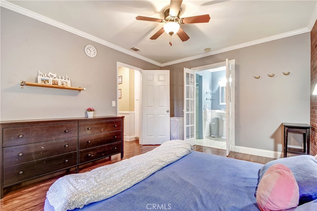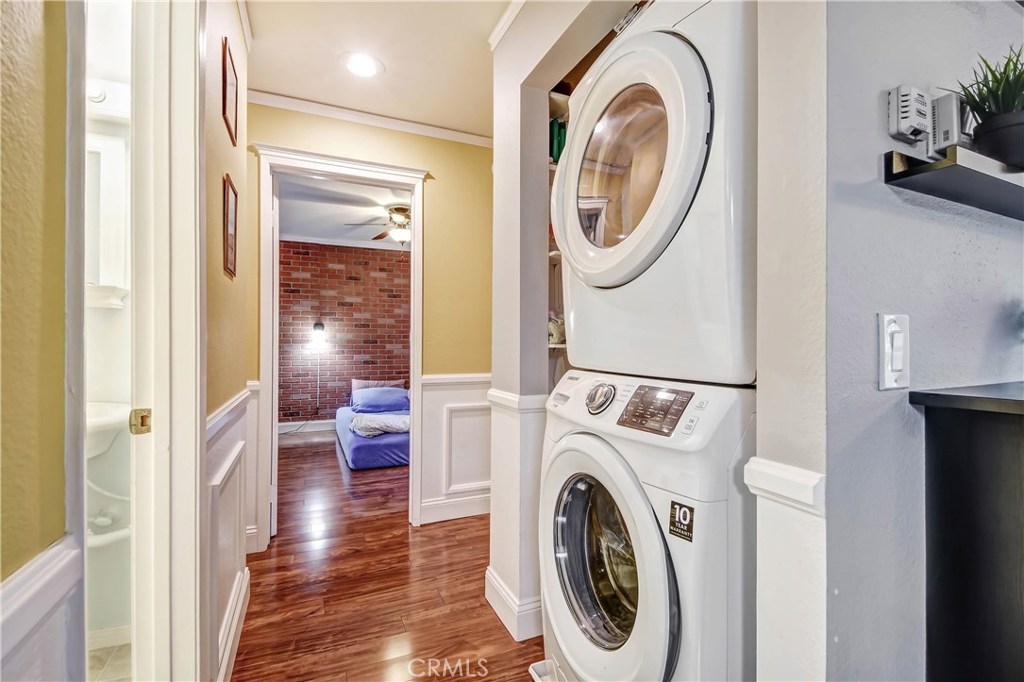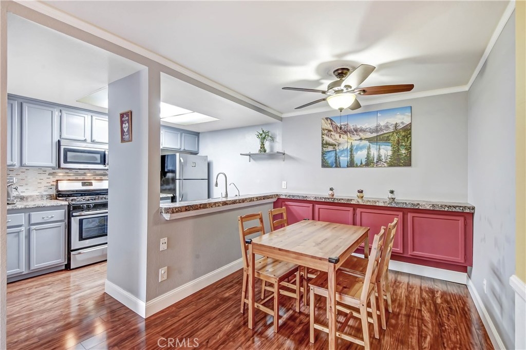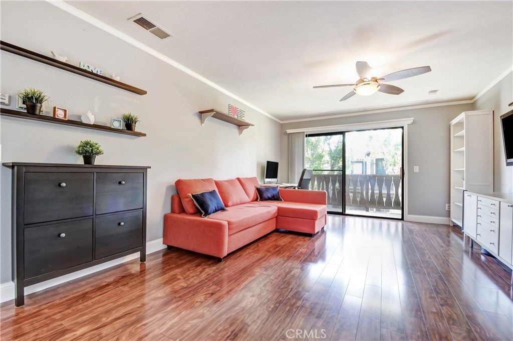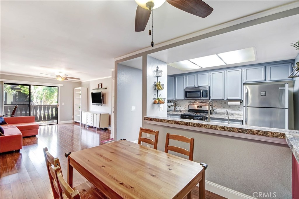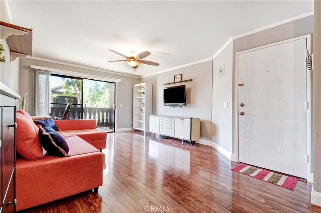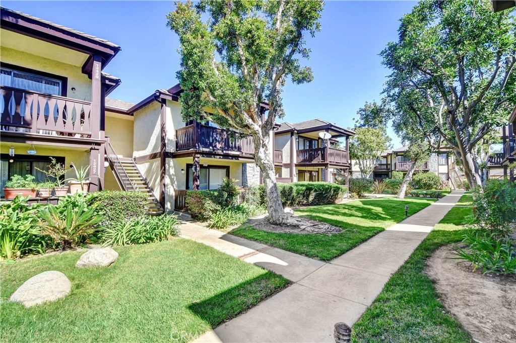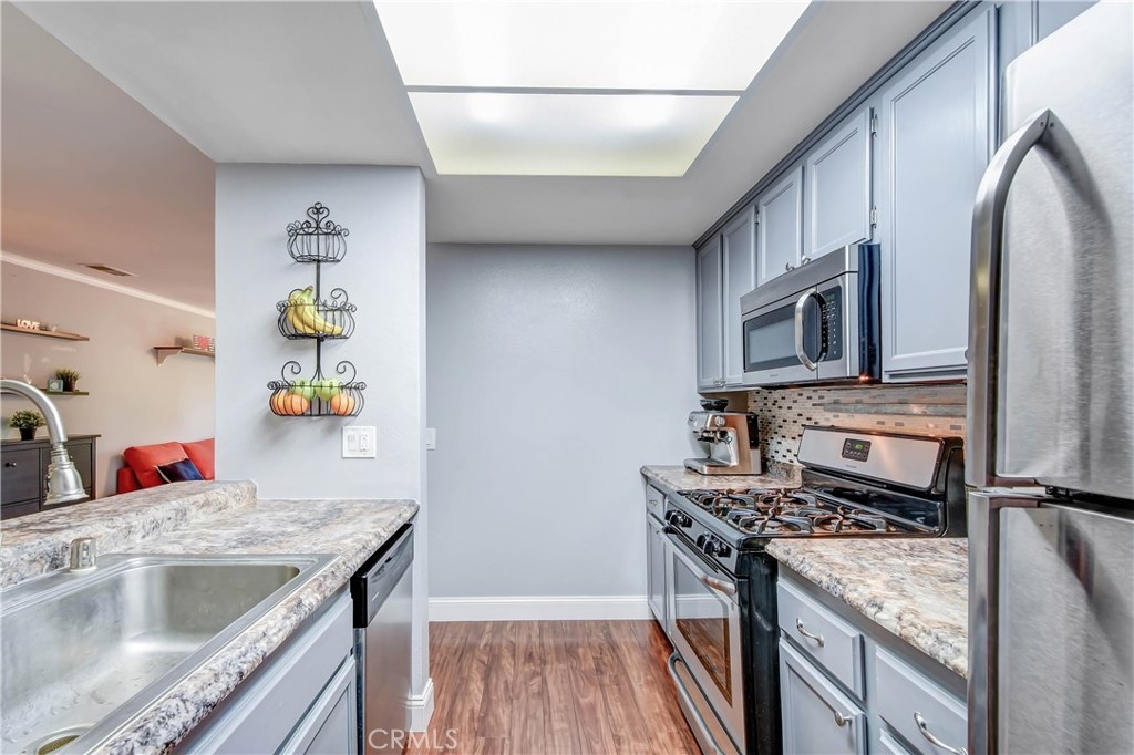 Come fall in love with this fully remodeled 2 bedroom, 2 bathroom condo with a 2 car garage that has built-in storage. This move-in ready home is located on the top level floor in the beautiful, gated community of Les Jardins. Enjoy the homes upgrades that include: upgraded countertops in the kitchen, newer stainless steel appliances, newer kitchen sink & faucet, tile backsplash, remodeled bathrooms, premium wood laminate flooring, tiled bathrooms, walk-in closet, 2 balconies one off the master bedroom and living room, central Air Conditioning and ceiling fans in every room, crown molding, wide baseboards, chair rail in the hallway. Wainscot paneling, french doors, radiant barrier insulation in attic for temperature control. The community features: 2 sparkling swimming pools, Jacuzzi /spa, clubhouse with showers and restrooms, beautiful lush landscape with tranquil ponds and waterfalls. Convenience location factor near the 22 and 5 freeways. Come and view, this home won't last!