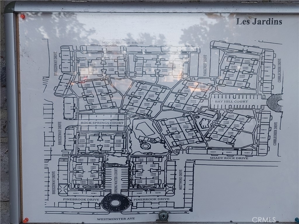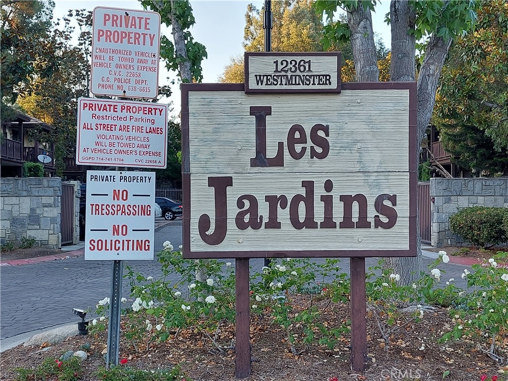 Charming ground-level condo in the gated Les Jardins community. Featuring 2 bedrooms, 2 bathrooms, kitchen with Quartz counter top and marble flooring, molding and baseboard. Living room with tile flooring. Spacious master bedroom with walk-in closet. Beautiful bathroom with mosaic tile design on shower walls. Large patio off main living room and a second patio off the master bedroom. Convenient inside laundry closet with stacked washer dryer. Detached spacious 2-car garage (#48) near the unit. Community features pool and spa, clubhouse, lush landscaping and tranquil streams throughout. HOA covers trash, water, and common area. Convenient access to Freeways 22, 5, and 57. Near the Outlets at Orange and Disneyland Park. Discounted mortgage rates with Community Lending Program through select lenders may be available for Qualified Buyers.