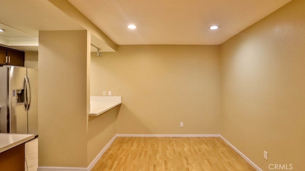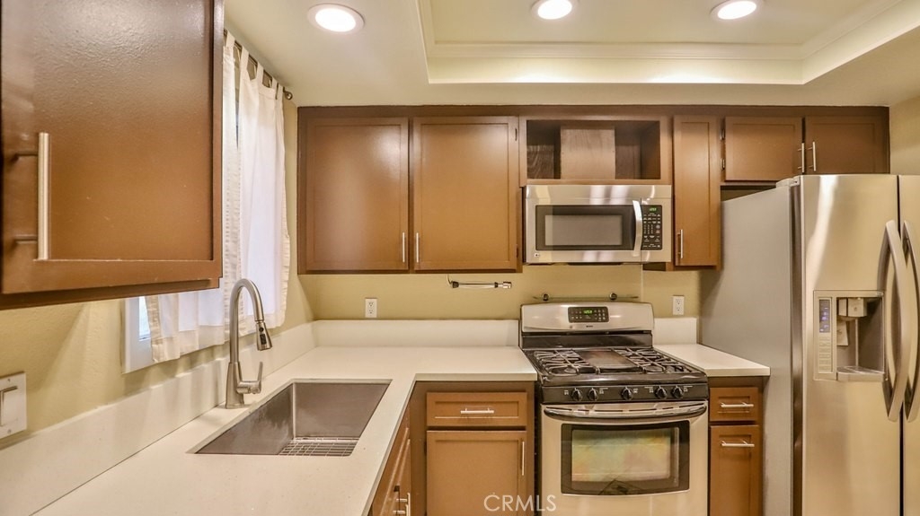 This well-appointed lower level condo features an open floor plan with wood laminate flooring throughout. The living room opens to a large frontpatio deck which gives the property a feeling of indoor outdoor living; there is a second side patio which is accessible from master bedroom. Nicely upgraded kitchen with quartz counter tops, stainless steel appliances and tile floors, the bathroom has also been updated with matching countertops. The unit has an inside laundry closet with full size stackable washer/dryer(Washer & Dryer included with the sale). Recessed lighting throughout the unit. The master bedroom has a custom closet! The detached 2 car garage has plenty of shelving and rafter storage with a 3rd parking spot available through a permit included in HOA. Your buyers will enjoy the serenity of the babbling creek that runs through the complex and 2 swimming pool areas for summer fun! Walking distance of schools and churches! This is a pride of ownership property.