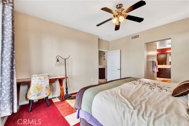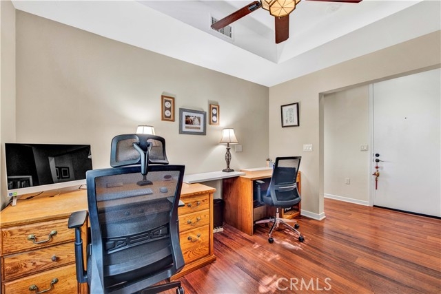 Welcome home to Luxury living. Built 2007. 2 Master Suite+ Den, 3 Baths, 1677 Sqft of living area! The 3rd room currently used as an Office. This property has tons of natural bright light. You will love the open floor plan with oversized living room set up for wall mount Flat screen, all cables run inside the wall and dining area. Quartz kitchen countertops and beautiful rich dark wood cabinets and tile backsplash. Spacious center island with breakfast bar, under cabinet lighting. Hardwood flooring throughout. This gorgeous Master suite has luxury carpet with breathtaking views and wraparound balcony. Bathroom featuring a spa-like tub and separate shower with glass wall, walk in closet, dual vanities with dark rich espresso cabinets. 2nd suite also has luxury carpet with full bathroom and walk-in closet. Ceiling Fans in all rooms. *This home has plenty of storage throughout. Laundry room that fits full size side by side washer and dryer with cabinets that makes your laundry days easy. Brand new water heater. This condo also has a very large tandem parking garage with workbench space. Gated access. Plenty of guest parking. Security Camera throughout building and community. Luxury heated Pool, Spa & BBQ with outdoor seating and fireplace. Monthly HOA covers Water, Trash, and Exterior Landscape and Maintenance. access to freeways, Shopping, fine dining, Great wolf lodge, Disneyland Resort. Heart Of OC. Cannot list them all. Make it a must see