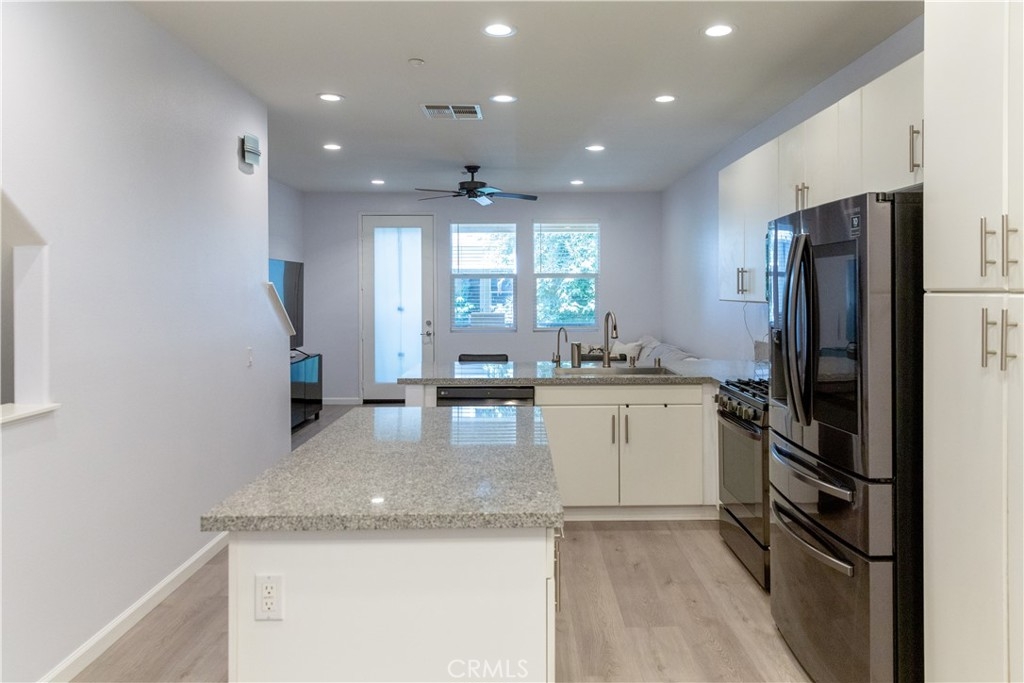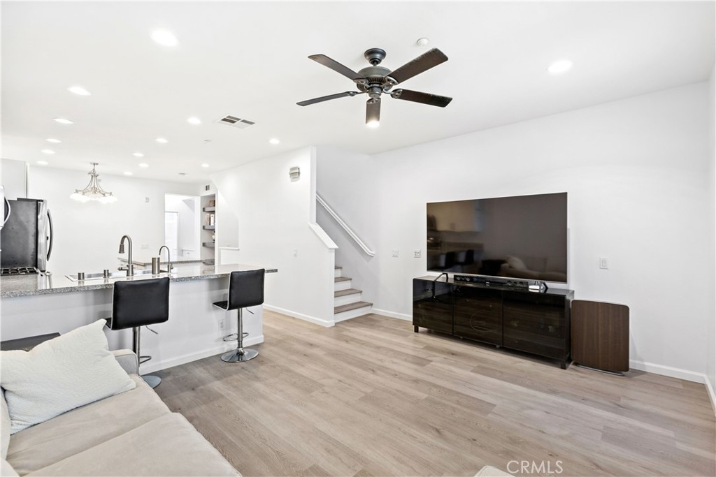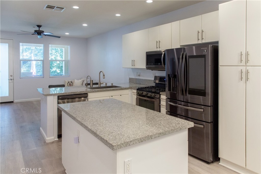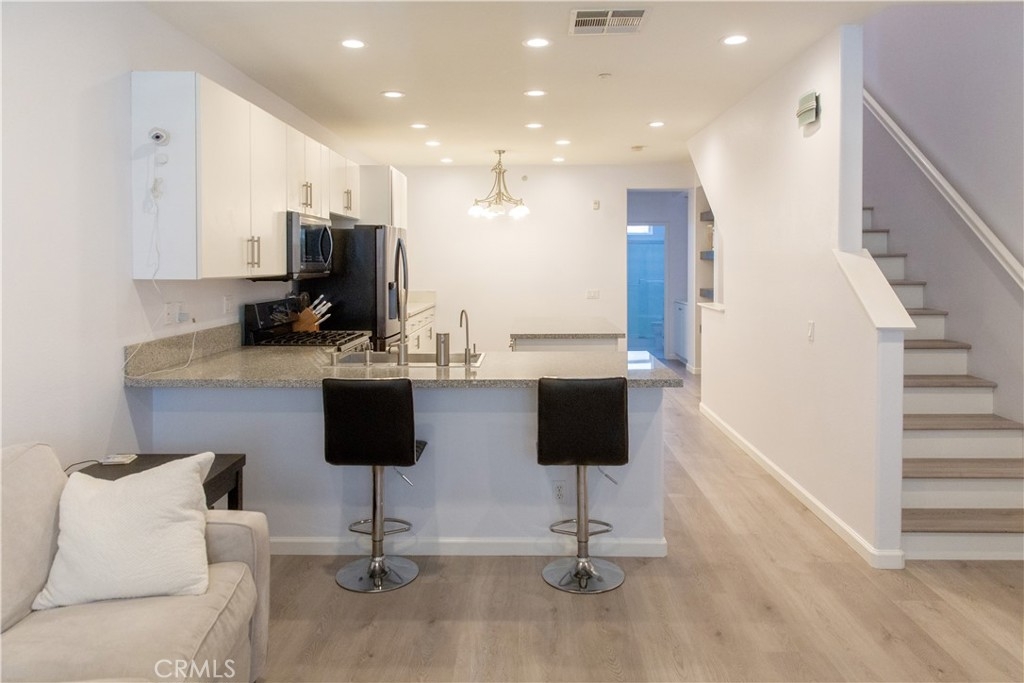 Welcome home! This beautifully remodeled tri-level townhouse features 1,507 sqft of living space, 3 bedrooms and 3 full bathrooms. This is the only section in the community with a front courtyard—complete with a calming lawn and a water feature. Upon entry you’ll notice newly installed waterproof vinyl laminate floors that lead into the kitchen on the second floor. The kitchen is complemented by a dining area, granite countertops, pantry cabinets/shelves, breakfast bar, large island and Reverse Osmosis under the sink. Appliances include a stainless-steel dishwasher, gas range, and microwave. The family/living room is located directly across the kitchen and leads to an outdoor patio, perfect for a personal barbecue and entertaining guests. Off of the kitchen is a sizable bedroom and newly remodeled full bathroom. Upstairs consists of a laundry room, junior master bedroom with walk-in closet and newly remodeled bathroom and a master bedroom with en-suite. The master en-suite consists of dual vanity sinks, large walk-in shower, privacy toilet; and best of all, an Amazon Alexa Bluetooth speaker fan to sing along to your favorite tunes. The house also consists of LED recessed lighting, dual-pane windows, brand new toilets and vanities in all the restrooms, tankless water heater, Smart EcoBee Thermostat, central a/c and heating. HOA covers all grounds maintenance, water, trash, community pool, spa, and BBQ area. The community is also centrally located near to freeways, multiple shopping centers, restaurants and best of all 2 miles from Disneyland! Do not miss out on this opportunity!