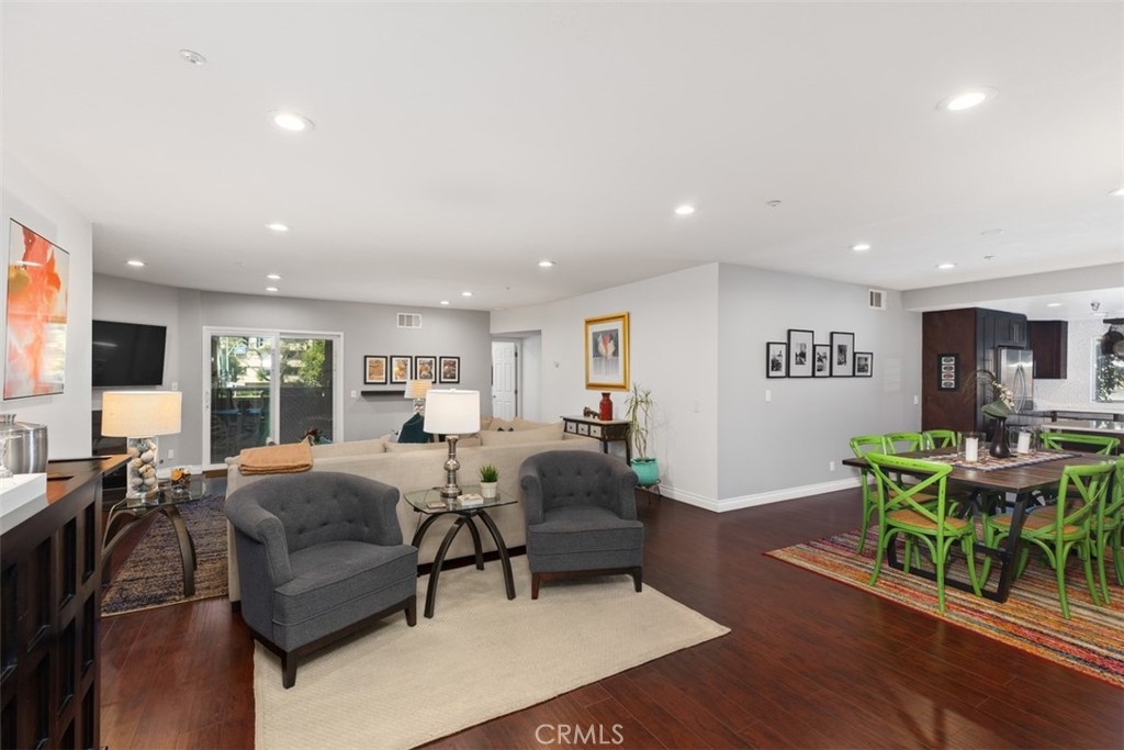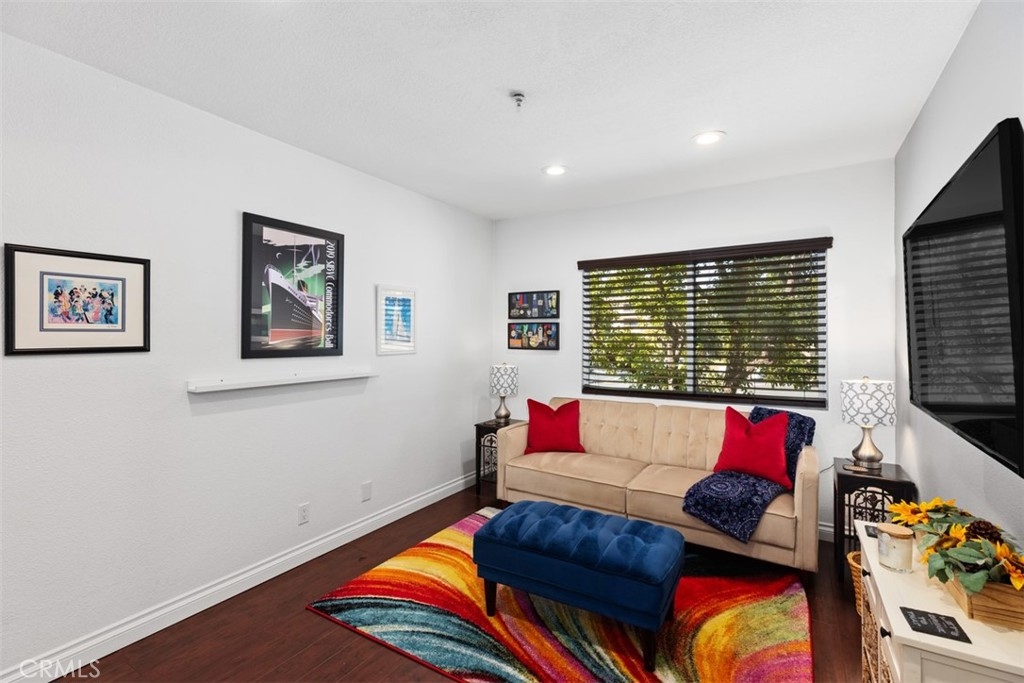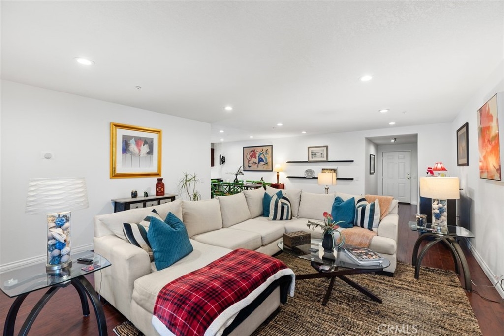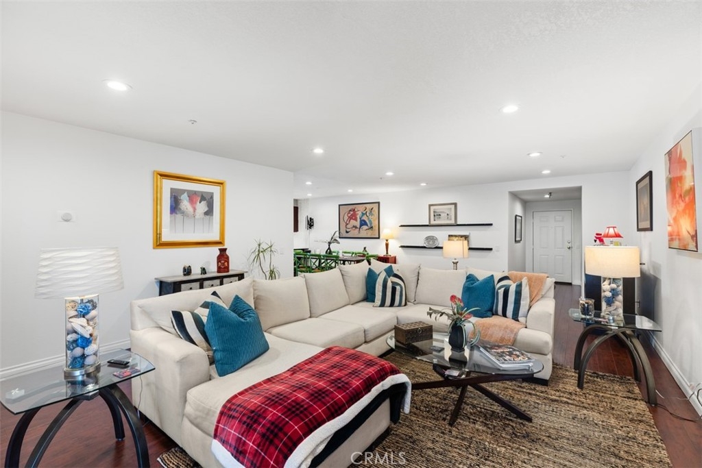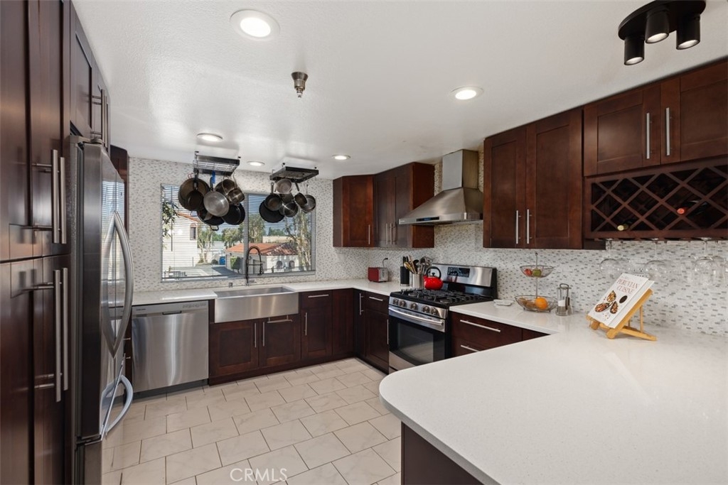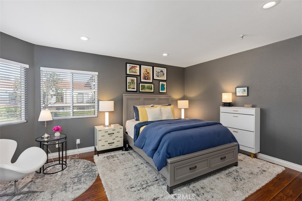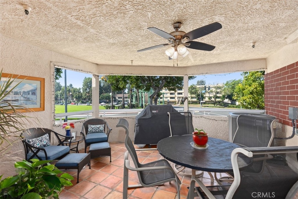 Instantly Appealing! Lovely, Single level, 3 Bedroom, 2 bath condo, located in the Martinique Royale community. This Beautiful end unit is surrounded by natural light and has been extensively renovated--the largest floor plan in a small community of only 22 homes. Approximately $75,000 in upgrades within the last 7 years---All new vinyl dual pane windows, renovated kitchen and bathrooms, HVAC system (3 yrs old), scraped ceilings, raised baseboards, wood laminate flooring throughout, recessed lighting with programmable Lutron dimmer switches, upgraded electrical panel + More! Spacious, Modern kitchen with breakfast bar, quartz countertops, mosaic backsplash, espresso finish cabinetry, Stainless steel appliances, deep stainless farmer’s sink, and hanging pot racks. Refrigerator and wine cooler are included! Both bathrooms have been updated with new toilets, vanities, lighting, plumbing fixtures, and tile flooring. The primary bathroom has a tile enclosed shower and jetted tub combination, and secondary bathroom has a tile enclosed walk-in shower. You will love this open concept floor plan, with Greatroom and separate dining area. Convenient indoor laundry with Washer and Dryer included. A private patio with Saltillo tile, lighted ceiling fan and views of the park is perfect for entertaining and barbecuing. An added bonus is the oversized, private storage room w/shelving. Secure, gated subterranean parking with 2 assigned parking spaces and visitor parking. Excellent location across from the 6.3 Acre Village Green Park, Tower on the Green and walking distance to Historic Main Street Garden Grove, Garden Grove High School, Public Library, Costco, Coastline Community College, restaurants and shopping. Low Association dues include Pool, Spa, Trash and all water. A Great Buy for the Money!