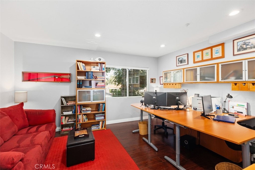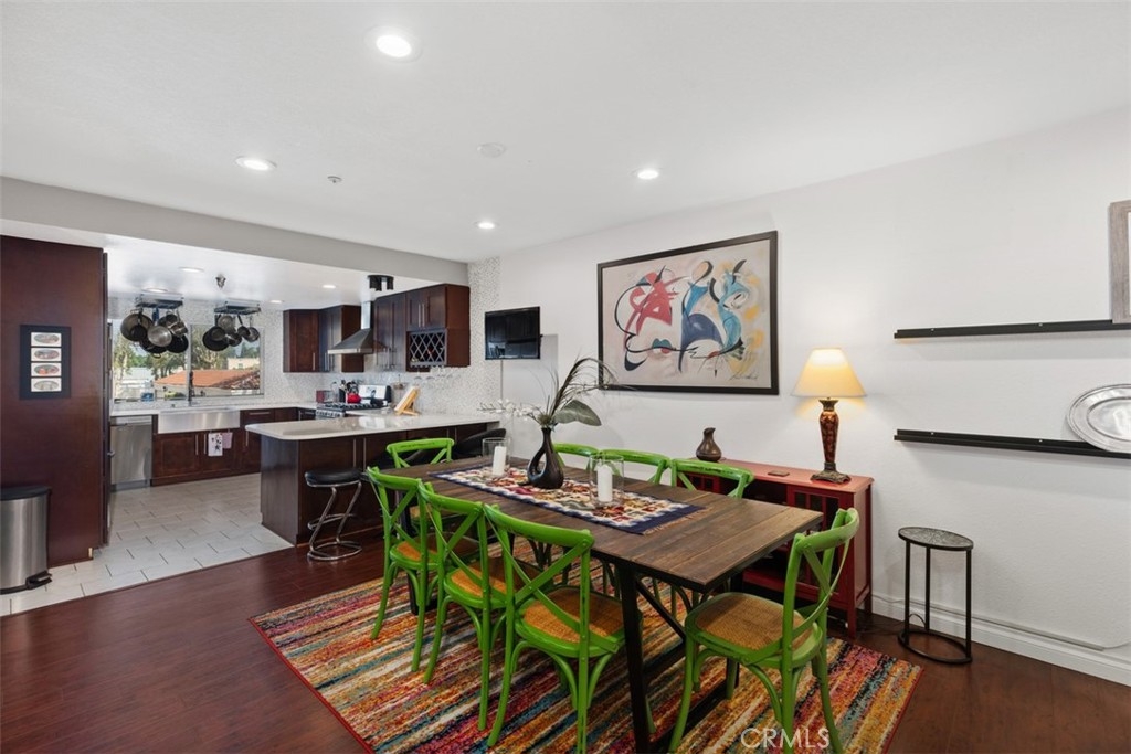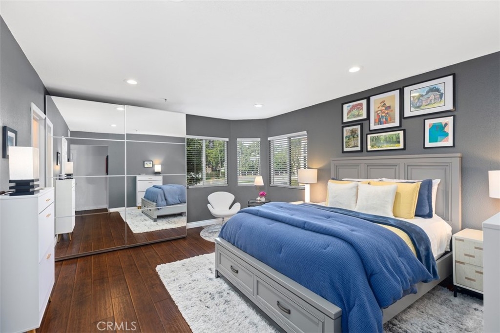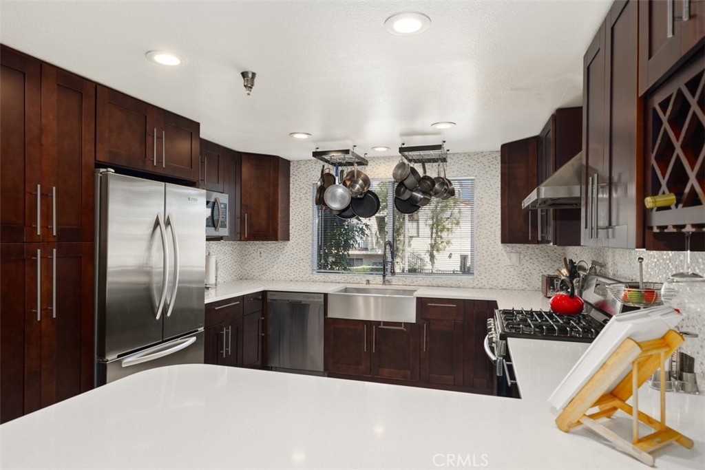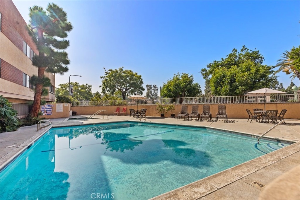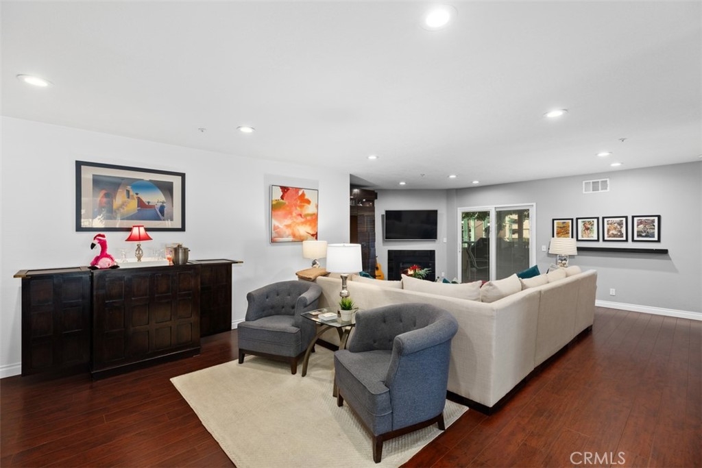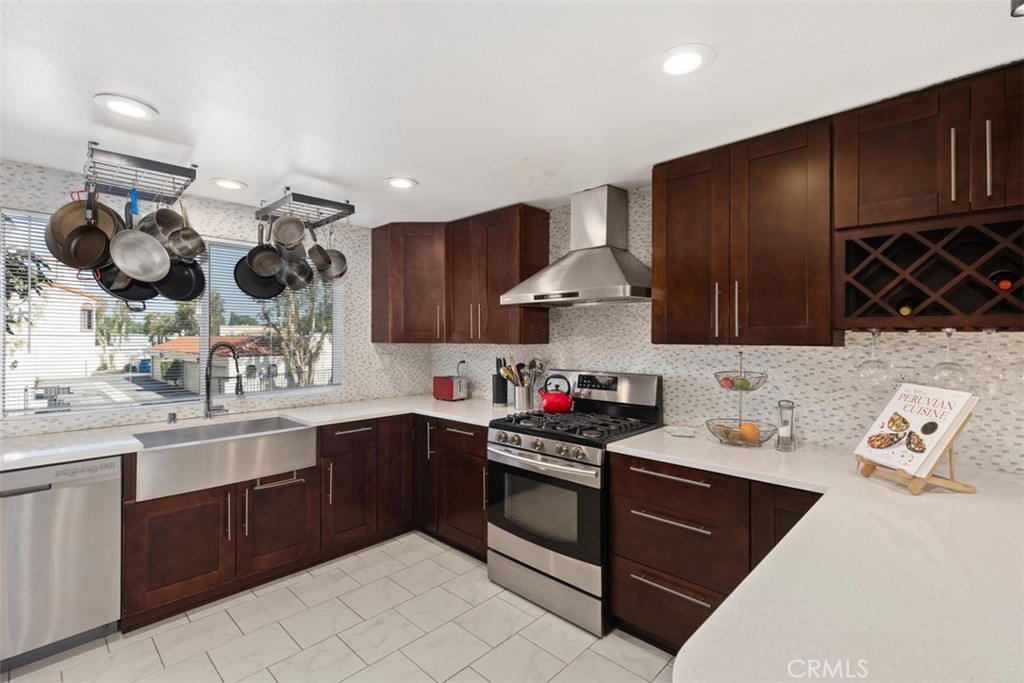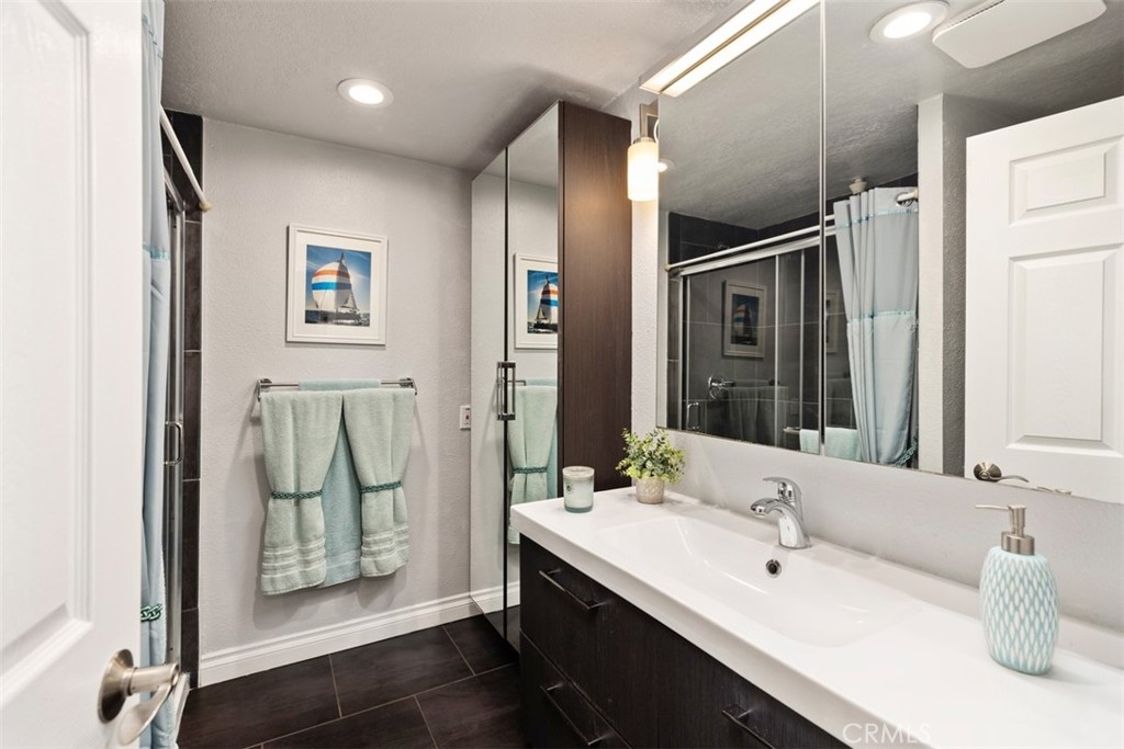 Instantly Appealing! Lovely, Single level, 3 Bedroom, 2 bath condo, located in the Martinique Royale community. This Beautiful end unit is surrounded by natural light and has been extensively renovated--the largest floor plan in a small community of only 22 homes. Approximately $75,000 in upgrades within the last 7 years---All new vinyl dual pane windows, renovated kitchen and bathrooms, HVAC system (3 yrs old), scraped ceilings, raised baseboards, wood laminate flooring throughout, recessed lighting with programmable Lutron dimmer switches, upgraded electrical panel + More! Spacious, Modern kitchen with breakfast bar, quartz countertops, mosaic backsplash, espresso finish cabinetry, Stainless steel appliances, deep stainless farmer’s sink, and hanging pot racks. Refrigerator and wine cooler are included! Both bathrooms have been updated with new toilets, vanities, lighting, plumbing fixtures, and tile flooring. The primary bathroom has a tile enclosed shower and jetted tub combination, and secondary bathroom has a tile enclosed walk-in shower. You will love this open concept floor plan, with Greatroom and separate dining area. Convenient indoor laundry with Washer and Dryer included. A private patio with Saltillo tile, lighted ceiling fan and views of the park is perfect for entertaining and barbecuing. An added bonus is the oversized, private storage room w/shelving. Secure, gated subterranean parking with 2 assigned parking spaces and visitor parking. Excellent location across from the 6.3 Acre Village Green Park, Tower on the Green and walking distance to Historic Main Street Garden Grove, Garden Grove High School, Public Library, Costco, Coastline Community College, restaurants and shopping. Low Association dues include Pool, Spa, Trash and all water. A Great Buy for the Money!