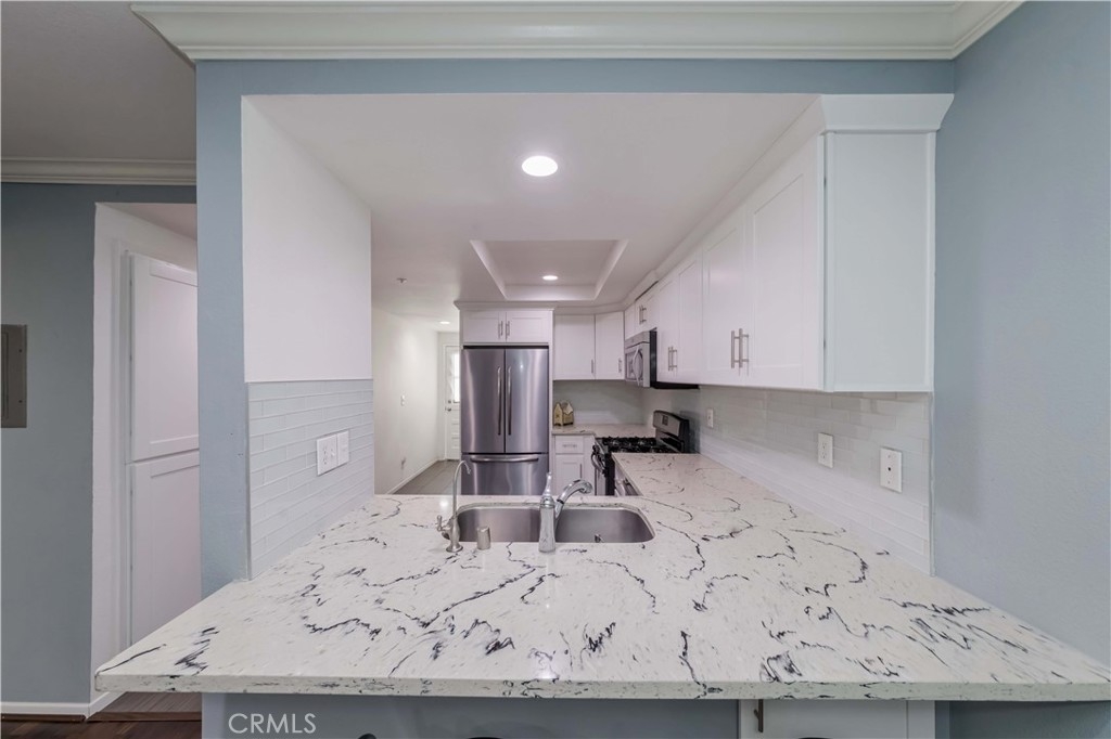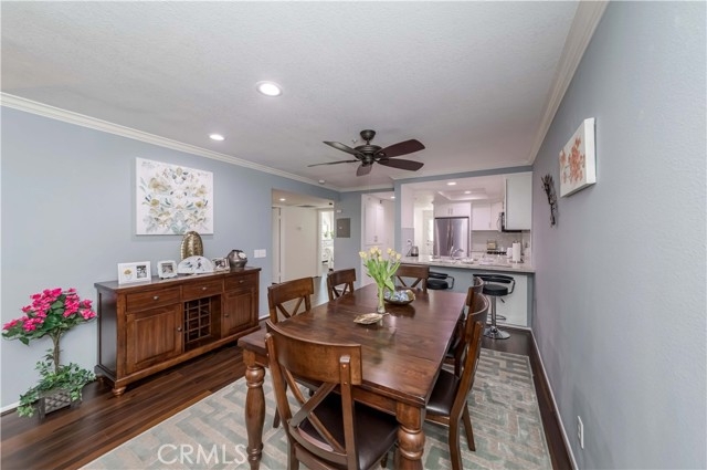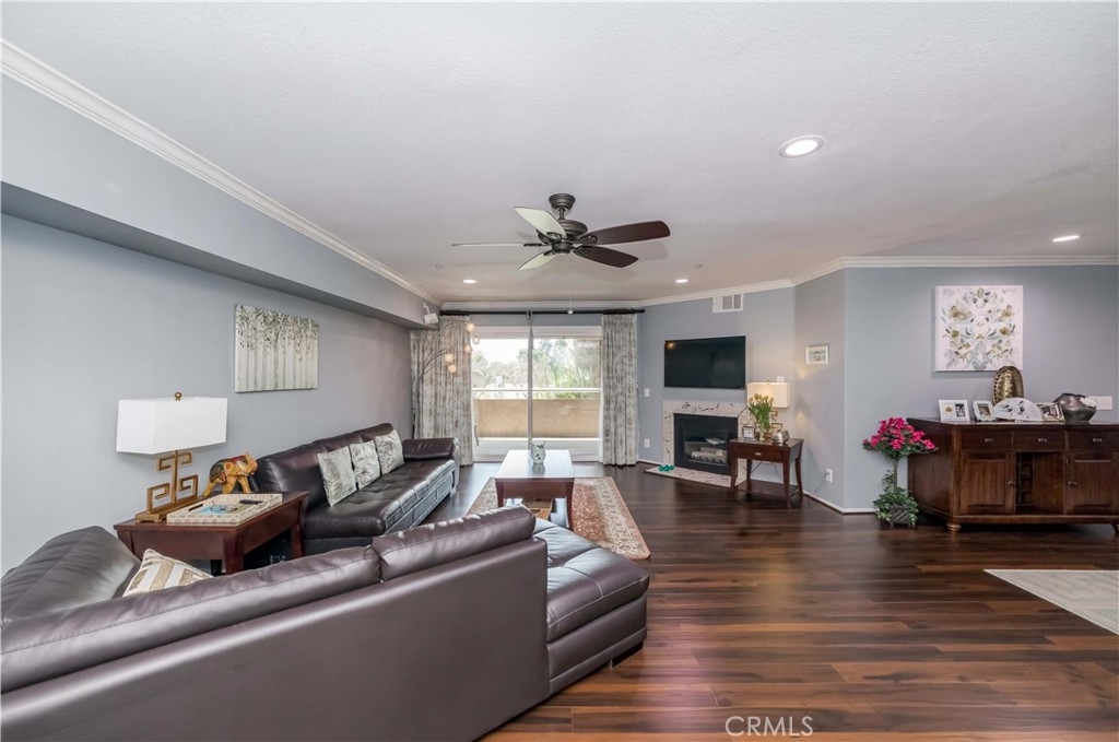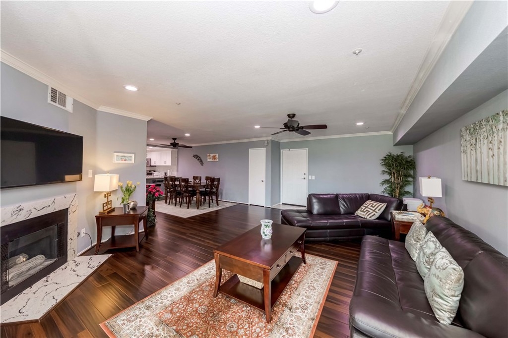 Absolutely beautiful condon in Garden Grove with 2 beds and 2 baths, this luxurious features designed to elevate your lifestyle,Step into the living room,cozy fireplace and scraped ceiling create an atmosphere of warmth,laminate flooring, crown molding and recessed lights add an extra layer of elegance to the space, perfect for both relaxation and entertaining. Gourmet kitchen with granite countertops, sleek white cabinets,and stainless steel appliances, breakfast nook, adjacent to the kitchen, the dining area excludes charm with stylish ceiling fan and ample space for hosting memorable dinners and gatherings. The master bedroom offering a serene escape with a beautiful view, walk-in closet,and access to a large patio- perfect for enjoying Ca sunshine in privacy. The second bedroom is equally impressive, offering generous space and versatility to suit your needs. Both bathroom has been remodeled with tile floors, white cabinets and granite sink tops. Convenience is key with amenities such as one story and elevator, inside washer and dryer, extra storage and A/C. With prime location within walking distance to Historic Main Street, park, cafes, restaurant, and Costco.Near Police office, fire station, city hall, library,easy access freeway 22, 405,5 makes commuting a breeze. This stunning Garden Grove condo - a place where elegance meets convenience.