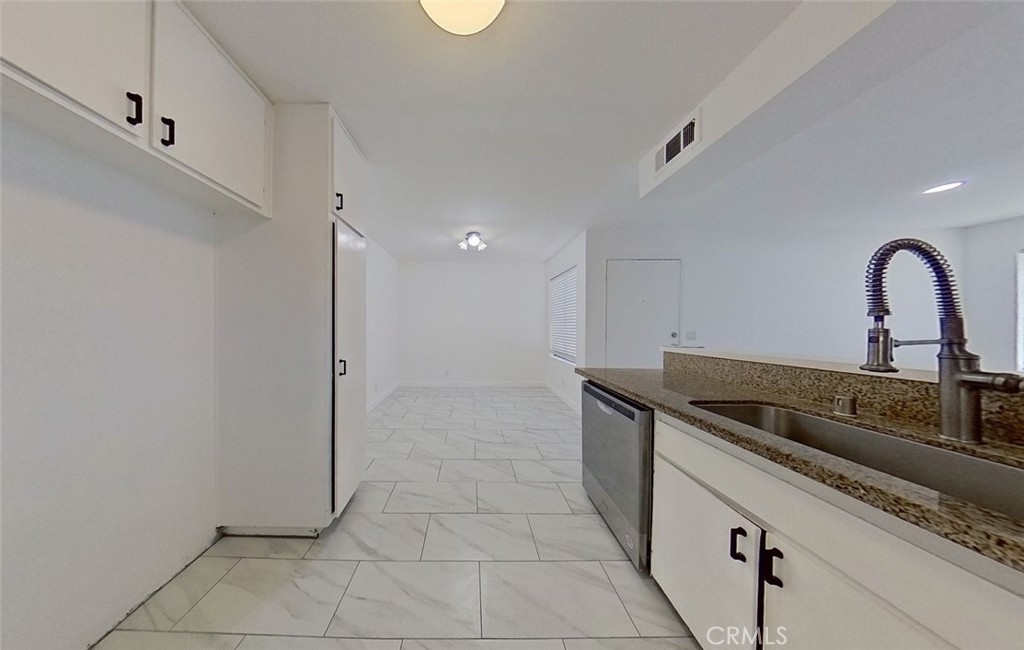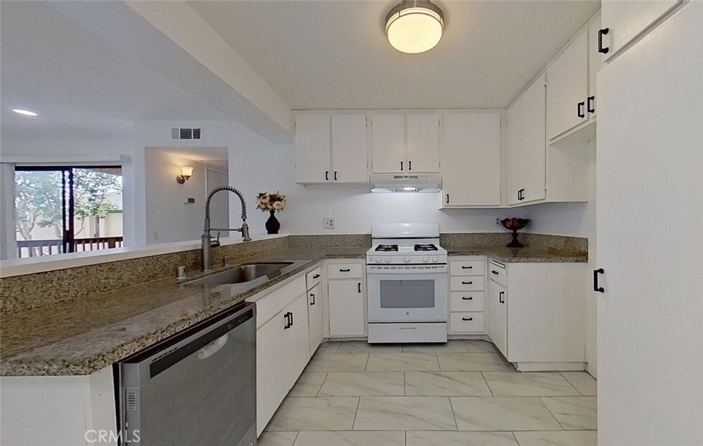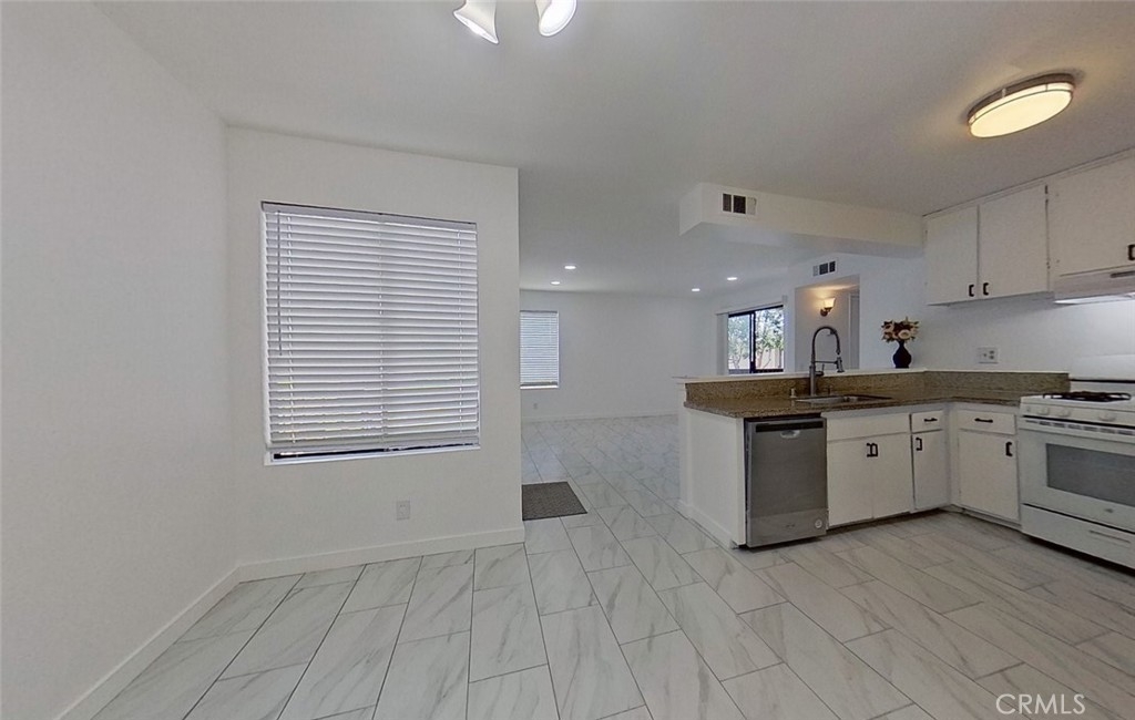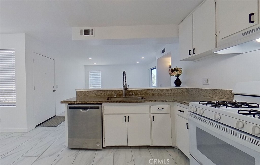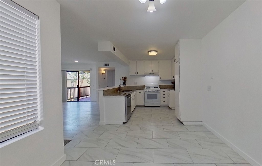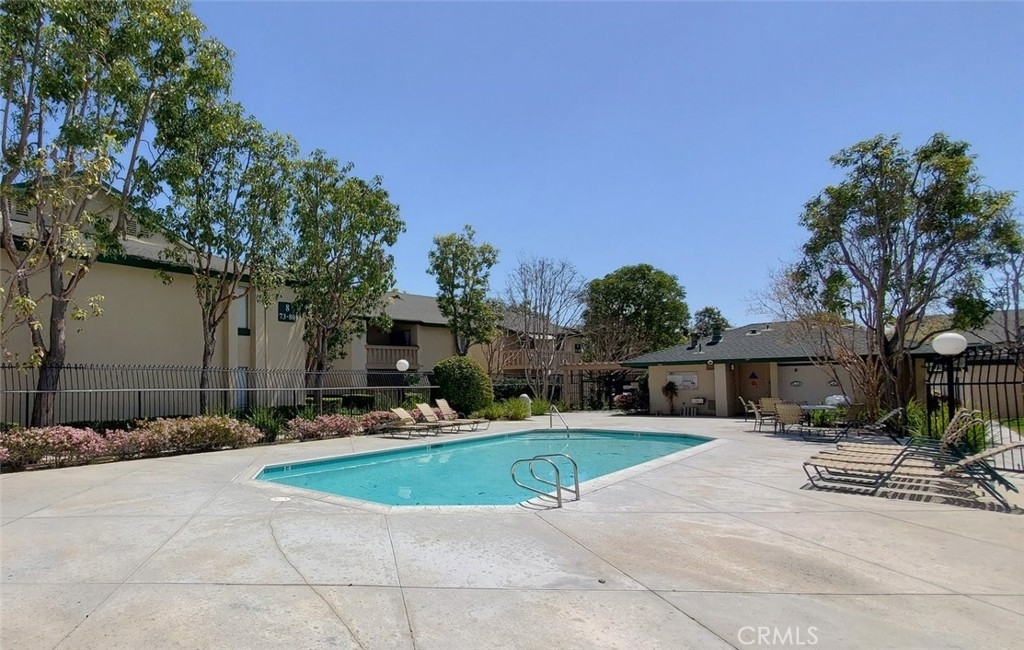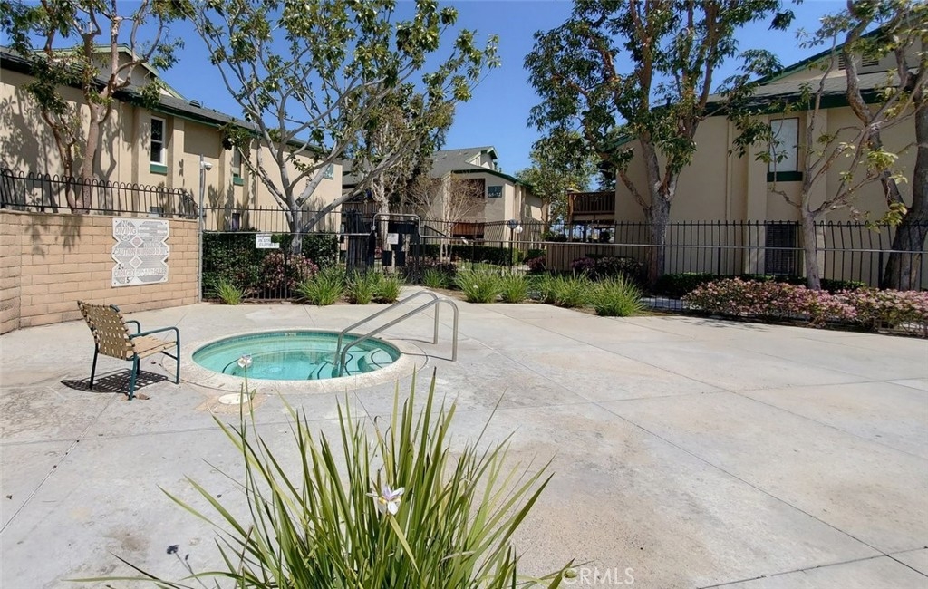 Fully remodeled and updated contemporary living. Bright and spacious 1 bedroom and 1 bathroom upper/end unit condo. This home offers gorgeous newly installed matte porcelain tiles in living room and dining room. New laminate flooring in bedroom. New paint, smooth ceiling with recessed lights, window blinds, and dishwasher. The open concept granite countertops kitchen offers generous breakfast bar, direct view of living room and a separate dining area. Remodeled bathroom includes sliding shower doors, shower in tub, modern vanity and porcelain tiles. Both bedroom and living room have easy sliding doors for direct access to spacious balcony with mountain views. There is also a separate room for washer and dryer. In addition, at this incredible value, you get spacious private 2 car garage and still have more available spaces left for storage. Home is equipped with A/C system and family can stay cool outdoors with community pool. Home is located on the outer edge behind nearby security gate and it offers plenty of privacy. HOA has done an incredible job keeping it well maintained at a low monthly association fee and your water and trash are included! Plenty of parking spaces for guests on premise. It is conveniently located close to Woodbury Park, schools, and major freeways. It is still within reach to own a place called home.