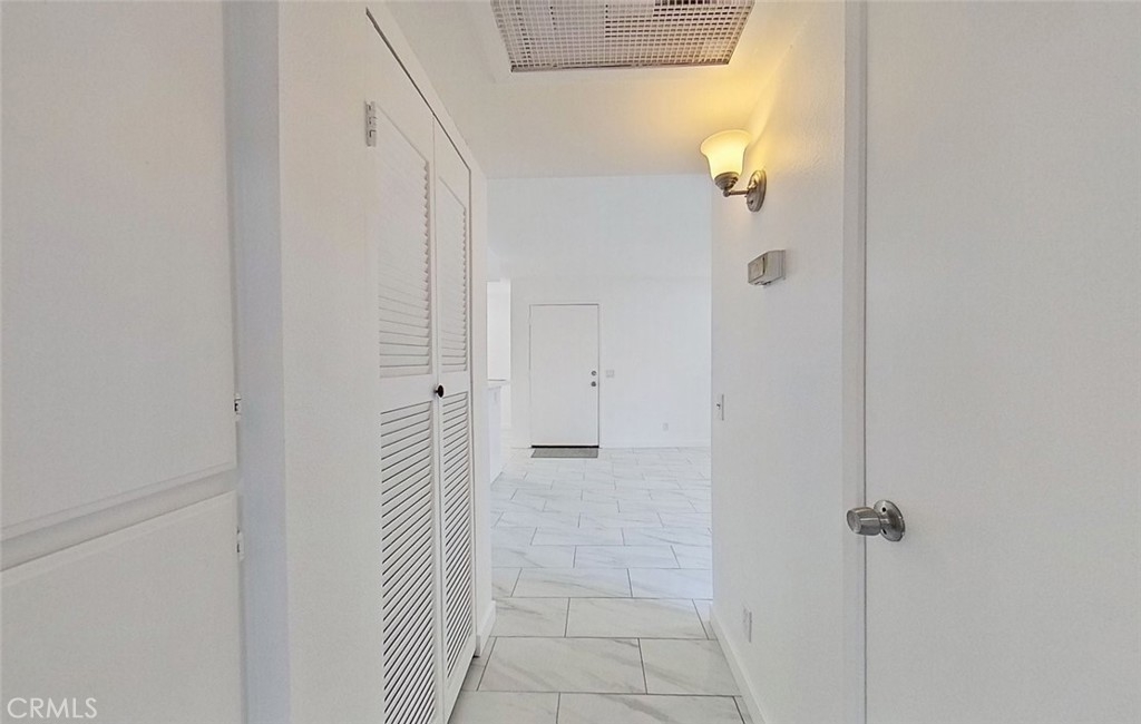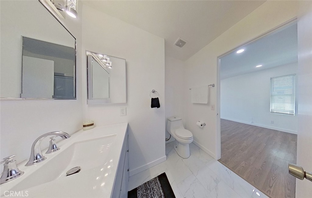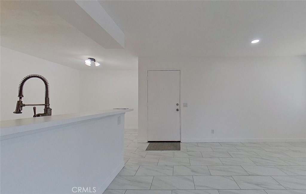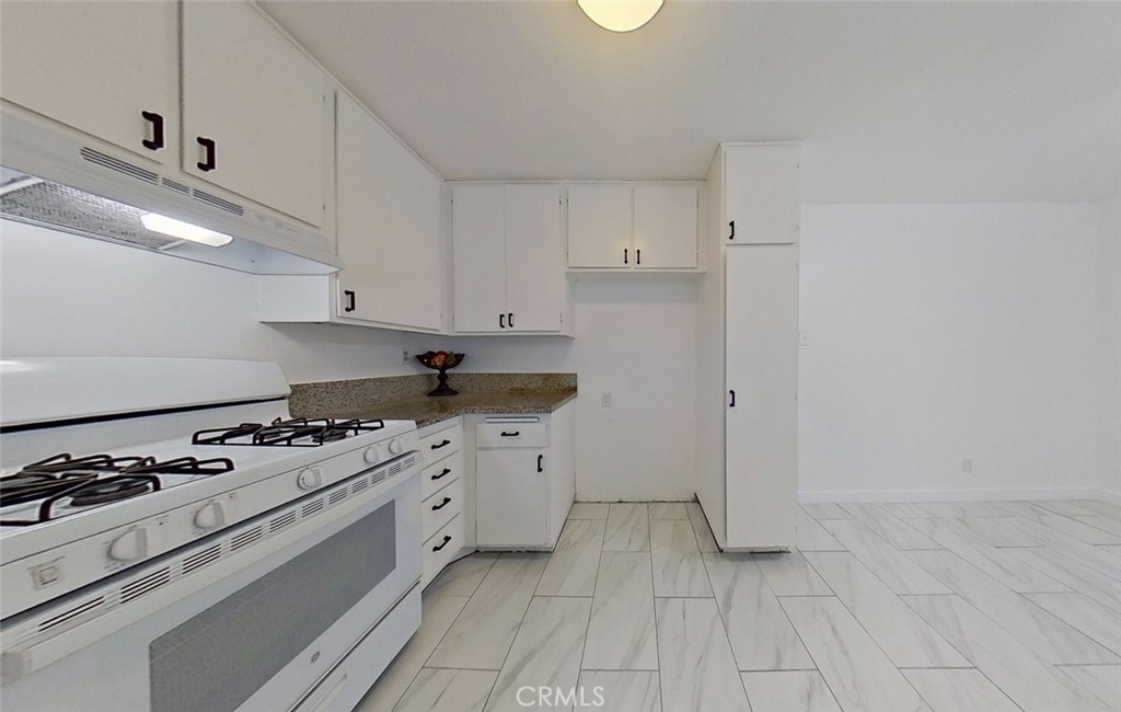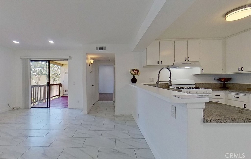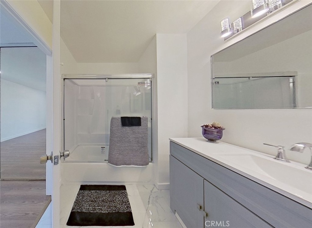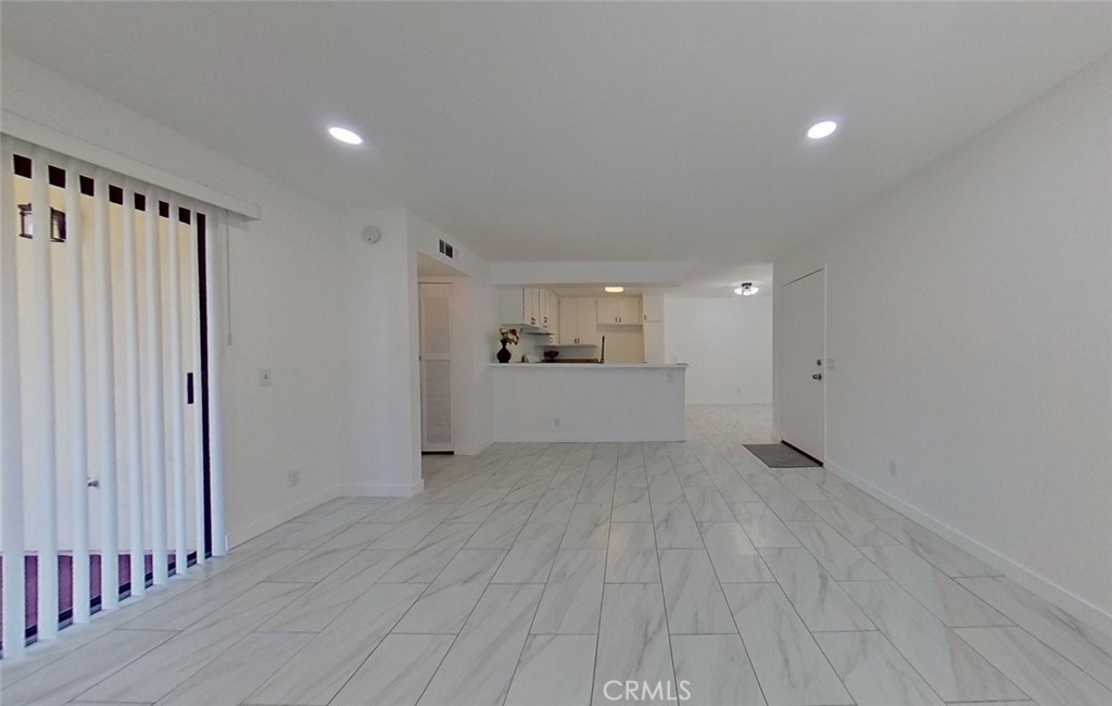 Fully remodeled and updated contemporary living. Bright and spacious 1 bedroom and 1 bathroom upper/end unit condo. This home offers gorgeous newly installed matte porcelain tiles in living room and dining room. New laminate flooring in bedroom. New paint, smooth ceiling with recessed lights, window blinds, and dishwasher. The open concept granite countertops kitchen offers generous breakfast bar, direct view of living room and a separate dining area. Remodeled bathroom includes sliding shower doors, shower in tub, modern vanity and porcelain tiles. Both bedroom and living room have easy sliding doors for direct access to spacious balcony with mountain views. There is also a separate room for washer and dryer. In addition, at this incredible value, you get spacious private 2 car garage and still have more available spaces left for storage. Home is equipped with A/C system and family can stay cool outdoors with community pool. Home is located on the outer edge behind nearby security gate and it offers plenty of privacy. HOA has done an incredible job keeping it well maintained at a low monthly association fee and your water and trash are included! Plenty of parking spaces for guests on premise. It is conveniently located close to Woodbury Park, schools, and major freeways. It is still within reach to own a place called home.