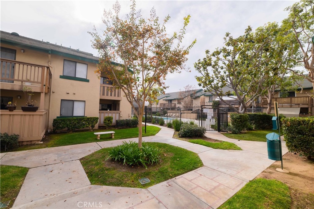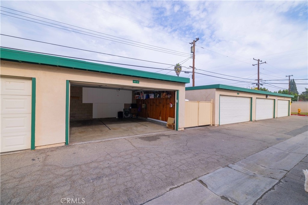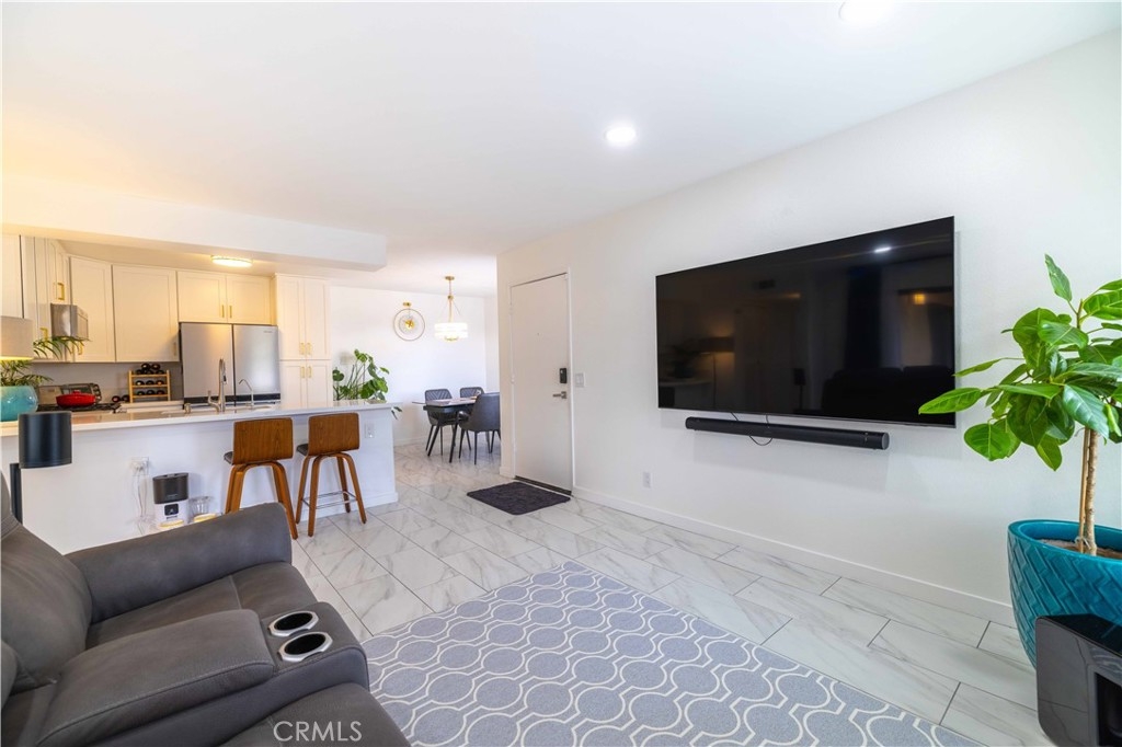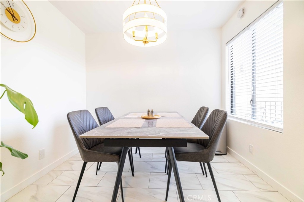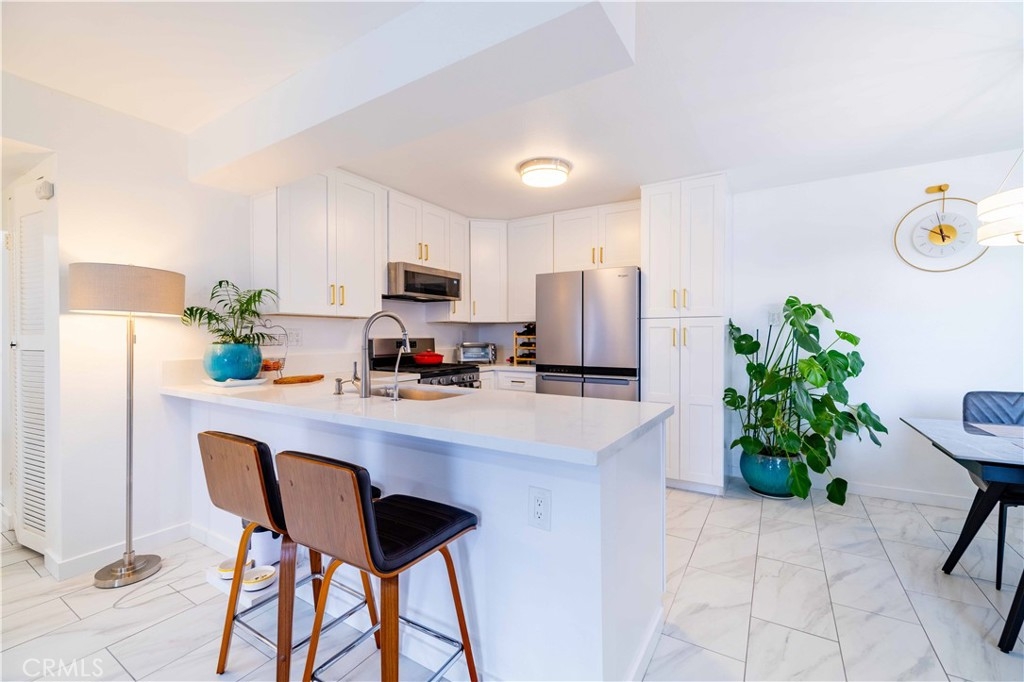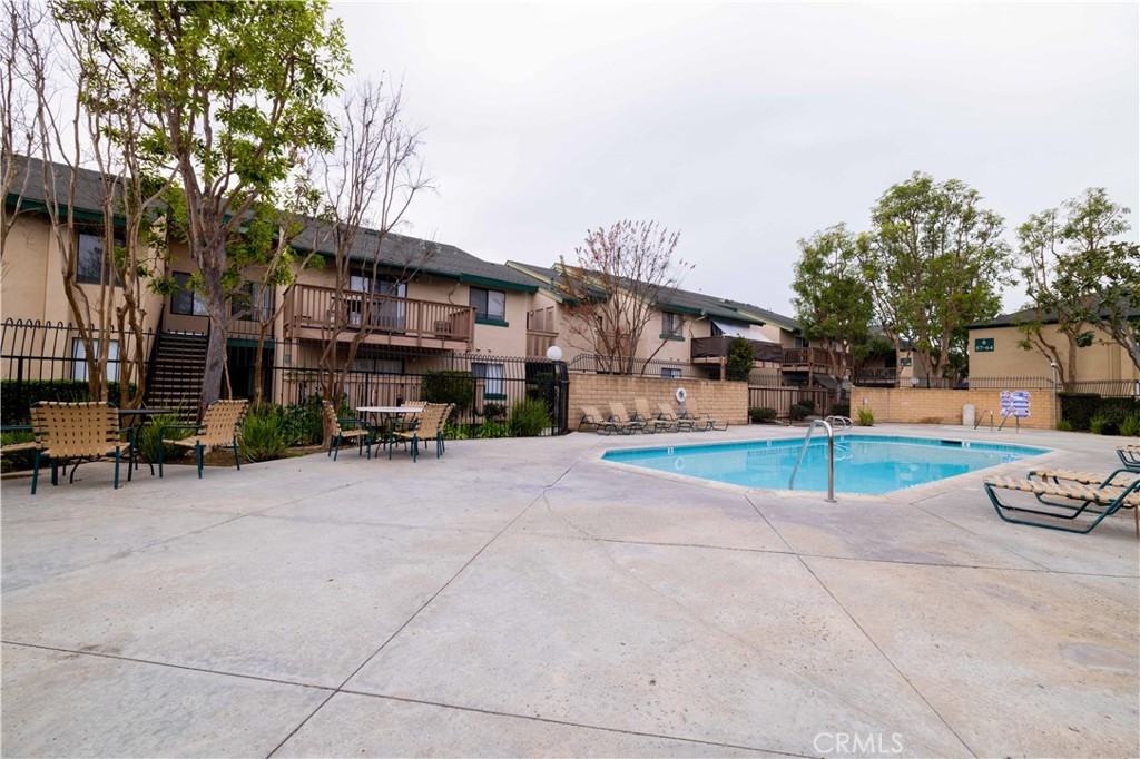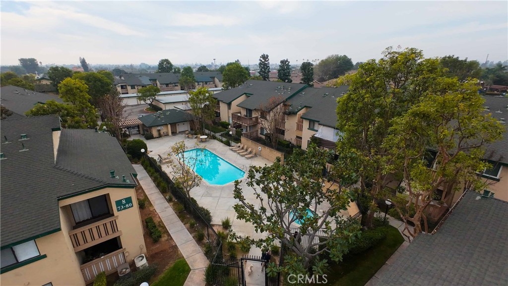 Experience contemporary living in this fully remodeled and updated one-bedroom, one-bathroom upper-end unit condo with no one above you! This bright and spacious home boasts newly installed matte porcelain tiles in the living and dining areas, along with new laminate flooring in the bedroom. Fresh paint, a smooth ceiling adorned with recessed lighting add to the unit's appeal. The open-concept kitchen features stunning granite countertops, newly installed white shaker cabinets with elegant gold hardware, a generous breakfast bar, and smart switches connected to Alexa for added convenience. The clear view of the living room makes it perfect for entertaining, complemented by a separate dining area that enhances the overall space. Retreat to the beautifully remodeled bathroom, which includes sliding shower doors, a shower-in-tub combination, and a sleek modern vanity. Both the bedroom and living room offer sliding doors that lead directly to a spacious balcony. This condo also features a dedicated laundry area for added convenience. You'll appreciate the detached private two-car garage. Stay comfortable year-round with the built-in A/C system, and enjoy access to a community pool for those warm days. Located behind a security gate, this home offers plenty of privacy while still being part of a well-maintained community, thanks to the HOA’s diligent management at a low monthly fee that includes water and trash services. Conveniently situated near the 22 freeway, this condo is within walking distance to the Garden Grove Shopping Center, where you can find an array of dining options and grocery stores, making it an ideal location for both work and play. With ample guest parking and a fantastic community environment, this stunning residence offers incredible value and the opportunity to call it home!