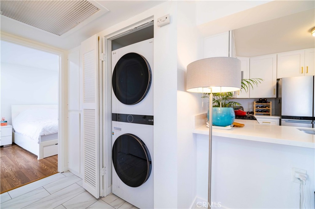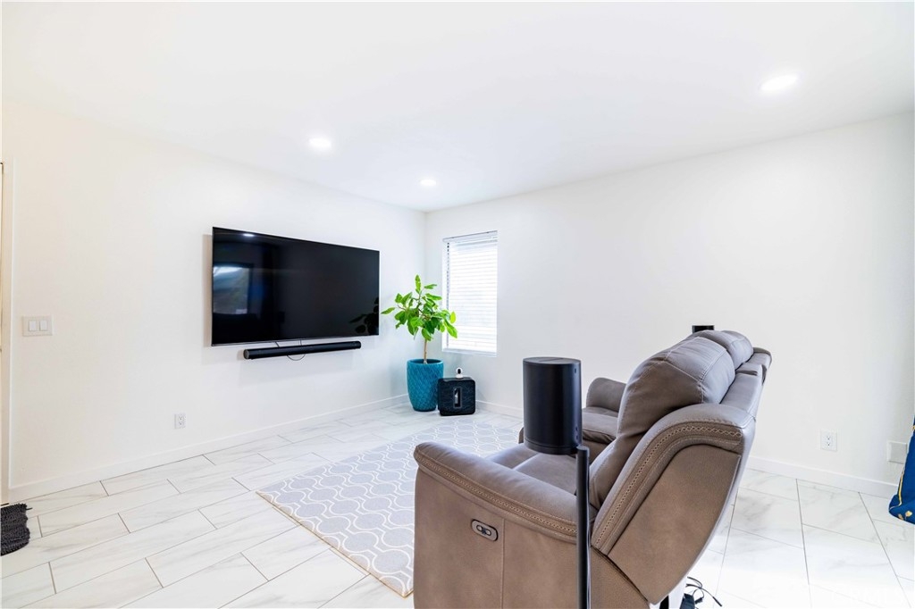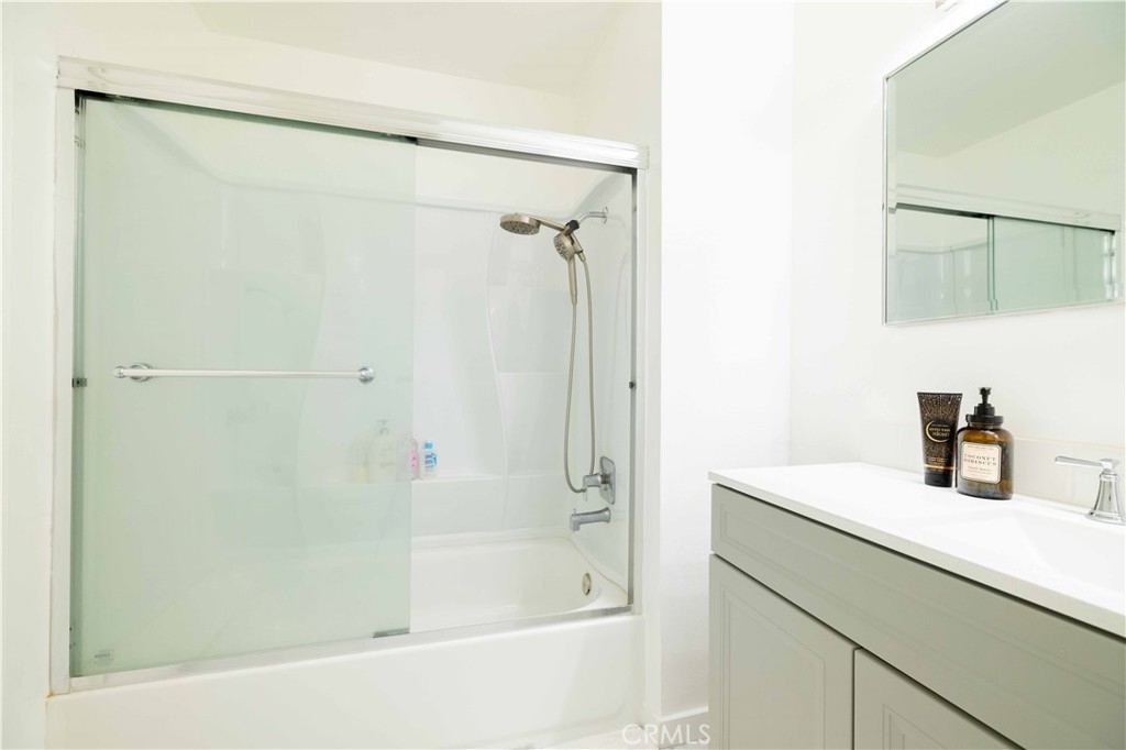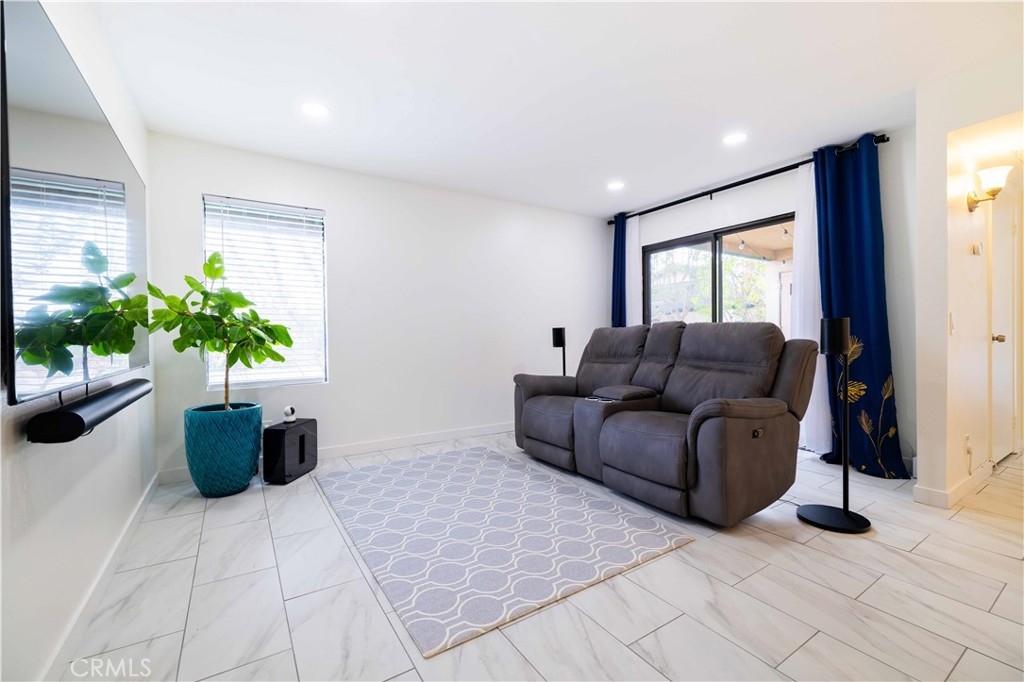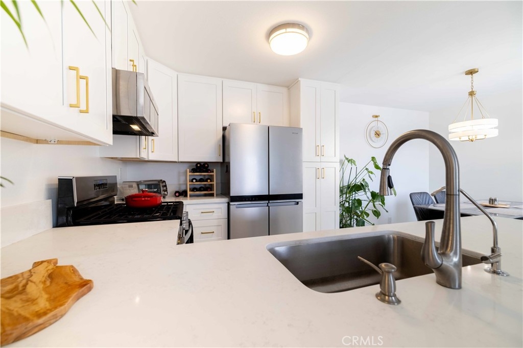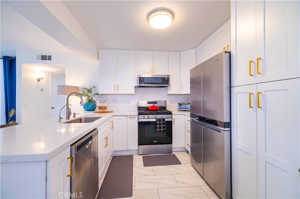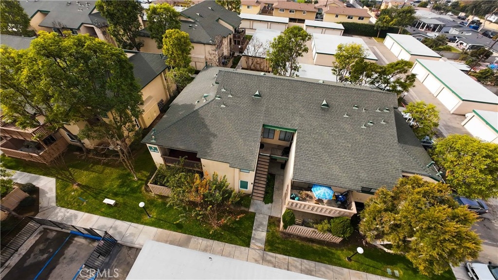 Experience contemporary living in this fully remodeled and updated one-bedroom, one-bathroom upper-end unit condo with no one above you! This bright and spacious home boasts newly installed matte porcelain tiles in the living and dining areas, along with new laminate flooring in the bedroom. Fresh paint, a smooth ceiling adorned with recessed lighting add to the unit's appeal. The open-concept kitchen features stunning granite countertops, newly installed white shaker cabinets with elegant gold hardware, a generous breakfast bar, and smart switches connected to Alexa for added convenience. The clear view of the living room makes it perfect for entertaining, complemented by a separate dining area that enhances the overall space. Retreat to the beautifully remodeled bathroom, which includes sliding shower doors, a shower-in-tub combination, and a sleek modern vanity. Both the bedroom and living room offer sliding doors that lead directly to a spacious balcony. This condo also features a dedicated laundry area for added convenience. You'll appreciate the detached private two-car garage. Stay comfortable year-round with the built-in A/C system, and enjoy access to a community pool for those warm days. Located behind a security gate, this home offers plenty of privacy while still being part of a well-maintained community, thanks to the HOA’s diligent management at a low monthly fee that includes water and trash services. Conveniently situated near the 22 freeway, this condo is within walking distance to the Garden Grove Shopping Center, where you can find an array of dining options and grocery stores, making it an ideal location for both work and play. With ample guest parking and a fantastic community environment, this stunning residence offers incredible value and the opportunity to call it home!