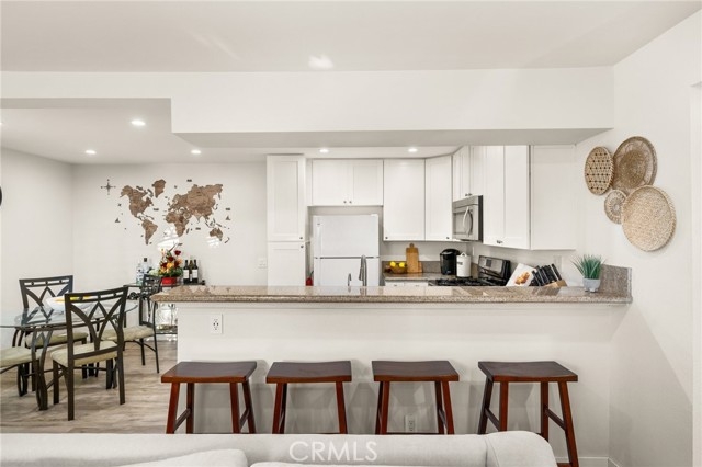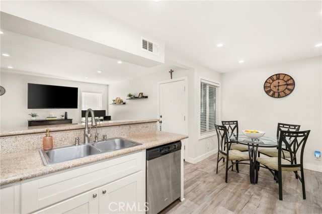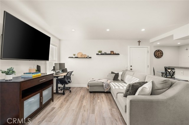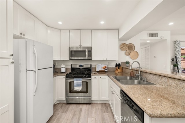 This upgraded ground-level condo offers a harmonious blend of modern luxury and comfort. Step inside to discover elegant vinyl flooring and recessed lighting that enhance the ambiance. The open-concept living area seamlessly merges a spacious living room with a chef's dream kitchen, featuring granite countertops, sleek cabinetry, and top-of-the-line stainless steel appliances. The convenience of an in-unit washer and dryer adds to the ease of living, while the spa-like full bathroom provides a serene retreat. Outside, the expansive patio area invites you to entertain or simply unwind in the fresh air. Nestled within a secure gated community, this condo grants access to beautifully maintained grounds and a newly renovated, sparkling pool. A detached 2-car garage with ample storage space completes this perfect package. Ideally located and brimming with modern amenities, this turnkey condo is ready for you to move in and start creating cherished memories. Don’t miss the chance to call 13801 Shirley St #59 your home!