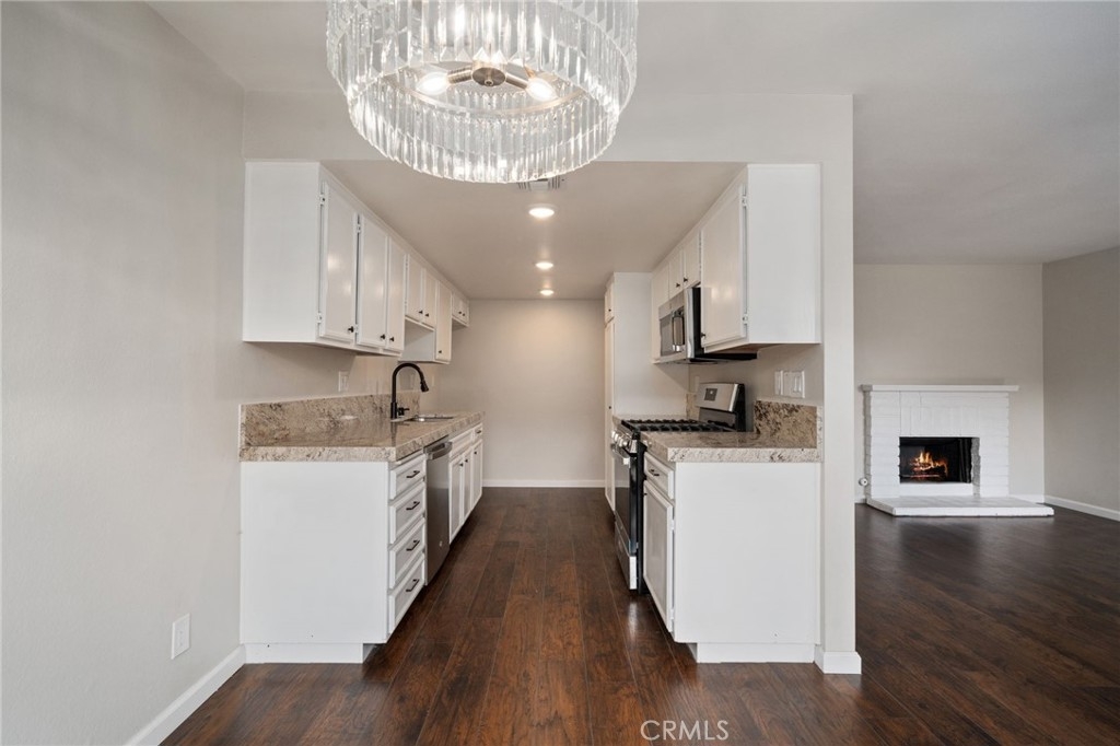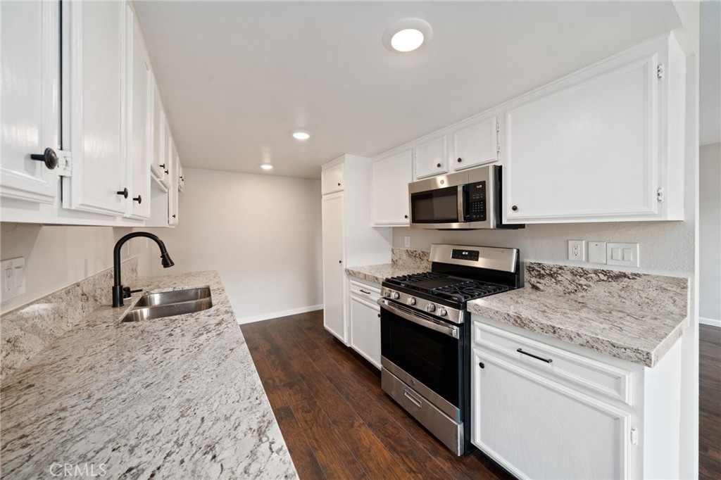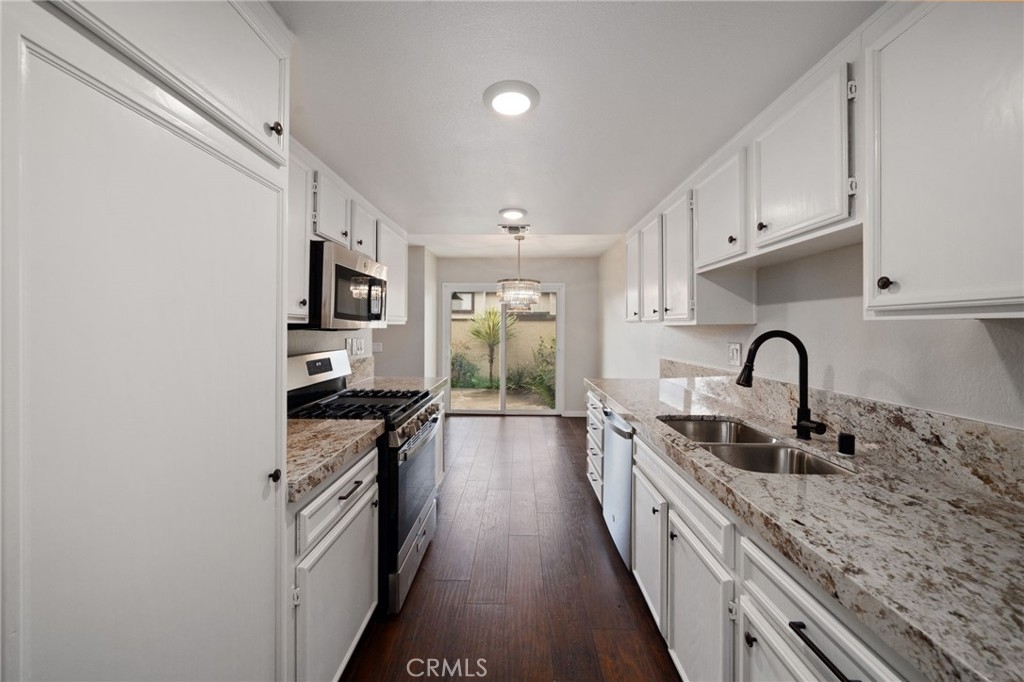 Welcome to this stunning 2-story condo located in a desirable gated community in Garden Grove. This property offers two spacious bedrooms upstairs, making it the perfect home for a growing family or those who need additional space for an office or guest room. As you enter the home, you'll immediately notice the expansive living room, perfect for relaxation or entertaining guests. The open floor plan leads to a beautifully upgraded kitchen with, complete with new countertops, new gas stove and new dishwasher that will inspire your inner chef. Enjoy your morning coffee or a quiet evening on the covered balcony, overlooking the lush greenery of the community. The home features 2.5 bathrooms, including a luxurious master suite with a walk-in closet. For your convenience, The laundry is neatly tucked away in a closet. and spaces two-car garage. The vinyl flooring throughout the home provides both durability and style, and the recessed lighting highlights the home's charm and modern upgrades. Also new carpet on stairway and in both bedrooms and hallway as well as new dining area chandelier. This community has a low HOA, making it an ideal place to call home for those seeking affordability without sacrificing amenities. Take advantage of the perks of this gated community, including guests parking, and enjoy the peace of mind and privacy it offers. Located in a prime location, this condo is just minutes away from Rodeo 39 shopping, dining, and entertainment options, making it the perfect location for those who love the hustle and bustle of city life. This home is perfect for those seeking both comfort and style, with easy access to everything Garden Grove has to offer. This desirable and top-notch unit will not last long, schedule a showing today!
