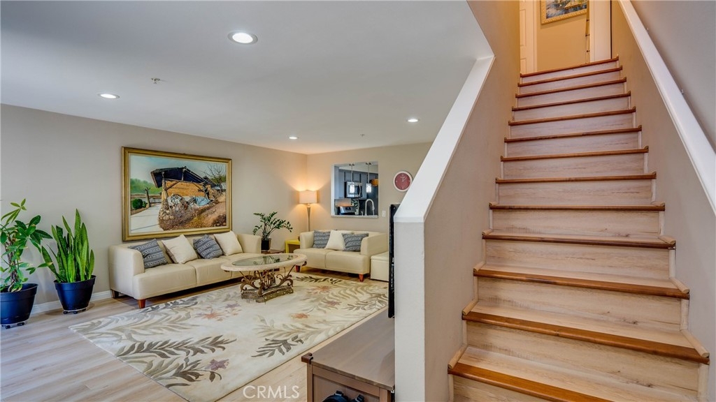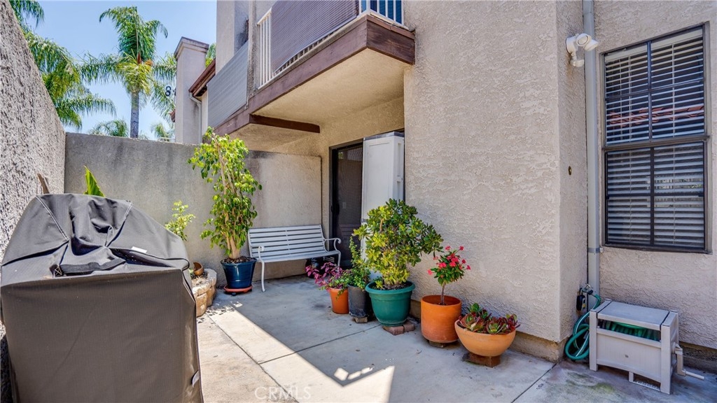 This lovely move-in-ready condo unit offers 3 bedrooms and 2.5 bathrooms. A large open living room with a fireplace opens to the kitchen and leads to an enclosed private patio. The floor, all paint, recessed lightings, and kitchen countertops with backsplash have been updated just a few years ago. High ceiling for all bedrooms upstairs gives a very airy feeling along with big windows and sliding doors. Entrance to the parking garage is very easy and close access from the unit. This association offers safe environment with gated access and an enclosed jacuzzie. Centrally located close to shopping, supermarkets, restaurants, banks medical and central offices. Easy access to 22 &405 FWY. Must see it to believe!!