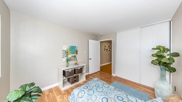 Fabulous two-bedroom and two-bathroom home in the desirable gated community of Spring Garden Villas in Garden Grove. This lower-level condo has an open floor plan with the living, dining, and kitchen area all flowing together. The living room features laminate wood flooring, baseboards, and a large window allowing for natural lighting. The dining area features laminate wood flooring, baseboards, and an updated light fixture, and opens up to the kitchen and living room. The kitchen features granite countertops, lots of cabinets and cupboard space, a dishwasher, and recessed lighting. Down the hallway are the inside washer and dryer hookups for stackable units and the full guest bathroom which features tile flooring, an updated light fixture, a vanity mirror, and shiplap paneling. The master bedroom features laminate wood flooring, baseboards, mirrored closet doors, a linen cupboard, and a cozy private patio. The master bathroom features tile flooring, an updated light fixture, a vanity mirror, and shiplap paneling. This home includes a two-car detached garage within the gated community. There is also an outdoor storage closet next to the entryway. The reasonable HOA dues cover the gated complex, ground maintenance, exterior termite, water, trash, and an association pool and spa. The interior of the home has been recently painted and the water heater was replaced in 2020. All within a short distance of parks, schools, shopping, restaurants, freeways, and more.
