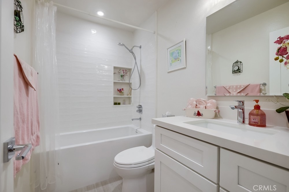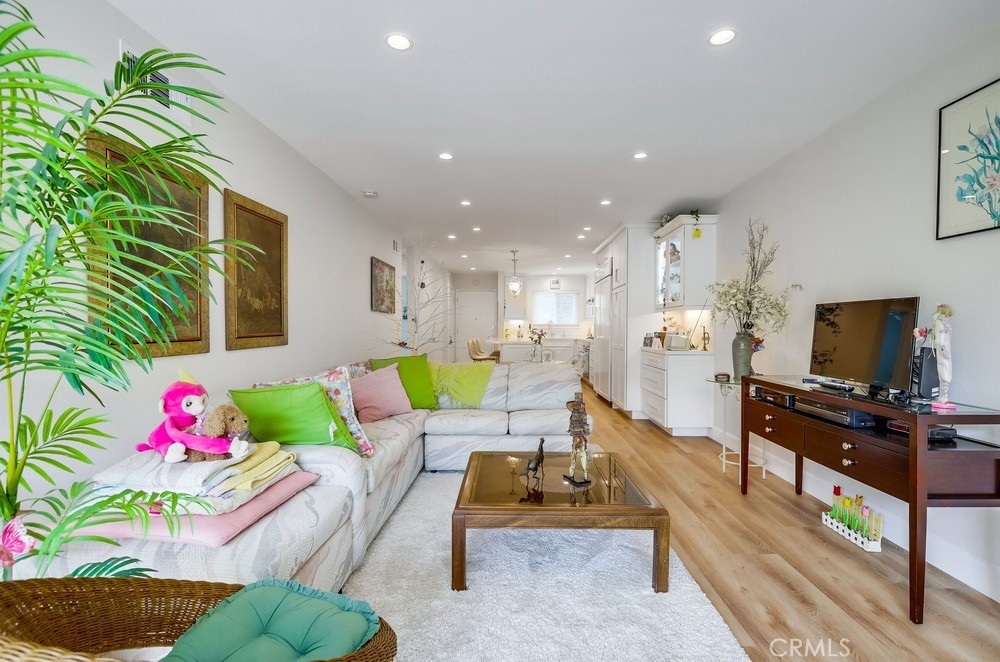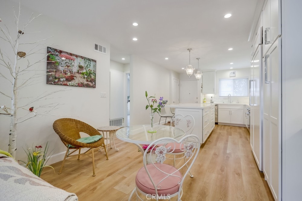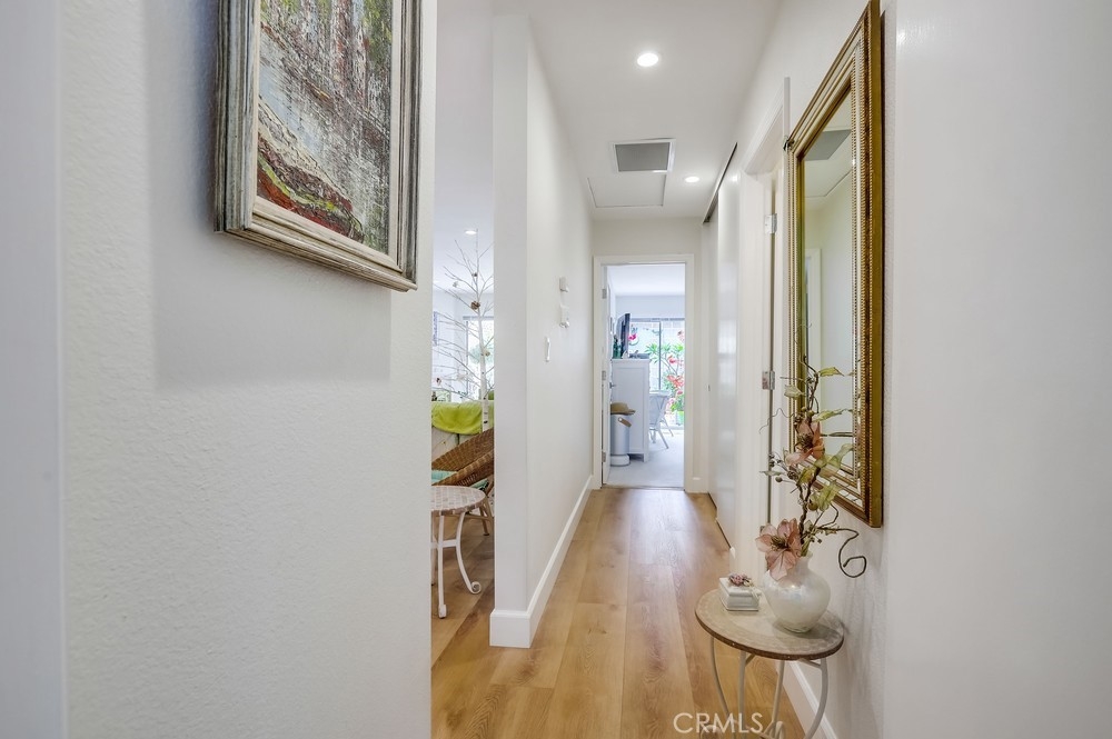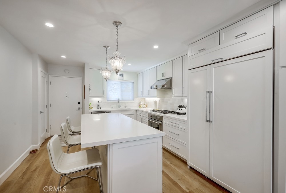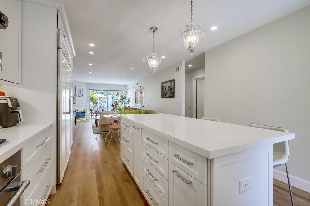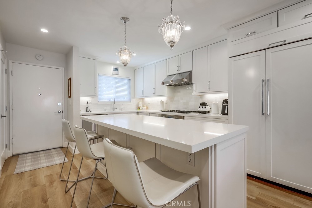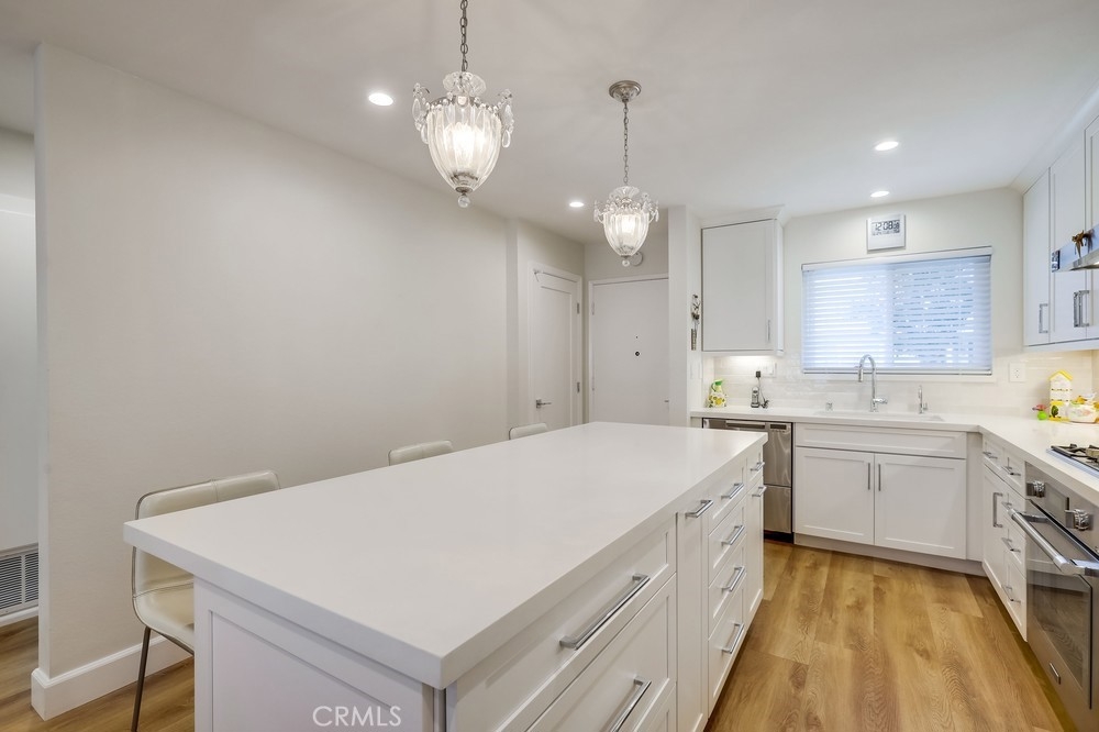 Welcome to this beautifully renovated single-level planned unit development residence in the highly desirable Stonegate community of Eastgate in West Garden Grove. Offering 2 bedrooms and 2 full bathrooms across 1,063 sq ft, this home is packed with designer upgrades and thoughtful finishes throughout. The primary suite features a walk-in closet and primary bathroom, while the living room—with its cozy fireplace—opens to a large private patio adorned with tile flooring and decorative stucco walls, leading directly to a 2-car garage. Renovated in 2022, this home boasts new central air and heat, whole house fan, upgraded attic insulation, dual-pane windows, new window coverings, new interior doors, fresh paint, modern laminate flooring, 6" baseboards, and smooth ceilings. The professionally designed kitchen is a true showstopper: walls were removed to create an open-concept layout with a large island perfect for seating and entertaining. Enjoy top-tier appliances including a Thermador range and oven, Sub-Zero refrigerator with custom panels, Fisher & Paykel two-drawer dishwasher, along with a deep fireclay sink, custom cabinetry with automatic soft-close extra wide drawers, a Rev A Shelf blind corner lazy susan, sheet pan/tray drawer, trash pullout, and a display cabinet—lit by ample recessed lighting, under counter lighting, and surrounded by added outlets for convenience. The hallway bathroom features high-end tiles, a deep fill tub, and an oversized medicine cabinet. Floor to ceiling hallway and bedroom closets add generous storage space. Perfectly positioned on a quiet interior lot. This low-maintenance property sits on a 1,912 sq ft lot and is just a short walk from Vons, the post office, UPS, Walgreens, LA Fitness, Starbucks, bowling alley, the public library, restaurants, and more. Easy freeway access near the 22, 405 and 605 and placement within an excellent school district add to the appeal. Eastgate Park is just a short block away offering swimming lessons, concerts, and 4th of July celebration. Enjoy resort-style amenities including a community pool and spa, tennis courts, and clubhouse. This turnkey gem offers the best of modern living in a prime location—don’t miss your chance to call it home!