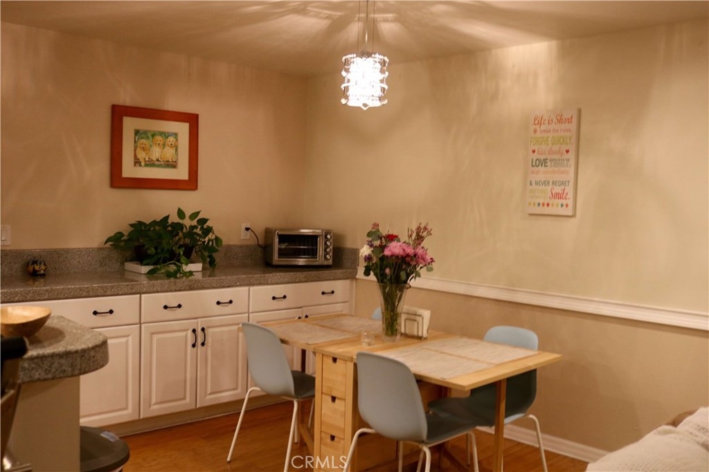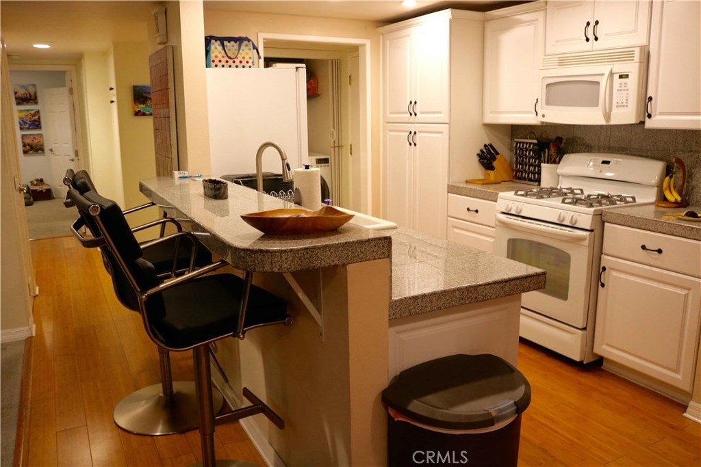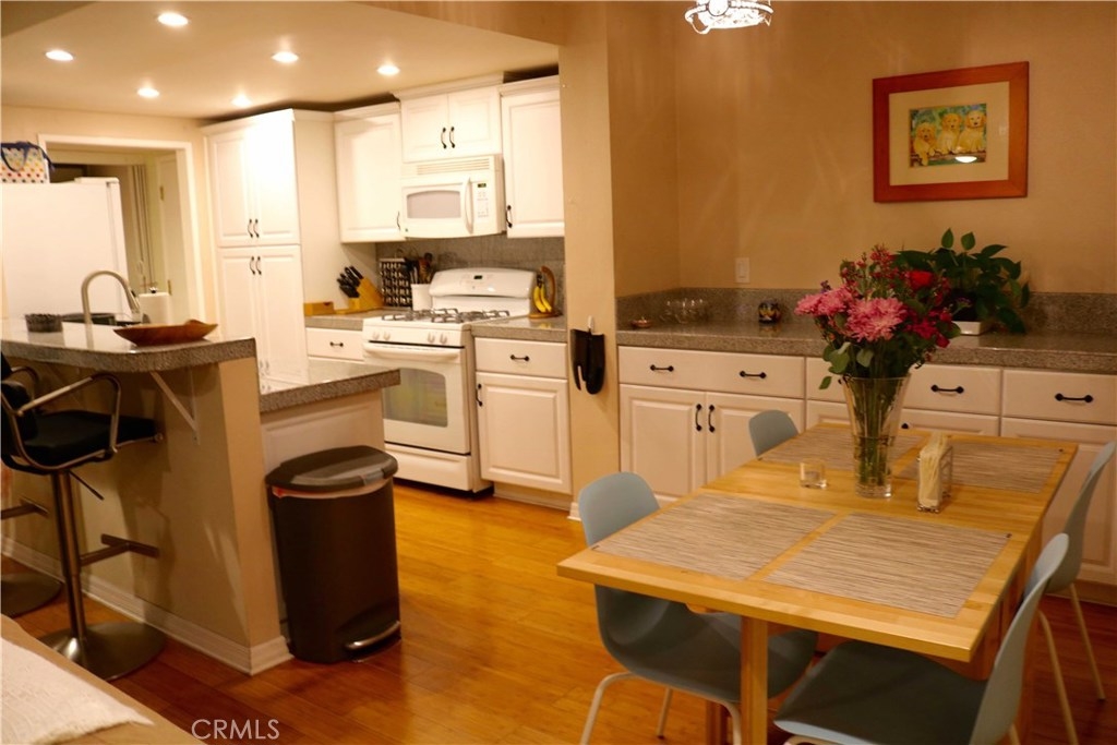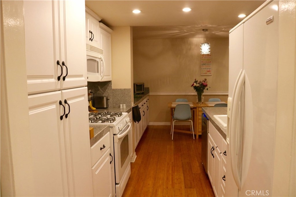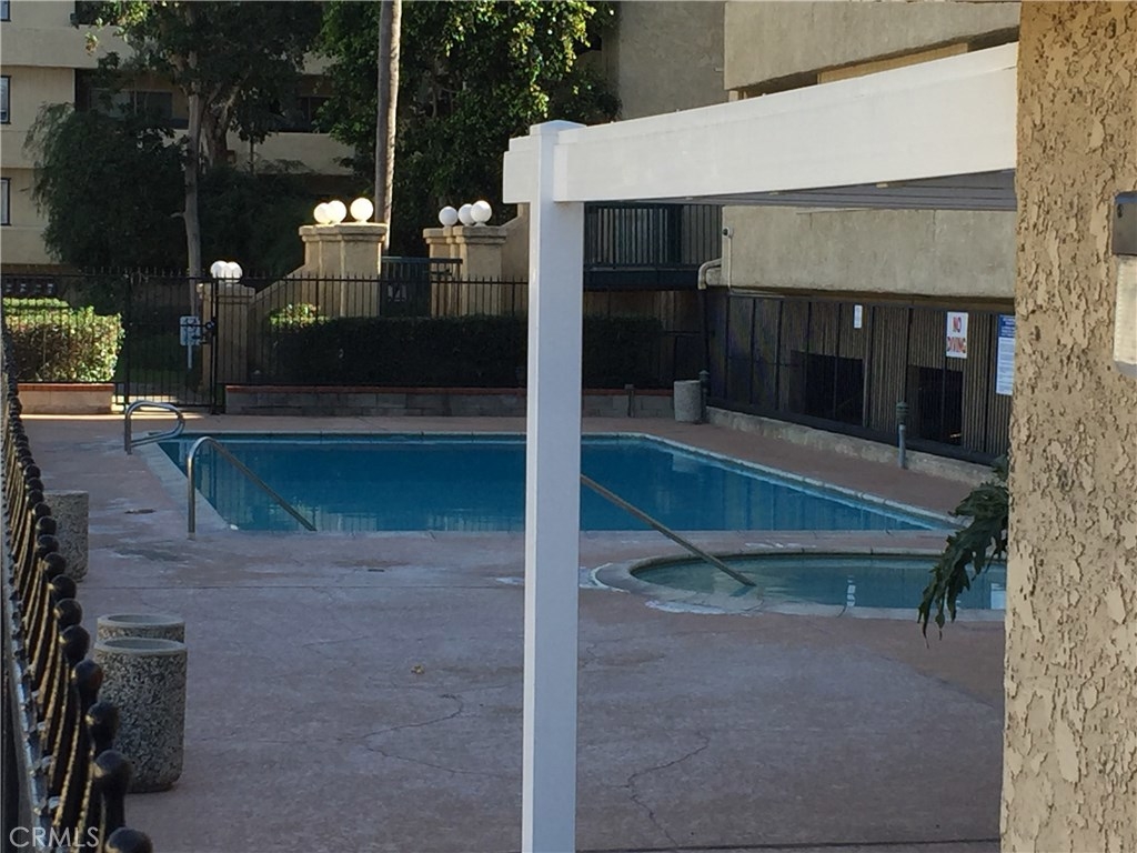 This Highly upgraded Single level Condo is located within the GROVE CONDOMINIUMS. Located in the back of the complex with a private and Sunny South facing Exposure, lots of natural light and 2 balconies. Tons of upgrades include Kitchen with newer cabinets, Granite tile counters, updated appliances, recessed lighting throughout with ceiling fans, scraped ceilings, plus a breakfast bar. Living room has grey berber carpeting, gas fireplace, opening to a patio deck with water heater closet. Master bedroom also has a private deck, built-ins within master closet. Master bath with tile shower and floor. Bedrooms have berber carpeting and kitchen, hall, breakfast nook all with Bamboo Flooring. All 6 panel doors, newer paint throughout. Inside laundry is a great feature. Home includes air conditioning, this unit has one underground assigned parking and one outdoor assigned parking. This property is directly across from large park for animals or children and within walking distance to many shops and restaurants. Association pool and spa for your enjoyment.