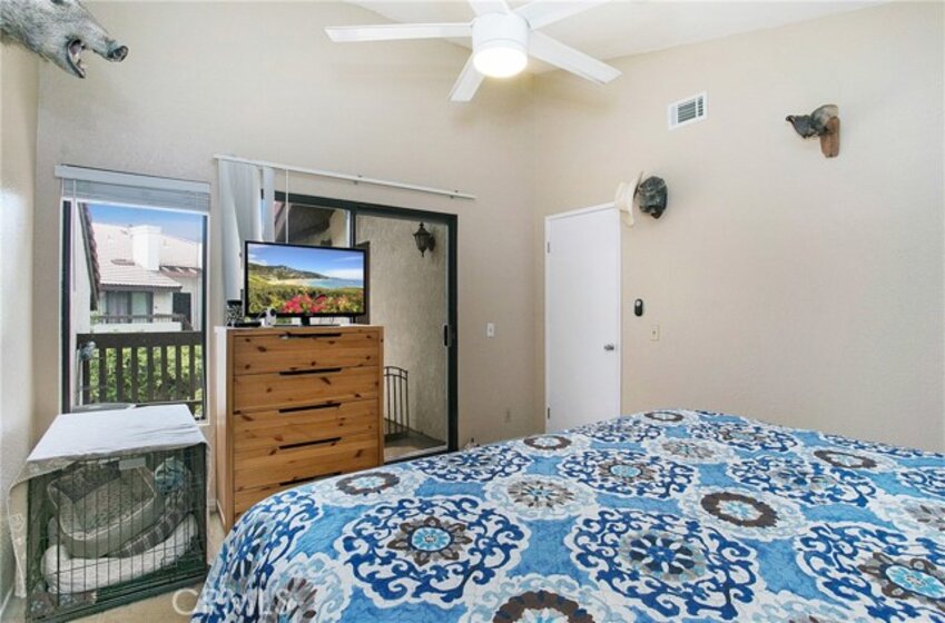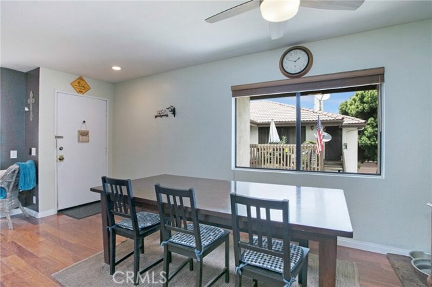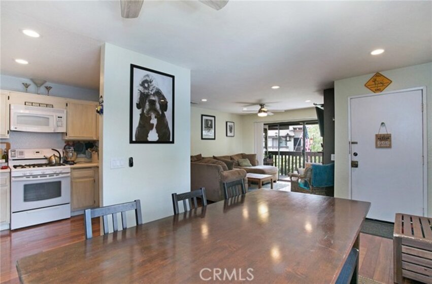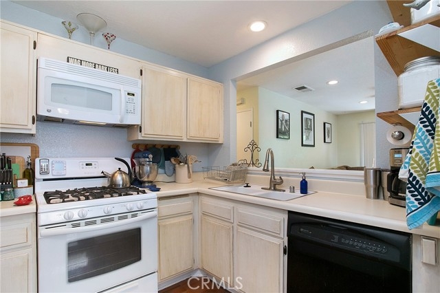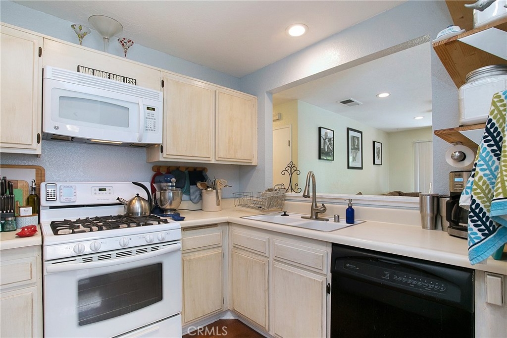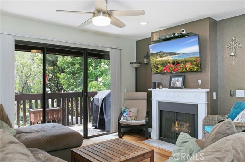 Highly desirable upstairs End-Unit in a Serene, Peaceful and Gorgeous Gated Community! Rare double balconies allow for fresh breezes and excellent natural lighting. Gas Fireplace, inside laundry closet will fit full size washer & dryer / gas hookups. Central air conditioning, whole house fan in attic and low energy Hydronic heater. Remote controlled ceiling fans in every room. Newer 5 burner gas range, convection oven, GFI outlets, built in microwave and dishwasher. Dimmable recessed lighting in living room, newer baseboards and waterproof laminate flooring in master bath. Master bath has dual sinks and a large walk-in closet with custom closet organizers and additional attic storage directly above closet. Extra storage closet on balcony overlooking the pond. Wood floors in kitchen/living/dining room and new epoxy floor coating on balconies. This end unit is ideally situated adjacent to its oversized 2 car enclosed garage with 10-foot ceilings. Garage has custom built in storage cabinets, built in shelving and a ready to go work/arts/crafts station. A must see to admire the space and what it has to offer. Situated in a beautiful complex surrounded by trees and creeks throughout giving you a sense of relaxation and peace. Complex community offers a refreshing pool, spa, tennis courts and a club house for your enjoyment. Association covers water & trash. Conveniently close to freeways (22, 405, 5 and 605) and shopping. Secure gated entry into the community with guest parking. This Move in Ready home is priced to sell As-IS so you can add your own personal touches.